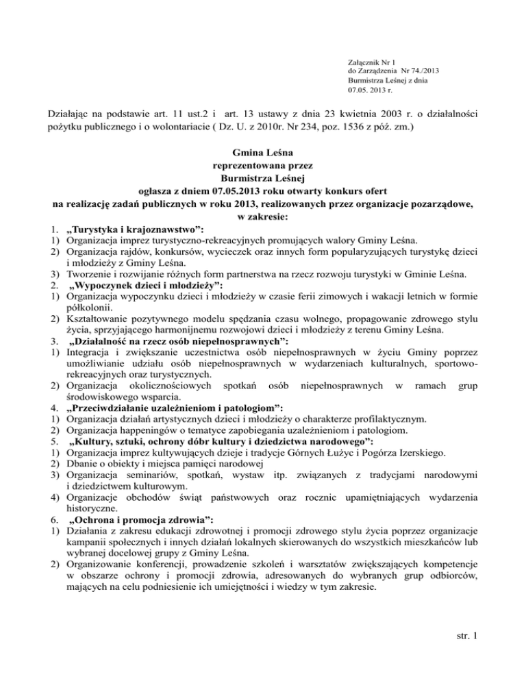 Załącznik Nr 1 do Zarządzenia Nr 74./2013 Burmistrza Leśnej z dnia 07.05. 2013 r. Działając na podstawie art. 11 ust.2 i art. 13 ustawy z dnia 23 kwietnia 2003 r. o działalności pożytku publicznego i o wolontariacie ( Dz. U. z 2010r. Nr 234, poz. 1536 z póź. zm.) Gmina Leśna reprezentowana przez Burmistrza Leśnej ogłasza z dniem 07.05.2013 roku otwarty konkurs ofert na realizację zadań publicznych w roku 2013, realizowanych przez organizacje pozarządowe, w zakresie: 1. „Turystyka i krajoznawstwo”: 1) Organizacja imprez turystyczno-rekreacyjnych promujących walory Gminy Leśna. 2) Organizacja rajdów, konkursów, wycieczek oraz innych form popularyzujących turystykę dzieci i młodzieży z Gminy Leśna. 3) Tworzenie i rozwijanie różnych form partnerstwa na rzecz rozwoju turystyki w Gminie Leśna. 2. „Wypoczynek dzieci i młodzieży”: 1) Organizacja wypoczynku dzieci i młodzieży w czasie ferii zimowych i wakacji letnich w formie półkolonii. 2) Kształtowanie pozytywnego modelu spędzania czasu wolnego, propagowanie zdrowego stylu życia, sprzyjającego harmonijnemu rozwojowi dzieci i młodzieży z terenu Gminy Leśna. 3. „Działalność na rzecz osób niepełnosprawnych”: 1) Integracja i zwiększanie uczestnictwa osób niepełnosprawnych w życiu Gminy poprzez umożliwianie udziału osób niepełnosprawnych w wydarzeniach kulturalnych, sportoworekreacyjnych oraz turystycznych. 2) Organizacja okolicznościowych spotkań osób niepełnosprawnych w ramach grup środowiskowego wsparcia. 4. „Przeciwdziałanie uzależnieniom i patologiom”: 1) Organizacja działań artystycznych dzieci i młodzieży o charakterze profilaktycznym. 2) Organizacja happeningów o tematyce zapobiegania uzależnieniom i patologiom. 5. „Kultury, sztuki, ochrony dóbr kultury i dziedzictwa narodowego”: 1) Organizacja imprez kultywujących dzieje i tradycje Górnych Łużyc i Pogórza Izerskiego. 2) Dbanie o obiekty i miejsca pamięci narodowej 3) Organizacja seminariów, spotkań, wystaw itp. związanych z tradycjami narodowymi i dziedzictwem kulturowym. 4) Organizacje obchodów świąt państwowych oraz rocznic upamiętniających wydarzenia historyczne. 6. „Ochrona i promocja zdrowia”: 1) Działania z zakresu edukacji zdrowotnej i promocji zdrowego stylu życia poprzez organizacje kampanii społecznych i innych działań lokalnych skierowanych do wszystkich mieszkańców lub wybranej docelowej grupy z Gminy Leśna. 2) Organizowanie konferencji, prowadzenie szkoleń i warsztatów zwiększających kompetencje w obszarze ochrony i promocji zdrowia, adresowanych do wybranych grup odbiorców, mających na celu podniesienie ich umiejętności i wiedzy w tym zakresie. str. 1 I. ADRESACI KONKURSU. Konkurs skierowany jest do organizacji pozarządowych zgodnie z art. 3 ust. 2 i 3 ustawy z dnia 24 kwietnia 2003 roku o działalności pożytku publicznego i o wolontariacie (Dz. U. z 2010 r. Nr 234, poz. 1536 ze zm.) zwanych w dalszej części ogłoszenia konkursowego „oferentem”. II. FORMY REALIZACJI ZADAŃ. 1. W przypadku wyboru oferty, realizacja zadania nastąpi w formie wsparcia wykonania zadania przez Gminę Leśna. 2. Konkurs ma na celu wyłonienie i dofinansowanie projektów realizowanych na rzecz społeczności Gminy Leśna. III. WYSOKOŚĆ ŚRODKÓW PUBLICZNYCH PRZEZNACZONYCH NA REALIZACJĘ ZADAŃ PUBLICZNYCH. Wysokość środków publicznych Rok 2012 Rok 2013 przeznaczonych na realizacje zadań publicznych z zakresu wspierania i upowszechniania 44 406,00zł 32 900,00zł kultury fizycznej IV. TERMIN I MIEJSCE REALIZACJI ZADAŃ. 1. Termin realizacji zadań objętych konkursem rozpocznie się nie wcześniej niż 24 czerwca 2013 roku, a zakończy nie później niż 30 listopada 2013 roku. 2. Zadanie powinno być realizowane z najwyższą starannością zgodnie z zawartą umową oraz obowiązującymi standardami i przepisami prawa. 3. Czas realizacji powinien obejmować: okres przygotowania, przeprowadzenia zadania. Należy w nim uwzględnić czas na dokonanie płatności za faktury dotyczące realizacji zadania. 4. Miejscem realizacji zadań jest Gmina Leśna (nie dotyczy uczestnictwa w rajdach, wycieczkach, szkoleniach, wydarzeniach kulturalnych) V. WARUNKI REALIZACJI ZADANIA. 1. Podmioty uprawnione do udziału w postępowaniu konkursowym, składają pisemne oferty realizacji zadania wg wzoru określonego w Rozporządzeniu Ministra Pracy i Polityki Społecznej z dnia 15 grudnia 2010 r. w sprawie wzoru oferty i ramowego wzoru umowy dotyczących realizacji zadania publicznego oraz wzoru sprawozdania z wykonania tego zadania (Dz. U. z 2011, nr 6 poz. 25). 2. Zatwierdzone, przez Burmistrza Leśnej, protokoły w sprawie wyboru i dofinansowania oferty są podstawą do zawarcia umowy z oferentem. 3. Umowa dotacyjna określa zakres i warunki realizacji zadania publicznego. 4. W przypadku udzielenia dotacji w kwocie niższej niż wnioskowana, oferent w dalszym ciągu jest zobowiązany do osiągnięcia zakładanego celu, określonego w ofercie lub może odstąpić od podpisania umowy. W przypadku odstąpienia od umowy oferent ma obowiązek pisemnie powiadomić Zleceniodawcę zadania o swojej decyzji. 5. W przypadku wsparcia zadania oferent ma obowiązek wniesienia wkładu własnego w wysokości co najmniej 20% całkowitego kosztu zadania. Wkład własny – to środki str. 2 własne oferenta, pozyskane przez niego ze źródeł innych niż budżet Gminy Leśna, praca społeczna członków organizacji i praca wolontariuszy. 6. Oferent przystępujący do zawarcia umowy powinien przedstawić: 1) zaktualizowany harmonogram realizacji zadania publicznego podpisany przez osoby upoważnione (o ile nastąpiły zmiany w stosunku do złożonej oferty) – 1 egzemplarz; 2) zaktualizowany kosztorys realizacji zadania publicznego podpisany przez osoby upoważnione, zgodny z ostateczną kwotą przyznanej dotacji, z zachowaniem udziału procentowego środków własnych i środków dotacji z budżetu