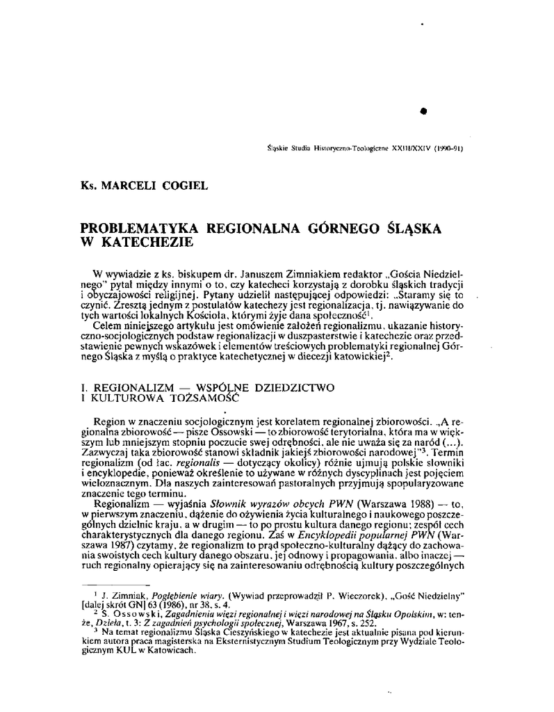Celem niniejszego artykułu jest omówienie założeń regionalizmu, ukazanie historyczno-socjologicznych podstaw regionalizacji w duszpasterstwie i katechezie oraz przedstawienie pewnych wskazówek i elementów treściowych problematyki regionalnej Górnego Śląska z myślą o praktyce katechetycznej w diecezji katowickiej 2 .