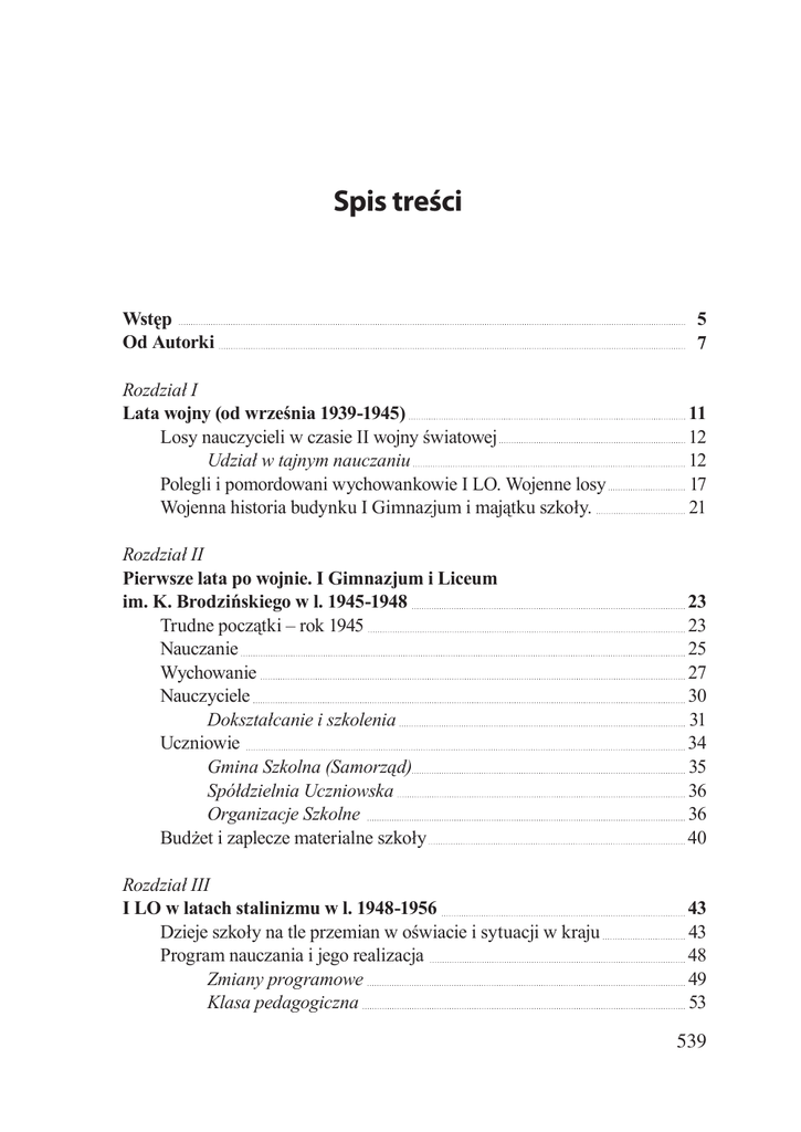 Spis treści Wstęp Od Autorki 5 7 Rozdział I Lata wojny (od września 1939-1945) Losy nauczycieli w czasie II wojny światowej Udział w tajnym nauczaniu Polegli i pomordowani wychowankowie I LO. Wojenne losy Wojenna historia budynku I Gimnazjum i majątku szkoły. 11 12 12 17 21 Rozdział II Pierwsze lata po wojnie. I Gimnazjum i Liceum im. K. Brodzińskiego w l. 1945-1948 Trudne początki – rok 1945 Nauczanie Wychowanie Nauczyciele Dokształcanie i szkolenia Uczniowie Gmina Szkolna (Samorząd) Spółdzielnia Uczniowska Organizacje Szkolne Budżet i zaplecze materialne szkoły 23 23 25 27 30 31 34 35 36 36 40 Rozdział III I LO w latach stalinizmu w l. 1948-1956 Dzieje szkoły na tle przemian w oświacie i sytuacji w kraju Program nauczania i jego realizacja Zmiany programowe Klasa pedagogiczna 43 43 48 49 53 539 Matury Olimpiady Wychowanie Plany wychowawcze w szkole Kwestia dyscypliny Inne działania wychowawcze Uroczystości i imprezy szkolne Przedstawienia teatralne i inne występy artystyczne Nauczyciele Szkolenia i ideologizacja nauczycieli ZNP i POP PZPR POP Uczniowie Organizacje młodzieżowe w szkole 540 54 54 55 56 57 58 60 62 63 65 67 68 68 71 Rozdział IV I LO w okresie odchodzenia od stalinizmu i wczesnych rządów Gomułki w l. 1957-1962 Zarys historii I LO na tle sytuacji w kraju Z historii szkoły Nauczanie Realizacja programu Olimpiady Wychowanie Nauczyciele Szkolenia Organizacje nauczycielskie Życie towarzyskie Uczniowie Rada Uczniowska Organizacje uczniowskie Koła zainteresowań Rodzice i Komitet Rodzicielski Baza i zaplecze materialne 77 77 79 87 88 89 90 91 93 93 94 94 96 96 99 102 103 Rozdział V Lata 1962-1970. Szkoła w dobie „siermiężnego socjalizmu“ Zmiany w szkolnictwie – okres nowej reformy 105 105 Dzieje szkoły na tle wydarzeń politycznych w Polsce Wychowanie Dyscyplina Nauczanie Nauczyciele Kadra Szkolenia i organizacje nauczycielskie Rodzice Komitet Rodzicielski Zespół partyjny rodziców Komitet Opiekuńczy Uniwersytet dla Rodziców Koło Towarzystwa Szkoły Świeckiej Uczniowie Opieka lekarska Rada Uczniowska (Samorząd Szkolny) Organizacje uczniowskie Koła zainteresowań Baza materialna 106 110 112 114 116 117 121 125 125 127 127 128 130 131 133 134 136 143 150 Rozdział VI I LO w latach 1971-1980 (Dekada Gierka) Rys dziejów I LO na tle przemian w kraju Nauczanie Matury i nabór na studia Ruch olimpijski Wychowanie Ideał wychowawczy Program wychowania Ceremoniał szkolny i uroczystości Kwestie dyscypliny Nauczyciele Kadra Dokształcanie i szkolenia Wzajemne relacje i towarzyskie stosunki w gronie PZPR i ZNP Uczniowie Opieka zdrowotna Samorząd (Rada Uczniowska) 151 151 169 170 170 172 172 173 175 180 181 182 184 186 187 188 190 190 541 Organizacje młodzieżowe Zaplecze materialne Rozdział VII I LO w latach 1980-1989 (Między pierwszą a drugą Solidarnością) Rys dziejów I LO latach 1980-1989 na tle przemian w kraju Nauczanie Wychowanie Ceremoniał i uroczystości szkolne Inne Dyscyplina Nauczyciele Kadra Atmosfera pracy i wzajemne stosunki Organizacje nauczycieli Dokształcanie Uczniowie Samorząd Spółdzielnia uczniowska ZHP Szkolne Koło PTTK PTSM LOP TPPR LOK ZMD ZSMP KMR TKKŚ Młodzieżowe Koło Ligi Kobiet Polskich PCK OHP SKS Koła zainteresowań Baza materialna szkoły 542 192 201 203 203 220 221 222 223 227 227 227 231 233 234 235 236 238 239 241 242 243 243 244 244 244 245 245 246 246 246 247 247 248 Rozdział VIII I LO w latach 1989-2000 I LO w trudnym okresie przemian Zmiany w polskim systemie oświaty I LO w okresie przemian 1989/1990 – 1990/1991 Sprawa wyboru dyrektora I LO w okresie nowej reformy Przed kolejną reformą Programy nauczania i ich realizacja Realizacja programów nauczania Komisje przedmiotowe Poziom nauczania Ocena wyników nauczania Wychowanie Cele i Program wychowania Dyscyplina Uroczystości szkolne i państwowe Wychowanie przez teatr i dla teatru Nauczyciele Kadra Organizacje Nauczycielskie Dokształcanie Uczniowie Opieka medyczna Samorząd Koła Naukowe Organizacje uczniowskie Baza materialna szkoły 249 249 249 251 255 261 265 273 277 277 279 279 281 281 286 288 298 298 300 304 306 307 310 311 313 318 326 Teresa Kopczyńska 440-lecie szkolnictwa tarnowskiego i I Liceum Ogólnokształcącego 327 Aneks 1 Wykaz osób zatrudnionych w I LO w latach 1945-2000 Dyrektorzy I LO Nauczyciele Pracownicy administracji Pracownicy obsługi 353 353 357 399 399 543 Aneks 2 Absolwenci I Liceum im. K. Brodzińskiego w Tarnowie 401 Aneks 3 Wychowankowie I Gimnazjum, którzy polegli w czasie walk II wojny światowej 511 Aneks 4 Profesorowie i wychowankowie, którzy zginęli w obozie koncentracyjnym w Oświęcimiu 513 Aneks 5 Uczniowie, którzy otrzymali medal Semper Primus 517 Aneks 6 Wykaz olimpijczyków z ILO w latach 1952-2000 519 Bibliografia 525 Wykaz skrótów 529 Indeks nazwisk 531