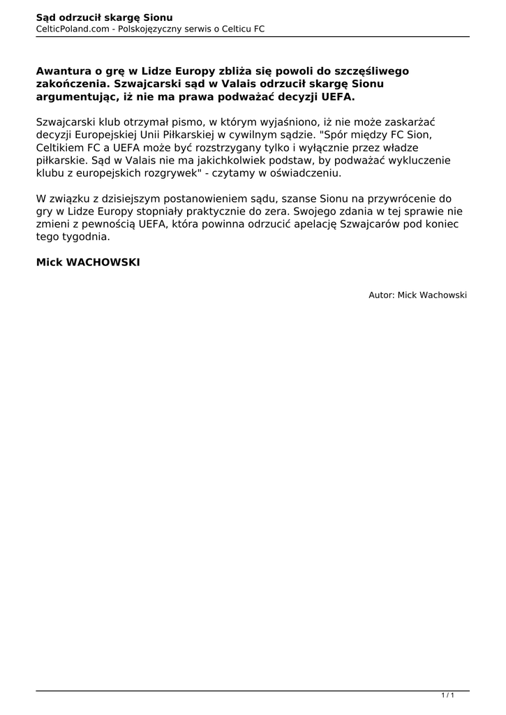 Sąd odrzucił skargę Sionu CelticPoland.com - Polskojęzyczny serwis o Celticu FC Awantura o grę w Lidze Europy zbliża się powoli do szczęśliwego zakończenia. Szwajcarski sąd w Valais odrzucił skargę Sionu argumentując, iż nie ma prawa podważać decyzji UEFA. Szwajcarski klub otrzymał pismo, w którym wyjaśniono, iż nie może zaskarżać decyzji Europejskiej Unii Piłkarskiej w cywilnym sądzie. "Spór między FC Sion, Celtikiem FC a UEFA może być rozstrzygany tylko i wyłącznie przez władze piłkarskie. Sąd w Valais nie ma jakichkolwiek podstaw, by podważać wykluczenie klubu z europejskich rozgrywek" - czytamy w oświadczeniu. W związku z dzisiejszym postanowieniem sądu, szanse Sionu na przywrócenie do gry w Lidze Europy stopniały praktycznie do zera. Swojego zdania w tej sprawie nie zmieni z pewnością UEFA, która powinna odrzucić apelację Szwajcarów pod koniec tego tygodnia. Mick WACHOWSKI Autor: Mick Wachowski 1/1 Powered by TCPDF (www.tcpdf.org)