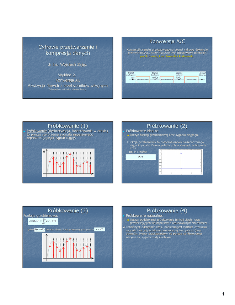 Konwersja A/C Cyfrowe przetwarzanie i kompresja danych Konwersji sygnał sygnału analogowego na sygnał sygnał cyfrowy dokonuje przetwornik A/C, któ który realizuje trzy podstawowe operacje: pró próbkowanie, kwantowanie i kodowanie. dr inż inż. Wojciech Zają Zając Wykł Wykład 2. Konwersja AC Akwizycja danych z przetwornikó przetworników wizyjnych Wykorzystano materiał materiały z pl.wikipedia.org Pró Próbkowanie (1) Pró Próbkowanie (dyskretyzacja, kwantowanie w czasie) to proces stworzenia sygnał sygnału impulsowego reprezentują reprezentującego sygnał sygnał cią ciągły. Pró Próbkowanie (2) Pró Próbkowanie idealne: iloczyn funkcji grzebieniowej oraz sygnał sygnału cią ciągłego. Funkcja grzebieniowa to potoczna nazwa nieskoń nieskończonego cią ciągu impulsó impulsów Diraca poł położonych w ró równych odstę odstępach czasu. Impuls Diraca: A δ (t ) Pró Próbkowanie (3) Funkcja grzebieniowa: combT (t ) = +∞ ∑ δ (t − nT ) n = −∞ gdzie δ (t − nT ) oznacza deltę deltę Diraca przesunię przesuniętą do punktu t = nT Pró Próbkowanie (4) Pró Próbkowanie naturalne: iloczyn poddawanej pró próbkowaniu funkcji cią ciągłej oraz powtarzają powtarzających się się impulsó impulsów o realizowalnym charakterze. W ustalonych odstę odstępach czasu mierzona jest wartość wartość chwilowa sygnał sygnału i na jej podstawie tworzone są są tzw. pró próbki (ang. sample). Sygnał Sygnał przekształ przekształcony do postaci spró spróbkowanej nazywa się się sygnał sygnałem dyskretnym. dyskretnym. 1 Pró Próbkowanie (5) Sygnał Sygnał dyskretny nie jest funkcją funkcją lecz cią ciągiem pró próbek. Czę Częstotliwość stotliwość pró próbkowania nie wystę występuje w funkcji opisują opisującej cią ciąg i musi być być przechowywana oddzielnie. Ta niejednoznaczność niejednoznaczność jest podstawą podstawą twierdzenia KotielnikowaKotielnikowa-Shannona: Shannona: Sygnał Sygnał cią ciągły moż może być być ponownie wiernie odtworzony z sygnał sygnału dyskretnego, jeś jeśli był był pró próbkowany z czę częstotliwoś stotliwością cią co najmniej dwa razy wię większą kszą od granicznej czę częstotliwoś stotliwości swego widma. widma. Czę Częstotliwość stotliwość graniczną graniczną nazywa się się czę częstotliwoś stotliwością cią Nyquista. Nyquista. Pró Próbkowanie (6) Czę Częstotliwość stotliwość Nyquista jest to maksymalna czę częstotliwość stotliwość skł składowych widmowych sygnał sygnału poddawanego procesowi pró próbkowania, bkowania, któ które mogą mogą zostać zostać odtworzone z cią ciągu pró próbek bez zniekształ zniekształceń ceń. Skł Składowe widmowe o czę częstotliwoś stotliwościach wyż wyższych od czę częstotliwoś stotliwości Nyquista ulegają ulegają podczas pró próbkowania nał nałożeniu na skł składowe o innych czę częstotliwoś stotliwościach (zjawisko aliasingu), aliasingu), co powoduje, że nie moż można ich już już poprawnie odtworzyć odtworzyć. Zgodnie z twierdzeniem KotielnikowaKotielnikowa-Shannona, Shannona, przy pró próbkowaniu ró równomiernym z odstę odstępem pró próbkowania Ts, warunkiem odtworzenia sygnał sygnału jest aby jego szerokość szerokość pasma B był była ściś ciśle ograniczona B < 1 / Ts, lub aby maksymalna czę częstotliwość stotliwość sygnał sygnału nie przekraczał przekraczała poł połowy czę częstotliwoś stotliwości pró próbkowania, fmax < fs / 2, lub fmax < 1 / 2Ts. Inaczej mó mówią wiąc, czę częstotliwość stotliwość Nyquista jest ró równa poł połowie czę częstotliwoś stotliwości pró próbkowania, bkowania, fN = fs / 2 albo fN = 1 / 2Ts. Pró Próbkowanie (7) Kwantyzacja (1) • Przykł Przykładowo dla czę częstotliwoś stotliwości pró próbkowania 44,1 kHz stosowanej na pł płytach CD czę częstotliwość stotliwość Nyquista wynosi 22,05 kHz. kHz. Jeś Jeśli w sygnale analogowym obecne są są skł składowe o czę częstotliwoś stotliwości wyż wyższej od czę częstotliwoś stotliwości Nyquista, Nyquista, spowoduje to powstanie błę dów pró ). Jednak ucho ludzkie nie błęd próbkowania (aliasing (aliasing). słyszy czę częstotliwoś stotliwości wyż wyższych niż niż 22 kHz, kHz, dlatego te skł składowe sygnał sygnału są są wycinane przed pró próbkowaniem poprzez zastosowanie filtru dolnoprzepustowego. dolnoprzepustowego. • Choć Choć w teorii czę częstotliwość stotliwość Nyquista wyznacza gó górną rną granicę granicę pasma, któ które moż można prawidł prawidłowo zapisać zapisać przy zastosowaniu okreś określonej czę częstotliwoś stotliwości pró próbkowania, to w praktycznie wykorzystywanych systemach granica ta jest nieco niż niższa od czę częstotliwoś stotliwości Nyquista. Nyquista. Jest to spowodowane ograniczoną ograniczoną stromoś stromością cią zboczy filtró filtrów. Pomię Pomiędzy czę częstotliwoś stotliwością cią Nyquista a górnym skrajem pasma musi być być pewien przedział przedział czę częstotliwoś stotliwości, w któ którym bę będzie mieś mieścić cić się się zbocze filtru. • Kwantyzacja: Kwantyzacja: operacja, któ która przetwarza sygnał sygnał spró spróbkowany w sygnał sygnał o dyskretnej strukturze amplitudowej. Polega ona na podzieleniu zakresu zmian wartoś wartości sygnał sygnału na skoń skończoną czoną liczbę liczbę M przedział przedziałów kwantyzacji i przybliż przybliżeniu wartoś wartości chwilowych pró próbek wartoś wartościami przyporzą przyporządkowanymi poszczegó poszczególnym przedział przedziałom. Najczęś ciej przedział Najczęściej przedziały kwantyzacji maja jednakową jednakową szerokość szerokość q, nazywana kwantem lub ziarnem (krokiem) kwantowania. • W wyniku kwantowania sygnał sygnał dyskretny x[nTs] zostaje przybli