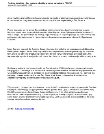 Rodzina katolicka - Czy zostanie określony status kanoniczny FSSPX? sobota, 31 stycznia 2009 13:03 Amerykańskie pismo Remnant powołując się na źródła w Watykanie spekuluje, że już 2 lutego br. może zostać uregulowany status kanoniczny Bractwa Kapłańskiego Św. Piusa X. Pismo powołuje się na słowa "dobrze poinformowanego" monsignora Ignacio Barreiro, szefa biura Human Life International w Rzymie. Nie mógł on co prawda potwierdzić daty 2 lutego, ale powiedział, że według jego informacji, w Rzymie pracuje się intensywnie nad praktycznymi rozwiązaniami, zmierzającymi do pełnego uregulowana obecności Bractwa w Kościele. Msgr Barreiro twierdzi, że Bractwo "nie może być zależne od poszczególnych biskupów diecezjalnych". Mówi dalej: "Bractwo na pewno musi mieć gwarancję, że zostanie tam, gdzie się obecnie znajduje i pozbawione będzie wpływu lokalnego biskupa". Dla wypowadającego te słowa jest jednak jasne, że biskupi z trudem zaakceptują takie rozwiązanie. Duchowny wskazał także na sytuację we Francji, gdzie 1/3 kleryków uczy się w seminariach tradycyjnych. Tendencja ta z roku na rok systematycznie wzrasta. Problem tradycjonalistów jest więc realnym zagadnieniem związanym z przyszłością Kościoła francuskiego. Ks. Barreiro ma nadzieję, że taka struktura Bractwa Św. Piusa X jak "uniwersalna Administratura Apostolska mogłaby stanowić jedyne rozwiązanie". Wiadomość o rychłym zaprezentowaniu przez Kościół rozwiązania organizacyjnego dla Bractwa współgra z informacją, jaką przywołuje włoska gazeta Italia Oggi. Zamieszcza ona słowa kard. Re, który ubolewa, że kard. Hoyos "dał" mu tylko kilka godzin na podpisanie dokumentu, podczas gdy on wolałby poczekać jeszcze miesiąc i ogłosić tę wiadomość, gdy nowy statut prawny dla lefebrystów będzie gotowy. Jest więc wielce prawodpodobne, że teraz sprawy musiały przybrać szybsze tempo. Źródło: Kronika Novus Ordo 1/1