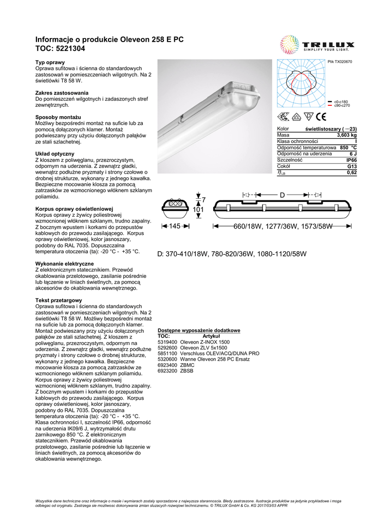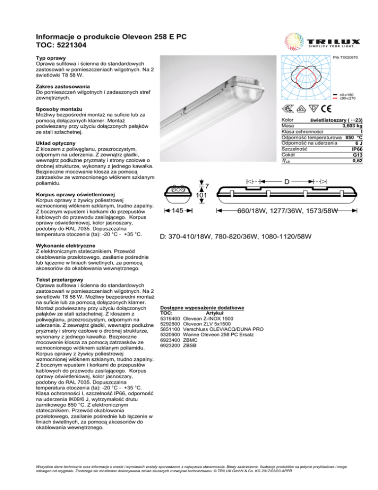 Informacje o produkcie Oleveon 258 E PC TOC: 5221304 Typ oprawy Oprawa sufitowa i ścienna do standardowych zastosowań w pomieszczeniach wilgotnych. Na 2 świetlówki T8 58 W. Plik TX020670 Zakres zastosowania Do pomieszczeń wilgotnych i zadaszonych stref zewnętrznych. c0-c180 c90-c270 Sposoby montażu Możliwy bezpośredni montaż na suficie lub za pomocą dołączonych klamer. Montaż podwieszany przy użyciu dołączonych pałąków ze stali szlachetnej. Kolor świetlistoszary ( ···23) Masa 3,603 kg Klasa ochronności I Odporność temperaturowa 850 °C Odporność na uderzenia 6J Szczelność IP66 Cokół G13 η LB 0,62 Układ optyczny Z kloszem z poliwęglanu, przezroczystym, odpornym na uderzenia. Z zewnątrz gładki, wewnątrz podłużne pryzmaty i strony czołowe o drobnej strukturze, wykonany z jednego kawałka. Bezpieczne mocowanie klosza za pomocą zatrzasków ze wzmocnionego włóknem szklanym poliamidu. Korpus oprawy oświetleniowej Korpus oprawy z żywicy poliestrowej wzmocnionej włóknem szklanym, trudno zapalny. Z bocznym wpustem i korkami do przepustów kablowych do przewodu zasilającego. Korpus oprawy oświetleniowej, kolor jasnoszary, podobny do RAL 7035. Dopuszczalna temperatura otoczenia (ta): -20 °C - +35 °C. D 7 101 145 660/18W, 1277/36W, 1573/58W D: 370-410/18W, 780-820/36W, 1080-1120/58W Wykonanie elektryczne Z elektronicznym statecznikiem. Przewód okablowania przelotowego, zasilanie pośrednie lub łączenie w liniach świetlnych, za pomocą akcesoriów do okablowania wewnętrznego. Tekst przetargowy Oprawa sufitowa i ścienna do standardowych zastosowań w pomieszczeniach wilgotnych. Na 2 świetlówki T8 58 W. Możliwy bezpośredni montaż na suficie lub za pomocą dołączonych klamer. Montaż podwieszany przy użyciu dołączonych pałąków ze stali szlachetnej. Z kloszem z poliwęglanu, przezroczystym, odpornym na uderzenia. Z zewnątrz gładki, wewnątrz podłużne pryzmaty i strony czołowe o drobnej strukturze, wykonany z jednego kawałka. Bezpieczne mocowanie klosza za pomocą zatrzasków ze wzmocnionego włóknem szklanym poliamidu. Korpus oprawy z żywicy poliestrowej wzmocnionej włóknem szklanym, trudno zapalny. Z bocznym wpustem i korkami do przepustów kablowych do przewodu zasilającego. Korpus oprawy oświetleniowej, kolor jasnoszary, podobny do RAL 7035. Dopuszczalna temperatura otoczenia (ta): -20 °C - +35 °C. Klasa ochronności I, szczelność IP66, odporność na uderzenia IK09/6 J, wytrzymałość drutu żarnikowego 850 °C. Z elektronicznym statecznikiem. Przewód okablowania przelotowego, zasilanie pośrednie lub łączenie w liniach świetlnych, za pomocą akcesoriów do okablowania wewnętrznego. Dostępne wyposażenie dodatkowe TOC: Artykuł 5319400 Oleveon Z-INOX 1500 5292600 Oleveon ZLV 5x1500 5851100 Verschluss OLEV/ACQ/DUNA PRO 5320600 Wanne Oleveon 258 PC Ersatz 6923400 ZBMC 6923200 ZBSB Wszystkie dane techniczne oraz informacje o masie i wymiarach zostaly sporzadzone z najwyzsza starannoscia. Bledy zastrzezone. Ilustracje produktów sa jedynie przykladowe i moga odbiegac od oryginalu. Zastrzega sie mozliwosc dokonywania zmian sluzacych rozwojowi technicznemu. © TRILUX GmbH & Co. KG 2017/03/03 APPR