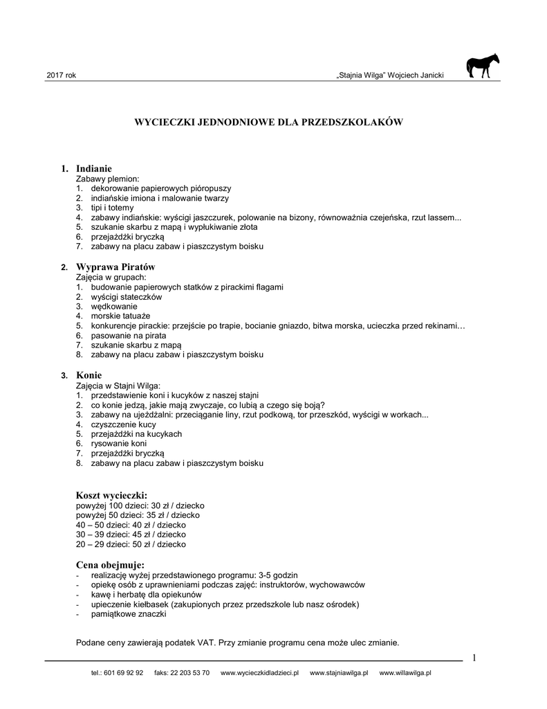 2017 rok „Stajnia Wilga” Wojciech Janicki WYCIECZKI JEDNODNIOWE DLA PRZEDSZKOLAKÓW 1. Indianie Zabawy plemion: 1. dekorowanie papierowych pióropuszy 2. indiańskie imiona i malowanie twarzy 3. tipi i totemy 4. zabawy indiańskie: wyścigi jaszczurek, polowanie na bizony, równoważnia czejeńska, rzut lassem... 5. szukanie skarbu z mapą i wypłukiwanie złota 6. przejażdżki bryczką 7. zabawy na placu zabaw i piaszczystym boisku 2. Wyprawa Piratów Zajęcia w grupach: 1. budowanie papierowych statków z pirackimi flagami 2. wyścigi stateczków 3. wędkowanie 4. morskie tatuaże 5. konkurencje pirackie: przejście po trapie, bocianie gniazdo, bitwa morska, ucieczka przed rekinami… 6. pasowanie na pirata 7. szukanie skarbu z mapą 8. zabawy na placu zabaw i piaszczystym boisku 3. Konie Zajęcia w Stajni Wilga: 1. przedstawienie koni i kucyków z naszej stajni 2. co konie jedzą, jakie mają zwyczaje, co lubią a czego się boją? 3. zabawy na ujeżdżalni: przeciąganie liny, rzut podkową, tor przeszkód, wyścigi w workach... 4. czyszczenie kucy 5. przejażdżki na kucykach 6. rysowanie koni 7. przejażdżki bryczką 8. zabawy na placu zabaw i piaszczystym boisku Koszt wycieczki: powyżej 100 dzieci: 30 zł / dziecko powyżej 50 dzieci: 35 zł / dziecko 40 – 50 dzieci: 40 zł / dziecko 30 – 39 dzieci: 45 zł / dziecko 20 – 29 dzieci: 50 zł / dziecko Cena obejmuje: - realizację wyżej przedstawionego programu: 3-5 godzin opiekę osób z uprawnieniami podczas zajęć: instruktorów, wychowawców kawę i herbatę dla opiekunów upieczenie kiełbasek (zakupionych przez przedszkole lub nasz ośrodek) pamiątkowe znaczki Podane ceny zawierają podatek VAT. Przy zmianie programu cena może ulec zmianie. 1 tel.: 601 69 92 92 faks: 22 203 53 70 www.wycieczkidladzieci.pl www.stajniawilga.pl www.willawilga.pl 2017 rok „Stajnia Wilga” Wojciech Janicki Cena nie obejmuje: 1. transportu (cena zależy od liczby kilometrów) 2. menu: - kiełbaski, ketchup, musztarda, pieczywo 6 zł / dziecko - napoje: herbata, woda z sokiem 2 zł / dziecko - słodycze: pączek, ciastka, paluszki 4 zł / dziecko - obiad (dwudaniowy, deser, napój) 12 zł / dziecko - zupa 4 zł / dziecko Przy wykupieniu menu dla grupy, na każdą rozpoczętą 10-tkę dzieci, 1 opiekun otrzymuje bezpłatne menu; dodatkowi opiekunowie menu płatne – cena jak za dziecko. _____________________________________________________________________________________ JAK ZAREZERWOWAĆ? 1. 2. 3. 4. uzgodnienie terminu i programu (mailowo: [email protected] lub telefonicznie: 601 69 92 92); podpisanie umowy (wysłanej mailem); odesłanie umowy (skanu) mailem lub faksem (22 203 53 70); w przypadku wycieczek jednodniowych: wpłata na miejscu w dniu wycieczki lub przelewem w dowolnym terminie przed przyjazdem; w uzasadnionych przypadkach możliwa płatność odroczona do 30 dni po odbyciu się wycieczki. 2 tel.: 601 69 92 92 faks: 22 203 53 70 www.wycieczkidladzieci.pl www.stajniawilga.pl www.willawilga.pl