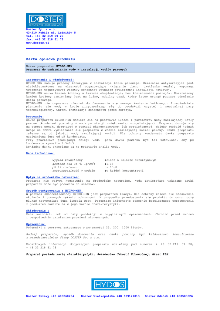 Doster Sp. z o.o. 43-210 Kobiór ul. Leśników 5 tel. +48 32 219 09 20 fax. +48 32 218 81 78 www.doster.pl __________________________________________________________________________ Karta opisowa produktu Nazwa preparatu: HYDRO-MIN Preparat do uzdatniania wody w instalacji kotłów parowych. Zastosowanie i właściwości: HYDRO-MIN hamuje procesy korozyjne w instalacji kotła parowego. Działanie antykorozyjne jest wielokierunkowe: ma własności odgazowujące (wiązanie tlenu, dwutlenku węgla), wspomaga tworzenie magnetytowej warstwy ochronnej wewnątrz powierzchni instalacji kotłowej. HYDRO-MIN usuwa kamień kotłowy w trakcie eksploatacji, bez konieczności postojów. Rozkruszony kamień kotłowy zamieniany jest na luźny, mobilny osad, który łatwo usunąć poprzez odmulanie kotła parowego. HYDRO-MIN nie dopuszcza również do formowania się nowego kamienia kotłowego. Przeciwdziała pienieniu się wody w kotle przyczyniając się do produkcji czystej i neutralnej pary technologicznej. Chroni instalację kondensatu przed korozją. Dozowanie: Dawkę preparatu HYDRO-MIN dobiera się na podstawie ilości i parametrów wody zasilającej kotły parowe (kondensat powrotny + woda po stacji zmiękczania, uzupełniająca). Preparat dozuje się za pomocą pompki dozującej w postaci skoncentrowanej lub rozcieńczonej. Należy zwrócić jednak uwagę na dobre wymieszanie się preparatu w wodzie zasilającej kocioł parowy. Dawki preparatu zależne są od jakości wody zasilającej kocioł. Dla ochrony kondensatu dawka preparatu uzależniona jest od pH kondensatu. Przy prawidłowo pracującym obiegu woda- para dawka powinna być tak ustawiona, aby pH kondensatu wynosiło 7,5-8,5. Dokładne dawki określane są na podstawie analiz wody. Dane techniczne: wygląd zewnętrzny gęstość dla 25 C (g/cm3) pH 1% roztworu rozpuszczalność w wodzie :ciecz o kolorze bursztynowym :1,18 :~ 13,8 :w każdej koncentracji Wpływ na środowisko naturalne: Preparat nie wpływa negatywnie na środowisko preparatu może być podawana do ścieków. naturalne. Woda zawierająca wskazane dawki Sposób postępowania z HYDRO-MIN: W postaci skoncentrowanej HYDRO-MIN jest preparatem żrącym. Dla ochrony zaleca się stosowanie okularów i gumowych rękawic ochronnych. W przypadku przedostania się produktu do oczu, oczy płukać natychmiast dużą ilością wody. Pozostałe informacje odnośnie bezpiecznego postępowania z produktem zawarte są w jego karcie charakterystyki. Składowanie : Data ważności: rok od daty produkcji w oryginalnych i bezpośrednim działaniem promieni słonecznych. opakowaniach. Chronić przed mrozem Opakowania: Pojemniki z tworzywa sztucznego o pojemności 25, 200, 1000 litrów. Rodzaj preparatu, sposób dozowania oraz z przedstawicielem firmy DOSTER Sp. z o.o. Dodatkowych informacji + 48 32 218 81 78 dotyczących preparatu dawka powinny udzielamy być pod każdorazowo numerem + 48 konsultowane 32 219 09 20, Preparat posiada kartę charakterystyki, Świadectwo Jakości Zdrowotnej, Atest PZH. Doster Puławy +48 600260234 Doster Wielkopolska +48 609121013 Doster Gdańsk +48 608583526
