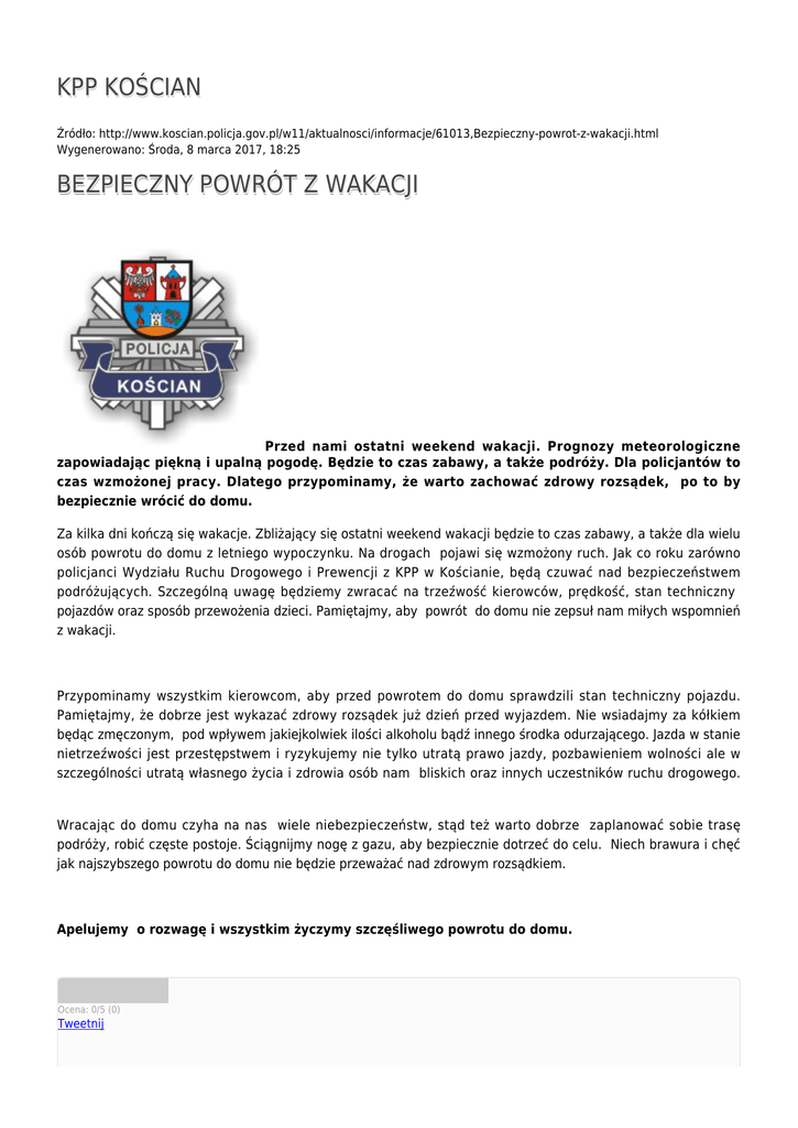 KPP KOŚCIAN Źródło: http://www.koscian.policja.gov.pl/w11/aktualnosci/informacje/61013,Bezpieczny-powrot-z-wakacji.html Wygenerowano: Środa, 8 marca 2017, 18:25 BEZPIECZNY POWRÓT Z WAKACJI Przed nami ostatni weekend wakacji. Prognozy meteorologiczne zapowiadając piękną i upalną pogodę. Będzie to czas zabawy, a także podróży. Dla policjantów to czas wzmożonej pracy. Dlatego przypominamy, że warto zachować zdrowy rozsądek, po to by bezpiecznie wrócić do domu. Za kilka dni kończą się wakacje. Zbliżający się ostatni weekend wakacji będzie to czas zabawy, a także dla wielu osób powrotu do domu z letniego wypoczynku. Na drogach pojawi się wzmożony ruch. Jak co roku zarówno policjanci Wydziału Ruchu Drogowego i Prewencji z KPP w Kościanie, będą czuwać nad bezpieczeństwem podróżujących. Szczególną uwagę będziemy zwracać na trzeźwość kierowców, prędkość, stan techniczny pojazdów oraz sposób przewożenia dzieci. Pamiętajmy, aby powrót do domu nie zepsuł nam miłych wspomnień z wakacji. Przypominamy wszystkim kierowcom, aby przed powrotem do domu sprawdzili stan techniczny pojazdu. Pamiętajmy, że dobrze jest wykazać zdrowy rozsądek już dzień przed wyjazdem. Nie wsiadajmy za kółkiem będąc zmęczonym, pod wpływem jakiejkolwiek ilości alkoholu bądź innego środka odurzającego. Jazda w stanie nietrzeźwości jest przestępstwem i ryzykujemy nie tylko utratą prawo jazdy, pozbawieniem wolności ale w szczególności utratą własnego życia i zdrowia osób nam bliskich oraz innych uczestników ruchu drogowego. Wracając do domu czyha na nas wiele niebezpieczeństw, stąd też warto dobrze zaplanować sobie trasę podróży, robić częste postoje. Ściągnijmy nogę z gazu, aby bezpiecznie dotrzeć do celu. Niech brawura i chęć jak najszybszego powrotu do domu nie będzie przeważać nad zdrowym rozsądkiem. Apelujemy o rozwagę i wszystkim życzymy szczęśliwego powrotu do domu. Ocena: 0/5 (0) Tweetnij
