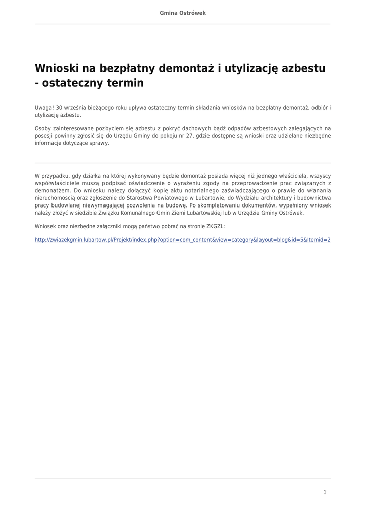 Gmina Ostrówek Wnioski na bezpłatny demontaż i utylizację azbestu - ostateczny termin Uwaga! 30 września bieżącego roku upływa ostateczny termin składania wniosków na bezpłatny demontaż, odbiór i utylizację azbestu. Osoby zainteresowane pozbyciem się azbestu z pokryć dachowych bądź odpadów azbestowych zalegających na posesji powinny zgłosić się do Urzędu Gminy do pokoju nr 27, gdzie dostępne są wnioski oraz udzielane niezbędne informacje dotyczące sprawy. W przypadku, gdy działka na której wykonywany będzie domontaż posiada więcej niż jednego właściciela, wszyscy współwłaściciele muszą podpisać oświadczenie o wyrażeniu zgody na przeprowadzenie prac związanych z demonatżem. Do wniosku nalezy dołączyć kopię aktu notarialnego zaświadczającego o prawie do włanania nieruchomoscią oraz zgłoszenie do Starostwa Powiatowego w Lubartowie, do Wydziału architektury i budownictwa pracy budowlanej niewymagającej pozwolenia na budowę. Po skompletowaniu dokumentów, wypełniony wniosek należy złożyć w siedzibie Związku Komunalnego Gmin Ziemi Lubartowskiej lub w Urzędzie Gminy Ostrówek. Wniosek oraz niezbędne załączniki mogą państwo pobrać na stronie ZKGZL: http://zwiazekgmin.lubartow.pl/Projekt/index.php?option=com_content&view=category&layout=blog&id=5&Itemid=2 1