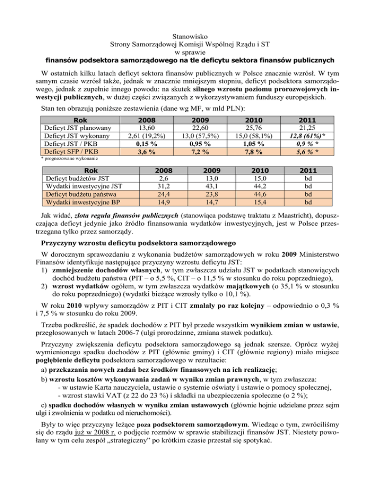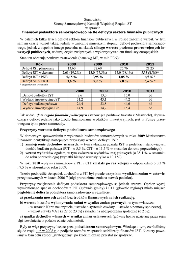 Stanowisko Strony Samorządowej Komisji Wspólnej Rządu i ST w sprawie finansów podsektora samorządowego na tle deficytu sektora finansów publicznych W ostatnich kilku latach deficyt sektora finansów publicznych w Polsce znacznie wzrósł. W tym samym czasie wzrósł także, jednak w znacznie mniejszym stopniu, deficyt podsektora samorządowego, jednak z zupełnie innego powodu: na skutek silnego wzrostu poziomu prorozwojowych inwestycji publicznych, w dużej części związanych z wykorzystywaniem funduszy europejskich. Stan ten obrazują poniższe zestawienia (dane wg MF, w mld PLN): Rok Deficyt JST planowany Deficyt JST wykonany Deficyt JST / PKB Deficyt SFP / PKB 2008 13,60 2,61 (19,2%) 0,15 % 3,6 % 2009 22,60 13,0 (57,5%) 0,95 % 7,2 % 2010 25,76 15,0 (58,1%) 1,05 % 7,8 % 2011 21,25 12,8 (61%)* 0,9 % * 5,6 % * * prognozowane wykonanie Rok Deficyt budżetów JST Wydatki inwestycyjne JST Deficyt budżetu państwa Wydatki inwestycyjne BP 2008 2,6 31,2 24,4 14,9 2009 13,0 43,1 23,8 14,7 2010 15,0 44,2 44,6 15,4 2011 bd bd bd bd Jak widać, złota reguła finansów publicznych (stanowiąca podstawę traktatu z Maastricht), dopuszczająca deficyt jedynie jako źródło finansowania wydatków inwestycyjnych, jest w Polsce przestrzegana tylko przez samorządy. Przyczyny wzrostu deficytu podsektora samorządowego W dorocznym sprawozdaniu z wykonania budżetów samorządowych w roku 2009 Ministerstwo Finansów identyfikuje następujące przyczyny wzrostu deficytu JST: 1) zmniejszenie dochodów własnych, w tym zwłaszcza udziału JST w podatkach stanowiących dochód budżetu państwa (PIT – o 5,5 %, CIT – o 11,5 % w stosunku do roku poprzedniego), 2) wzrost wydatków ogółem, w tym zwłaszcza wydatków majątkowych (o 35,1 % w stosunku do roku poprzedniego) (wydatki bieżące wzrosły tylko o 10,1 %). W roku 2010 wpływy samorządów z PIT i CIT zmalały po raz kolejny – odpowiednio o 0,3 % i 7,5 % w stosunku do roku 2009. Trzeba podkreślić, że spadek dochodów z PIT był przede wszystkim wynikiem zmian w ustawie, przegłosowanych w latach 2006-7 (ulgi prorodzinne, zmiana stawek podatku). Przyczyny zwiększenia deficytu podsektora samorządowego są jednak szersze. Oprócz wyżej wymienionego spadku dochodów z PIT (głównie gminy) i CIT (głównie regiony) miało miejsce pogłębienie deficytu podsektora samorządowego w rezultacie: a) przekazania nowych zadań bez środków finansowych na ich realizację; b) wzrostu kosztów wykonywania zadań w wyniku zmian prawnych, w tym zwłaszcza: - w ustawie Karta nauczyciela, ustawie o systemie oświaty i ustawie o pomocy społecznej, - wzrost stawki VAT (z 22 do 23 %) i składki na ubezpieczenia społeczne (o 2 %); c) spadku dochodów własnych w wyniku zmian ustawowych (głównie hojnie udzielane przez sejm ulgi i zwolnienia w podatku od nieruchomości). Były to więc przyczyny leżące poza podsektorem samorządowym. Wiedząc o tym, zwróciliśmy się do rządu już w 2008 r. o podjęcie rozmów w sprawie stabilizacji finansów JST. Niestety powołany w tym celu zespół „strategiczny” po krótkim czasie przestał się spotykać. Porozumienie z Premierem a obecny stan prawny i proponowane zmiany Wiosną 2011 roku minister finansów podjął rozmowy z przedstawicielami Strony Samorządowej Komisji Wspólnej Rządu i ST), dotyczące konieczności udziału podsektora samorządowego w ograniczaniu deficytu sektora finansów publicznych w Polsce. W maju strona samorządowa uzgodniła z Premierem Donaldem Tuskiem ograniczenie w roku 2012 deficytu podsektora o 0,4 % w stosunku do poziomu z r. 2010 (wynosił on wówczas 1,05% - same JST / 1,2 % - cały podsektor). Planowany deficyt JST na rok 2012 wynosi 10,5 mld PLN (0,72 % PKB). Jego wykonanie – analogicznie jak w latach ubiegłych – można szacować na poziomie ok. 60 %, to znaczy 6,3 mld (0,43% PKB). Należy przypomnieć, że – zgodnie z prawem – JST planują deficyt z uwzględnieniem wszystkich wydatków, także majątkowych, jakie zamierzają zrealizować w danym roku. Różne względy, zwłaszcza opóźnienia w realizacji planowanych inwestycji (procedura zamówień publicznych, procedury dystrybucji środków unijnych itp.), powodują, że wykonanie tego planu wynosi od 3 lat ok. 60%. Jest zatem oczywiste, że majowe uzgodnienie z Premierem zostało przez podsektor samorządowy wykonane nawet w większym stopniu, niż wynegocjowany. Niestety efektem tych zmian będzie zmniejszenie poziomu inwestycji w rozwój lokalny i regionalny. Zmniejszenie deficytu JST jest także większe niż zapowiedział minister finansów w piśmie do Komisji Europejskiej z 21 grudnia 2011 roku (0,34 % PKB). Mimo to minister podtrzymuje zamiar wprowadzenia dodatkowego „reżimu” dla podsektora. Projekt zmian w ustawie o finansach publicznych jest bardzo zły, ponieważ wprowadza procedury, które wobec indywidualnie rozpatrywanych miast, powiatów i regionów wprowadzają sztywne limity i ograniczenia, które: - mogą utrudnić, a nawet uniemożliwić poszczególnym jednostkom realizację ich zadań (w sposób niezgodny z gwarantowanymi w Konstytucji zasadami ustrojowymi), - są zbędne, gdyż planowane zmniejszenie deficytu całego podsektora jest większe niż oczekiwane. Trzeba przy tym podkreślić, że obserwowane zmniejszenie deficytu podsektora samorządowego, jest wynikiem wchodzących właśnie do obiegu prawnego zmian w ustawie o finansach publicznych, które znacznie ograniczają możliwość generowania nowego deficytu, poprzez odniesienie limitu zadłużenia wprost do możliwości jego spłaty. Te zmiany (zwłaszcza art. 243 ustawy) gwarantują tak silne ograniczenie deficytu JST, że wprowadzanie „dodatkowego reżimu” jest całkowicie zbędne. Negatywne skutki gospodarcze i społeczne proponowanych zmian Należy też zaznaczyć, że dokonywane znaczne zmniejszenie poziomu wydatków inwestycyjnych: - spowolni rozwój lokalny i regionalny, a niektóre inwestycje staną się 
