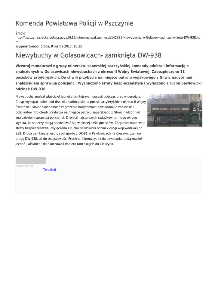 Komenda Powiatowa Policji w Pszczynie Źródło: http://pszczyna.slaska.policja.gov.pl/k19/informacje/aktualnosci/142385,Niewybuchy-w-Golasowicach-zamknieta-DW-938.ht ml Wygenerowano: Środa, 8 marca 2017, 18:25 Niewybuchy w Golasowicach- zamknięta DW-938 Wczoraj mundurowi z grupy minersko- saperskiej pszczyńskiej komendy odebrali informację o znalezionych w Golasowicach niewybuchach z okresu II Wojny Światowej. Zabezpieczono 11 pocisków artyleryjskich. Do chwili przybycia na miejsce patrolu wojskowego z Gliwic nadzór nad znaleziskiem sprawują policjanci. Wyznaczono strefy bezpieczeństwa i wyłączono z ruchu pawłowicki odcinek DW-938. Niewybuchy znalazł właściciel jednej z tamtejszych posesji podczas prac w ogrodzie. Chcąc wykopać dołek pod drzewko natknął się na pociski artyleryjskie z okresu II Wojny Światowej. Mając świadomość zagrożenia natychmiast powiadomił o znalezisku policjantów. Do chwili przybycia na miejsce patrolu saperskiego z Gliwic nadzór nad znaleziskiem sprawują policjanci. Z relacji najstarszych świadków tamtego okresu wynika, że saperzy mogą spodziewać się większej ilości pocisków. Zorganizowano więc strefy bezpieczeństwa i wyłączono z ruchu pawłowicki odcinek drogi wojewódzkiej nr 938. Droga zamknięta jest już od zjazdu z DK-81 w Pawłowicach na Cieszyn, czyli na drogę DW-938, aż do miejscowości Pruchna. Kierowcy, aż do odwołania, będą musieli jechać „wiślanką” do Skoczowa i dopiero tam skręcić do Cieszyna. Ocena: 0/5 (0) Tweetnij