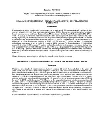 Zdzisław WÓJCICKI Instytut Technologiczno-Przyrodniczy w Falentach, Oddział w Warszawie, Zakład Analiz Ekonomicznych i Energetycznych DZIAŁALNOŚĆ WDROŻENIOWA I ROZWOJOWA W BADANYCH GOSPODARSTWACH RODZINNYCH Streszczenie Przedstawiono wyniki działalności modernizacyjnej w wybranych 53 gospodarstwach rodzinnych badanych w latach 2009–2015, z prognozą rozwojową do 2020 r. Stosowano konwencjonalną metodykę badań opracowaną w Instytucie Budownictwa, Mechanizacji i Elektryfikacji Rolnictwa (IBMER) [WÓJCICKI i in. 2009]. Stwierdzono wzajemne oddziaływanie poszczególnych elementów wdrożeń na przemiany organizacyjno-technologiczne oraz ich wpływ na rozwój badanych grup gospodarstw i na efekty ich modernizacji. Najlepszymi efektami rozwojowymi do 2020 r. charakteryzują się gospodarstwa (10 obiektów) IV grupy obszarowej (średnio w 2015 r. 57,88 ha·gosp.–1) i gospodarstwa (13 obiektów) największej obszarowo grupy V (w 2015 r. średnio 94,58 ha·gosp.–1). Gospodarstwom (10 obiektów) grupy III (średnio 36,41 ha·gosp.–1) będzie brakowało środków na inwestycje rozwojowe (zakup ziemi). Gospodarstwom (10 obiektów) grupy II (29,58 ha·gosp.–1) i gospodarstwom (10 obiektów) grupy I (20,39 ha·gosp.–1) będzie brakowało środków na inwestycje rozwojowe i odtworzeniowe. Ich właściciele będą musieli zmniejszać wynagrodzenie za pracę oraz ograniczać zakup ziemi i nowoczesnych maszyn. Słowa kluczowe: gospodarstwo, wdrożenie, rozwój, modernizacja, prognoza IMPLEMENTATION AND DEVELOPMENT ACTIVITY IN THE STUDIED FAMILY FARMS Summary Presented are results of modernization activity in selected 53 family farms studied in the years of 2009–2015, with prediction of their development up to 2030. The conventional study method was applied developed at IBMER by WÓJCICKI et al. [2009]. Mutual interaction of the elements of implementation and the organizational and technological changes were found and also their influence on the development of farms in studied groups on the effects of their modernization. The best effects of development up to 2020 were found in the group IV (10 objects) of farms with the mean acreage of 57.88 ha∙farm–1 in 2015 and in the group V (13 farms) of the biggest enterprises with the mean acreage of 94.58 ha∙farm–1. The farms of the group III (10 farms with mean acreage of 36.41 ha∙farm–1) will lack of means of payment for developing investments (purchase of land ). The farms of the I group II (10 farms with mean acreage of 29.58 ha∙farm–1) and of the group I (10 farms with the mean acreage of 20.39 ha∙farm–1) will lack of means of payment for investment as well for development as for reproduction. These farms will have to reduce work payments and restrict purchase of land and of modern machines. Key words: farm, implementation, development, modernization, prediction