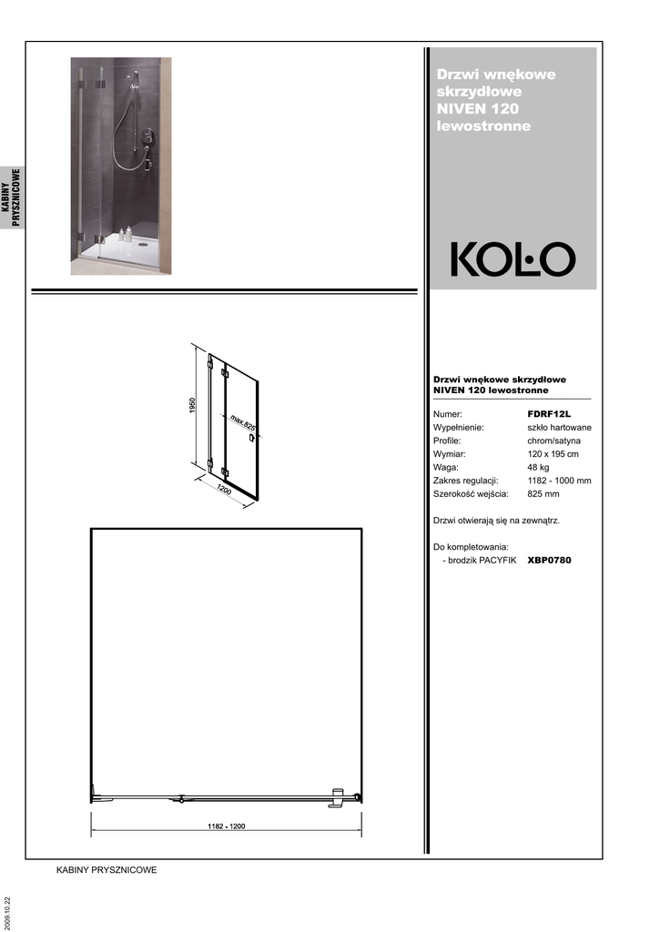 KABINY PRYSZNICOWE Drzwi wnękowe skrzydłowe NIVEN 120 lewostronne Drzwi wnękowe skrzydłowe NIVEN 120 lewostronne ________________________________ Numer: Wypełnienie: Profile: Wymiar: Waga: Zakres regulacji: Szerokość wejścia: FDRF12L szkło hartowane chrom/satyna 120 x 195 cm 48 kg 1182 - 1000 mm 825 mm Drzwi otwierają się na zewnątrz. Do kompletowania: - brodzik PACYFIK 2009.10.22 KABINY PRYSZNICOWE XBP0780