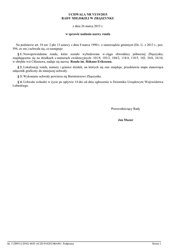 UCHWAŁA NR VI/19/2015 RADY MIEJSKIEJ W ZBĄSZYNKU z dnia 26 marca 2015 r. w sprawie nadania nazwy ronda Na podstawie art. 18 ust. 2 pkt 13 ustawy z dnia 8 marca 1990 r. o samorządzie gminnym (Dz. U. z 2013 r., poz. 594, ze zm.) uchwala się, co następuje: § 1. Nowopowstałemu rondu, które zostało wybudowane w ciągu obwodnicy północnej Zbąszynka, znajdującemu się na działkach o numerach ewidencyjnych: 101/8, 103/2, 104/2, 118/4, 118/5, 102, 34/6, 34/10, w obrębie wsi Chlastawa, nadaje się nazwę: Rondo im. Håkana Erikssona. § 2. Lokalizację ronda, numery i granice działek, na których się ono znajduje, przedstawia mapa stanowiąca załącznik graficzny do niniejszej uchwały. § 3. Wykonanie uchwały powierza się Burmistrzowi Zbąszynka. § 4. Uchwała wchodzi w życie po upływie 14 dni od dnia ogłoszenia w Dzienniku Urzędowym Województwa Lubuskiego. Przewodniczący Rady Jan Mazur Id: 112B9512-D362-465F-AC2D-9342EC6BA861. Podpisany Strona 1 Uzasadnienie Håkan Gustaf Eriksson pracę zawodową rozpoczął w r. 1966. Od lat siedemdziesiątych ub. wieku stale związany zawodowo z Polską. Przeszedł wszystkie szczeble kariery zawodowej, będąc m.in. inżynierem projektu budowy fabryk w Niemczech, w Rosji i innych państwach. Od momentu współpracy z IKEA w 1978 r. zostaje inżynierem projektów rozwoju fabryk koncernu IKEA na Polskę. W 1982 r. tworzy Biuro Zakupów IKEA w Warszawie i zostaje jego pierwszym dyrektorem. Realizuje wiele projektów, m.in. uruchomienia fabryki mebli w Mosinie w kooperacji ze Swarzędzką Fabryką Mebli. W 1992 roku zostaje powierzone mu zadanie utworzenia Spółki Swedwood Poland, której zostaje dyrektorem. W latach 1993 – 2012 pełnił również funkcję Prezesa Zarządu Swedwood Poland Sp. z o.o. z siedzibą w Goleniowie. Posiada szczególnie pozytywny udział w rozwoju przemysłu meblarskiego w Polsce, naznaczony aktywnym i skutecznym udziałem w procesie restrukturyzacji, przejęcia i budowy przez grupę Swedwood zakładów w województwach: lubuskim - Zbąszynek, Babimost; warmińsko-mazurskim - Lubawa, zachodnio-pomorskim – Goleniów, Resko, Stepnica; podlaskim – Wielbark, łódzkim – Konstantynów Łódzki, jak również w tworzeniu nowego ładu organizacyjnego grupy. Ambitny i odpowiedzialny, tytan pracy. Wielki przyjaciel Polski i Polaków zamieszkuje od wielu lat w naszym kraju, gdzie pokochał polską tradycję i obyczaje. Niezwykła serdeczność w kontaktach z podwładnymi sprawia, że cieszy się olbrzymim zaufaniem i prestiżem wśród załóg polskich zakładów. Przez wiele lat zawodowej pracy, zdobył doświadczenie na rynkach zagranicznych w zakresie tworzenia, organizacji i zarządzania podmiotami gospodarczymi. Tę wiedzę bardzo chętnie i konsekwentnie przekazywał załogom i kierownictwu polskich zakładów. Był jednym z „motorów” napędowych polityki inwestycyjnej grupy w Polsce. Dzięki Jego działaniom, akceptowanym przez twórcę IKEA Ingvara Kamprada w ostatnim dwudziestoleciu w Polsce grupa wybudowała kilka nowoczesnych zakładów. Obrót całej grupy w roku 2013 wyniósł 4,5 miliarda zł. Produkcja w 97% jest exportowana, co sprawia, że grupa znajduje się w czołówce największych polskich exporterów. W zasadniczy sposób przyczynił się do gospodarczego sukcesu na obszarach, gdzie są zlokalizowane fabryki grupy. Efektem działań, w których bardzo istotny i pozytywny udział miał Pan Håkan Eriksson, jest wielokrotny wzrost potencjału zakładów grupy z ok. 15.000 m2 powierzchni produkcyjnej w roku 1992 do ponad 650.000 m2 obecnie. Zatrudnienie w grupie wzrosło z 300 osób do 9000 osób. W lipcu 2014 spółka Swedwood została przekształcona w spółkę IKEA INDUSTRY. Prowadzona przez Pana Håkana Erikssona polityka inwestycyjna, była elementem gospodarczego rozwoju nie tylko zarządzanej przez Niego grupy przedsiębiorstw, ale co istotniejsze wielu regionów Polski, w tym, co dla nas najważniejsze - Gminy Zbąszynek. Dzięki temu poziom bezrobocia na tych obszarach znacznie obniżył się, a potencjał zakładów tworzy podstawę ekonomicznego funkcjonowania wielu lokalnych samorządów. W 2014 roku Pan Håkan Erikson przeszedł na zasłużoną emeryturę. Za wieloletnią, wytrwałą i przyjazną pracę na terenie Gminy Zbąszynek, Pan Håkan Erikson w pełni zasłużył sobie na to, aby pierwsze rondo wybudowane na terenie Gminy Zbąszynek, znajdujące się na drodze dojazdowej do zakładów IKEA INDUSTRY w Chlastawie nosiło właśnie Jego imię. Mając powyższe na uwadze podjęcie niniejszej uchwały jest w pełni uzasadnione. Id: 112B9512-D362-465F-AC2D-9342EC6BA861. Podpisany Strona 2 Załącznik do Uchwały Nr VI/19/2015 Rady Miejskiej w Zbąszynku z dnia 26 marca 2015 r. Id: 112B9512-D362-465F-AC2D-9342EC6BA861. Podpisany Strona 1