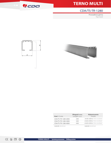 TERNO MULTI Quality product of CDA/TS-TR-1280 Prowadnica górna Top track Kod / Code Długość (mm) Lenght (mm) CDA/TS-TR-1280-2000 CDA/TS-TR-1280-3000 CDA/TS-TR-1280-4000 materiał: aluminium TERNO MULTI І Systemy przesuwne І Sliding system Wykończenie Finish 2000 anoda srebrna / silver anodized 3000 anoda srebrna / silver anodized 4000 anoda srebrna / silver anodized material: aluminium