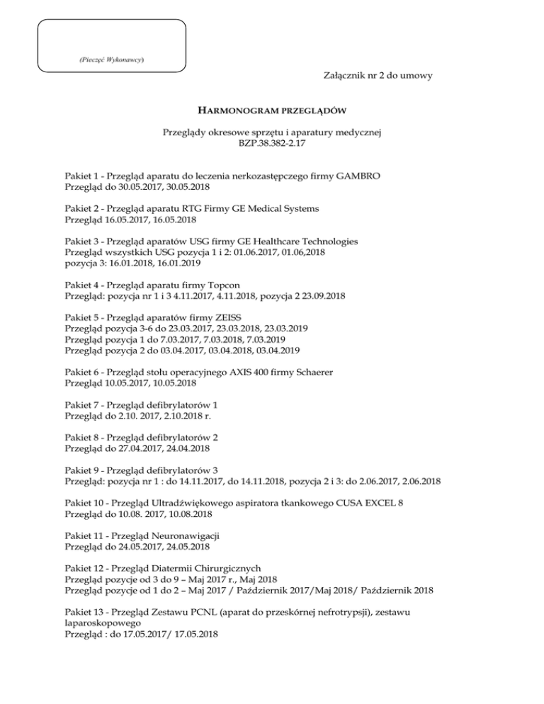 (Pieczęć Wykonawcy) Załącznik nr 2 do umowy HARMONOGRAM PRZEGLĄDÓW Przeglądy okresowe sprzętu i aparatury medycznej BZP.38.382-2.17 Pakiet 1 - Przegląd aparatu do leczenia nerkozastępczego firmy GAMBRO Przegląd do 30.05.2017, 30.05.2018 Pakiet 2 - Przegląd aparatu RTG Firmy GE Medical Systems Przegląd 16.05.2017, 16.05.2018 Pakiet 3 - Przegląd aparatów USG firmy GE Healthcare Technologies Przegląd wszystkich USG pozycja 1 i 2: 01.06.2017, 01.06,2018 pozycja 3: 16.01.2018, 16.01.2019 Pakiet 4 - Przegląd aparatu firmy Topcon Przegląd: pozycja nr 1 i 3 4.11.2017, 4.11.2018, pozycja 2 23.09.2018 Pakiet 5 - Przegląd aparatów firmy ZEISS Przegląd pozycja 3-6 do 23.03.2017, 23.03.2018, 23.03.2019 Przegląd pozycja 1 do 7.03.2017, 7.03.2018, 7.03.2019 Przegląd pozycja 2 do 03.04.2017, 03.04.2018, 03.04.2019 Pakiet 6 - Przegląd stołu operacyjnego AXIS 400 firmy Schaerer Przegląd 10.05.2017, 10.05.2018 Pakiet 7 - Przegląd defibrylatorów 1 Przegląd do 2.10. 2017, 2.10.2018 r. Pakiet 8 - Przegląd defibrylatorów 2 Przegląd do 27.04.2017, 24.04.2018 Pakiet 9 - Przegląd defibrylatorów 3 Przegląd: pozycja nr 1 : do 14.11.2017, do 14.11.2018, pozycja 2 i 3: do 2.06.2017, 2.06.2018 Pakiet 10 - Przegląd Ultradźwiękowego aspiratora tkankowego CUSA EXCEL 8 Przegląd do 10.08. 2017, 10.08.2018 Pakiet 11 - Przegląd Neuronawigacji Przegląd do 24.05.2017, 24.05.2018 Pakiet 12 - Przegląd Diatermii Chirurgicznych Przegląd pozycje od 3 do 9 – Maj 2017 r., Maj 2018 Przegląd pozycje od 1 do 2 – Maj 2017 / Październik 2017/Maj 2018/ Październik 2018 Pakiet 13 - Przegląd Zestawu PCNL (aparat do przeskórnej nefrotrypsji), zestawu laparoskopowego Przegląd : do 17.05.2017/ 17.05.2018 Pakiet 14 - Przegląd kardiostymulatorów Firmy ITAM Przegląd: pozycja 1 i 2 16.02.2019, pozycja nr 3 i 4 31.05.2017/ 31.05.2018 Pakiet 15 - Przegląd laserów Firmy KOSMED Przegląd do 28.10.2017/ 28.10.2018 Pakiet 16 - Przegląd pomp do żywienia dojelitowego Przegląd wrzesień 2017/ wrzesień 2018 Pakiet 17 - Przegląd monitora rzutu serca Firmy EDWARDS Przegląd 25.07.2017 / 25.07.2018 pozycja nr 1 15.07.2018 pozycja nr 2 Pakiet 18 - Przeglądy sterylizatorów parowych, wytwornic pary Przegląd po 800 cyklach pracy ( są to z reguły dwa przeglądy w ciągu roku - marzec/wrzesień) Pakiet 19 – Przegląd sprzętu medycznego Firmy 3 M POLAND Przegląd co pół roku (październik 2017 r/marzec 2018/ październik 2018/ marzec 2017) Pakiet 20 - Przegląd aparatów pirometrycznych Przegląd maj 2017/maj2018 r. Pakiet 21 - Przegląd wag niemowlęcych, medycznych, krzesełkowej Legalizacja Wag MAJ 2016 r Legalizacja Wag czerwiec Legalizacja Wag PAŹDZIERNIK 2016 Pakiet 22 - Przegląd kolumn anestezjologicznych i chirurgicznych Przegląd marzec 2018 r. / Pakiet 23- Przegląd sprzętu firmy Technomex Przegląd pozycja nr 1 do 20.05.2017, 20.05.2018, pozycje 2-9 30.01.2018, 30.01.2019 Pakiet 24 - Przegląd Kardiotokografów Firmy Philips Przeglądy pozycje 1,3 - czerwiec 2018 Przegląd pozycja 2 czerwiec 2017/czerwiec 2018 Przegląd pozycja 4 luty 2018 Pakiet 25 – Przegląd respiratorów eVent Przegląd do 16.11.2017, 16.11.2018 Pakiet 26 – Przegląd aparatów USG Przegląd luty 2018/ luty 2019 Pakiet 27 – Przegląd aparatów USG dopplerowskich Przegląd do 10.01.2018/ 10.01.2019 Pakiet 28 – Przegląd lampy Operacyjnych z Bloku Operacyjnego Przegląd do 10.01.2018/ 10.01.2019 Pakiet 29 – Przegląd Stołów Operacyjnych STERIS z Bloku Operacyjnego Przegląd do 10.01.2018/ 10.01.2019 Pakiet 30 – Przegląd aparatów BTL z Pracowni Fizjoterapii Przegląd styczeń 2018/ styczeń 2019 Pakiet 31 – Przegląd urządzeń INTERDYNAMIC ID 4 C Przegląd luty 208/luty 2019 Pakiet 32 – Przegląd aparatów KRIOPOL R 60 Przegląd luty 208/luty 2019 Pakiet 33 – Przegląd strzykawki automatycznej z Tomografu Komputerowego Przegląd styczeń 208/styczeń 2019 Pakiet 34 – Przegląd aparatów do badania słuchu u noworodków Przegląd pozycja nr 2 – luty 2018/ luty 2019 Przegląd pozycja nr 1 - grudzień 2017/ grudzień 2018 Pakiet 35 – Przegląd aparatu POLARIS 2 wraz ze skanerem Luty 2018/luty 2019 Pakiet 36 – Przegląd aparatu RTG firmy Kosmed Przegląd styczeń 2018/styczeń 2019 Pakiet 37 - Przegląd lasera okulistycznego Przegląd listopad 2018 Pakiet 38 - Przegląd urządzeń do cyfrowej obróbki zdjęć RTG firmy KODAK Przegląd pozycja nr 1 i 2: lipiec 2017/styczeń 2018/ lipiec 2018/ styczeń 2019 pozycja nr 3: styczeń 2018/ styczeń 2019 Pakiet 39- Przegląd śródoperacyjnych aparatów RTG z ramieniem „C” firmy ZIEM Przegląd pozycja nr 1 i 2: wrzesień 2017, wrzesień 2018 Pakiet 40 - Przeglądy diatermii chirurgicznych firmy ERBE Przegląd pozycja nr 1 -3 : do 7.06.2017/7.06.2018 pozycja nr 4: do 10.05.2018 Pakiet 41 - Przegląd diatermii chirurgicznych firmy MED. Przegląd do 10.08.2017/10.08.2018 Pakiet 42 - Przegląd aparatu do znieczulenia ogólnego firmy OHMEDA Przegląd do 28.04.2017/28.04.2018 Pakiet 43 - Przegląd aparatu nerkozastępczego firmy FRESENIUS Przegląd luty 2019 Pakiet 44 - Przegląd respiratorów pediatrycznych firmy HAMILTON MEDICAL Przegląd: czerwiec 2017/ czerwiec 2018 Pakiet 45 - Przegląd Stacji Uzdatniania Wody Przegląd maj 2017/maj 2018 Pakiet 46 - Przegląd diatermii chirurgicznych, przystawki argonowej Przegląd lipiec 2017/lipiec 2018 Pakiet 47 - Przegląd aparatu RTG MUX Przegląd październik 2017/ październik 2018 Pakiet 48 - Przegląd aparatu RTG Mobilett Przegląd pczerwiec 2017/ czerwiec 2018 Pakiet 49 -Przegląd zestawu laparoskopowego i endoskopowego Firmy Aesculap Przegląd kwiecień 2018 Pakiet 50 - Przegląd aparatów USG 1 Przegląd sierpień 2017/sierpień 2018 Pakiet 51 - Przegląd aparatów USG 2 Przegląd listopad 2017/listopad 2018 Pakiet 52 - Przegląd aparatów USG 3 Przegląd grudzień 2017/ grudzień 2018 Pakiet 53- Przegląd kardiomonitorów Goldway G40 i centrali monitorującej Przegląd październik 2017/ paździer