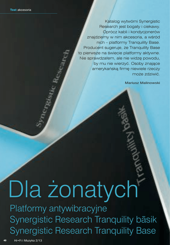Test akcesoria Katalog wytwórni Synergistic Research jest bogaty i ciekawy. Oprócz kabli i kondycjonerów nich – platformy Tranquility Base. 40 Test akcesoria Drugą zaletą aktywnej ochrony jest eliminowanie zakłóceń, jakie powstają w każdym układzie elektronicznym między jego własnymi komponentami. Szef Synergistica, Ted Danney, ten rodzaj wpływu aktywnej ochrony nazwał „kondycjonowaniem” dźwięku. Platformy w branży hi-fi kojarzą się z funkcją antywibracyjną. „Gołe” Tranquility Base jej nie mają. Jednak w wyposażeniu znajdziemy tzw. MIG-i (MIG – Mechanical Interface Grounding) – czyli zestaw nóżek-podkładek, które, jak sama nazwa wskazuje, będą chronić urządzenie przed drganiami. Biorąc pod uwagę fakt, że Synergistic oferuje ochronę przed trzema rodzajami zakłóceń (radiowymi, elektromagnetyczny- la porządku uściślijmy, że „Tranquility Base” to nazwa serii trzech produktów, z tym że środkowy nazywa się identycznie jak cała linia. Do recenzji trafiły dwie platformy: najtańsza Tranquility bāsik oraz właśnie środkowa – Tranquility Base. Komplet uzupełnia flagowiec: Tranquility Base XL. Platformy różnią się między sobą nie tylko wielkością, ale i detalami technicznymi. No i cenami – niebotycznymi. Bāsik kosztuje prawie 6 tys., Base – prawie 12 tys., a Base XL – niemal 18 tys. zł! Platformy znajdą zastosowanie przede wszystkim przy źródłach dźwięku i obrazu (odtwarzacze, przetworniki, transporty, gramofony), serwerach i twardych dyskach. Producent deklaruje, że poprawa brzmienia nastąpi także w przypad- ku wzmacniaczy, tunerów telewizyjnych czy zewnętrznych zwrotnic. Budowa Po co podłączać platformę do prądu? To dziwne pytanie znajduje prostą odpowiedź: w tym samym celu, w jakim podłączamy do prądu kable (no dobrze, tylko niektóre) – aby uzyskać aktywne ekranowanie. Dociekając dalej – ekranowanie kabla chroni znajdujące się w jego bezpośrednim otoczeniu przewodniki. Ekranowanie platformy natomiast (lepsze będzie tu sformułowanie: aktywna ochrona) polega na wytwarzaniu pola elektromagnetycznego, które swoim zasięgiem obejmie układ elektroniczny stojącego na niej urządzenia i ochroni je przed wpływem zakłóceń typu EMI (elektromagnetycznych) i RFI (radiowych). mi i mechanicznymi) – wygórowane ceny platform znajdują jakieś uzasadnienie. Boki wszystkich Tranquility otacza aluminiowy pas. Ich środek ma budowę warstwową. Na górze znajduje się laminat. W środku mamy moduł Active EM Cell (czyli obwód aktywnej ochrony). Jego nazwa wskazuje, że ten sam element (choć nie wiadomo, czy w identycznej 41 Test akcesoria postaci) był już wykorzystywany w kablach Galileo oraz kondycjonerach PowerCell. Dolną warstwę stanowi płaszczyzna ekranu pasywnego. W droższej z recenzowanych platform znajdziemy z tyłu trzy gniazda: czarne, czerwone i zielone. W czarne wkładamy tulejkę Enigma Bullet, która zamyka obwód aktywnej ochrony. Ponadto, analogicznie jak w przypadku lejkę – zrezygnowano z opcji uziemienia. To nie koniec różnic. W bāsik są kanciaste rogi, w Base – zaokrąglone. Bāsik ma siedmiowarstwowy laminat, Base – dziewięciowarstwowy. No i Base jest większa i grubsza oraz posiada dwa zestawy MIG-ów, a bāsik – tylko jeden. Obie platformy są wyposażone w „aktywną kontrolę przepływu sygnału” (można się domyślać, że to wspomnia- „pinpoint” – tam przedniego MIG-a stawiamy zaokrągleniem do góry, a tylne odwrotnie. Metodą prób i błędów wybieramy wariant, który będzie nam bardziej odpowiadał. Do platformy dołączono instrukcję, która koncentruje się na różnicach pomiędzy konfiguracją ustawienia MIG-ów (wspomniane ambient i pinpoint). Krok po kroku opisuje, co należy zrobić, aby uzyskać kombinację najbardziej zadowalającą, a szczególnie, w jakiej kolejności izolować poszczególne urządzenia w systemie. Ostatnim krokiem, sugerowanym przez producenta, jest przywołanie małżonki, która po wejściu powinna zawołać: „nasz system brzmi świetnie z nowymi MIG-ami”. Wtedy należy po prostu odpowiedzieć: „O tak, kochanie, tak”. Aby się nic nie pomyliło, krok ten, podobnie jak konfiguracje MIG-ów, został zilustrowany rysunkiem. Żona powinna być w bikini. Większość znanych mi produktów Synergistica ma dwie cechy wspólne. Po pierwsze, budzą westchnienie w rodzaju: „ależ znowu wymyślili”. Po drugie, świetnie działają. Nie inaczej jest w przypadku platform Tranquility Base. kabli Synergistica, wymieniając tulejki, możemy modyfikować dźwięk. Z tym że w odróżnieniu od kabli, tu wybieramy nie między trzema tulejkami (srebrną, szarą i czarną), lecz między dwiema (szarą i srebrną). Przypomnijmy, że ze srebrną brzmienie ma być, wedle sugestii producenta, nieco jaśniejsze. Kształt tulejek dostarczanych z platformą też jest inny niż tych dołączanych do kabli. Są krótsze, a wtyk został zamocowany prostopadle. Niebieska dioda świeci tak samo. W zielone gniazdko wkładamy wtyk uziemienia, który cieniutkim drucikiem łączy się z okazałą wtyczką sieciową. Czerwone gniazdko przeznaczono dla zasilacza, dzięki któremu zostaje aktywowana ochrona platformy. Zasilacz jest identyczny jak w przypadku firmowych kabli. Należy pamiętać o prawidłowej polaryzacji jego wtyczki. O to zadbał (po raz kolejny) polski dystrybutor, bo producent w instrukcji oraz w swoich materiałach kwestię tę pomija. Platforma Traquility bāsik ma tylko dwa gniazda, oba czarne. Do jednego wkładamy zasilacz; do drugiego tu42 ne już „kondycjonowanie”), z tym że w tańszej producent oferuje poziom 1, a w droższej – poziom 2. Niestety, nie wiadomo, o co z tymi poziomami chodzi. Najprawdopodobniej o parametry wytwarzanego pola elektromagnetycznego – ale to tylko spekulacja. Jeden zestaw MIG-ów składa się z trzech sztuk. Aby uzyskać optymalny efekt, należy zastosować dwa