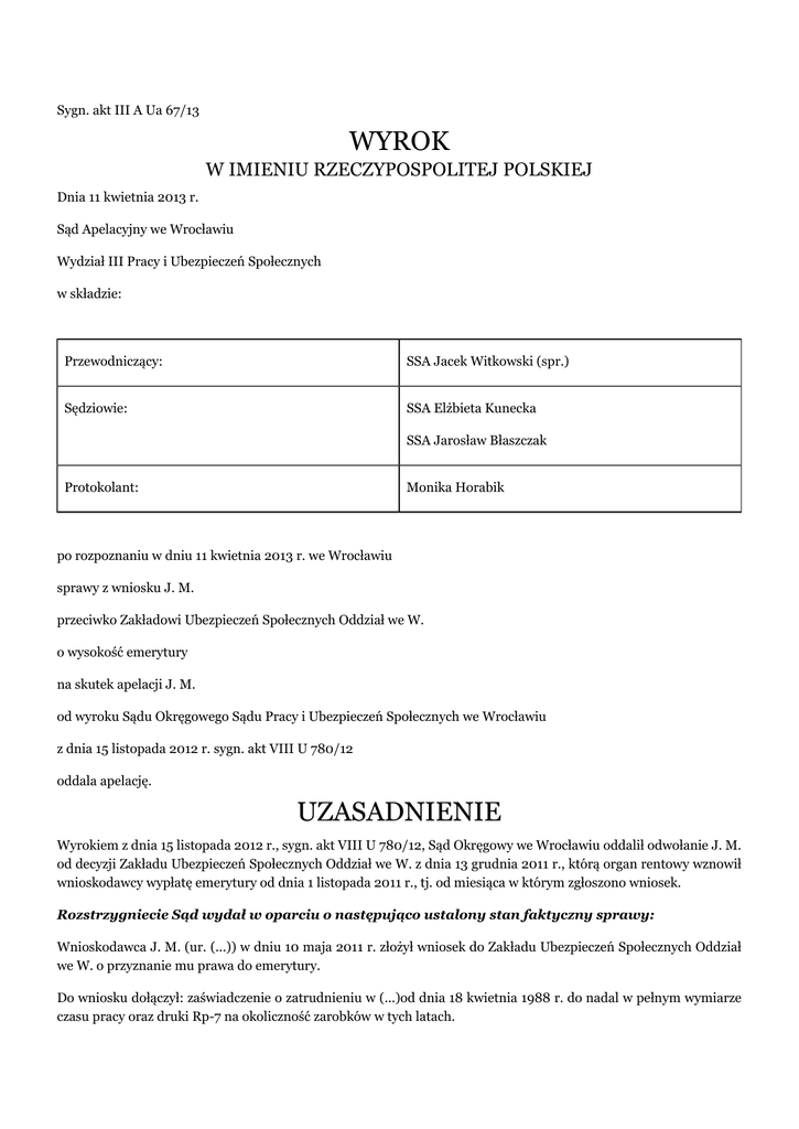 Sygn. akt III A Ua 67/13 WYROK W IMIENIU RZECZYPOSPOLITEJ POLSKIEJ Dnia 11 kwietnia 2013 r. Sąd Apelacyjny we Wrocławiu Wydział III Pracy i Ubezpieczeń Społecznych w składzie: Przewodniczący: SSA Jacek Witkowski (spr.) Sędziowie: SSA Elżbieta Kunecka SSA Jarosław Błaszczak Protokolant: Monika Horabik po rozpoznaniu w dniu 11 kwietnia 2013 r. we Wrocławiu sprawy z wniosku J. M. przeciwko Zakładowi Ubezpieczeń Społecznych Oddział we W. o wysokość emerytury na skutek apelacji J. M. od wyroku Sądu Okręgowego Sądu Pracy i Ubezpieczeń Społecznych we Wrocławiu z dnia 15 listopada 2012 r. sygn. akt VIII U 780/12 oddala apelację. UZASADNIENIE Wyrokiem z dnia 15 listopada 2012 r., sygn. akt VIII U 780/12, Sąd Okręgowy we Wrocławiu oddalił odwołanie J. M. od decyzji Zakładu Ubezpieczeń Społecznych Oddział we W. z dnia 13 grudnia 2011 r., którą organ rentowy wznowił wnioskodawcy wypłatę emerytury od dnia 1 listopada 2011 r., tj. od miesiąca w którym zgłoszono wniosek. Rozstrzygniecie Sąd wydał w oparciu o następująco ustalony stan faktyczny sprawy: Wnioskodawca J. M. (ur. (...)) w dniu 10 maja 2011 r. złożył wniosek do Zakładu Ubezpieczeń Społecznych Oddział we W. o przyznanie mu prawa do emerytury. Do wniosku dołączył: zaświadczenie o zatrudnieniu w (...)od dnia 18 kwietnia 1988 r. do nadal w pełnym wymiarze czasu pracy oraz druki Rp-7 na okoliczność zarobków w tych latach. W oparciu o powyższe dokumenty Zakład wydał decyzję w dniu 21 września 2011 r. przyznającą wnioskodawcy prawo do emerytury od dnia 07 lipca 2011 r., tj. od osiągnięcia wieku emerytalnego. Wydając powyższą decyzję organ rentowy nie uwzględnił do jej wysokości okresu i zarobków w Milicji Obywatelskiej, z uwagi na przyznane tam świadczenie emerytalne. Decyzja jest prawomocna, bowiem dopiero w dniu 18 listopada 2011 r. wnioskodawca napisał, że nie zgadza się z decyzją i przedłożył w ZUS-ie zaświadczenie służby w okresie od 01.09.1968 r. do 14.04.1988 r. i drugi Rp-7 na okoliczność uzyskiwanych w tym czasie zarobków. W dniu 21 listopada 2011 r. Zakład Ubezpieczeń Społecznych wydał decyzję przeliczającą emeryturę wnioskodawcy od dnia 01.11.2011 r., tj. od dnia, w którym zgłoszono wniosek. W dniu 21 listopada 2011 r. Zakład Ubezpieczeń Społecznych wydał kolejną decyzję, w której wnioskodawca został powiadomiony o nie zaliczeniu okresów pełnionej w Polsce służby w Milicji Obywatelskiej, ponieważ z tego tytułu jest już ustalone prawo do świadczeń pieniężnych /od tej decyzji wnioskodawca nie wnosił odwołania/. W dniu 25 listopada 2011 r. wnioskodawca złożył wniosek do Zakładu Ubezpieczeń Społecznych o wypłatę emerytury od dnia 01.10.2011 r. Pismem z dnia 05.12.2011 r. Zakład Emerytalny Ministerstwa Spraw Wewnętrznych i Administracji poinformował Zakład Ubezpieczeń Społecznych, że z dniem 01.12.2011 r. wstrzymał wypłatę policyjnej emerytury (...)dla J. M. z uwagi na pobieranie korzystniejszego świadczenia z Zakładu Ubezpieczeń Społecznych. Decyzją z dnia 13 grudnia 2012 r. Zakład Ubezpieczeń Społecznych Oddział we W. wznowił wnioskodawcy J. M. wypłatę emerytury od dnia 01 listopada 2011 r., tj. od miesiąca, w którym zgłoszono wniosek. Wnioskodawca J. M. wniósł odwołanie od decyzji do Sądu Okręgowego we Wrocławiu. W odwołaniu podał, że nie zgadza się z wyliczeniem wysokości emerytury, ponieważ dostarczył do ZUS zaświadczenia Rp-7 o wysokości dochodów za lata od 01.09.1968 r. do 14.04.1988 r. i nie uwzględniono tego okresu ani dostarczonych za ten okres zarobków, do wysokości emerytury. W toku postępowania sądowego strony nie składały wniosków dowodowych. Wnioskodawca, na rozprawie w dniu 15 listopada 2012r. /k.15 a.s./ podał, że ma przyznaną emeryturę policyjną, która jest zawieszona, z uwagi na pobieranie emerytury ZUS. Wnioskodawca wniósł o doliczenie do wysokości emerytury jego okresu pracy w milicji. Podał, że czuje się pokrzywdzony, bo pracował 20 lat w milicji, a ma tak niską emeryturę. Przed Sądem Okręgowym toczyło się postępowanie o ustalenie wartości kapitału początkowego wnioskodawcy, które było przedmiotem rozpoznania w prawomocnie zakończonej sprawie o sygn. akt VIII U 646/12. Do wartości kapitału początkowego również nie zostały doliczone dochody za okres służby wnioskodawcy w organach Milicji Obywatelskiej. Wobec tak poczynionych ustaleń faktycznych w sprawie, Sąd orzekł, że odwołanie wnioskodawcy nie zasługuje na uwzględnienie. Sąd powołał treść art. 5 ust. 2a w zw. z art. 2 ust. 2 ustawy z dnia 17 grudnia 1998 r. (Dz. U. z 2009 r. nr 153, poz. 1227 ze zm.), zgodnie z którym okresów pełnionej w Polsce służby w Policji /Milicji Obywatelskiej/ nie uwzględnia się przy ustalaniu prawa do emerytury i renty oraz obliczaniu ich wysokości, jeżeli z ich tytułu ustalono prawo do świadczeń pieniężnych określonych w przepisach o zaopatrzeniu emerytalnym osób wymienionych w cytowanych wyżej przepisach. Sąd podkreślił, że w sprawie okolicznością bezsporną jest fakt przyznania wnioskodawcy i pobierania emerytury policyjnej, która jest obecnie zawieszona. Z tego też względu Sąd uznał, że Zakład Ubezpieczeń Społecznych Oddział we W. wydając decyzję z dnia 13 grudnia 2011 r. postąpił prawidłowo i zgodnie z cytowanymi wyżej przepisami prawa. Tym samym odwołanie wnioskodawcy, jako niezasadne, Sąd oddalił na mocy art. 47714 § 1 kpc. Z wyrokiem nie zgodził się wnioskodawca wywodząc apelację i zaskarżając wyrok w całości. Apelujący zarzucił Sądowi, że nie uwzględnił on 20 lat służby w organach Milicji Obywatelskiej i bezkrytycznie przyznał słuszność Zakładowi Ubezpieczeń Społecznych. Wnioskodawca wskazał, że w chwili obecnej pobiera emeryturę cywilną do ustalenia której przyjęto tylko 28 lat pracy, natomiast nie uwzględniono 20 lat pracy w Milicji. W zwi