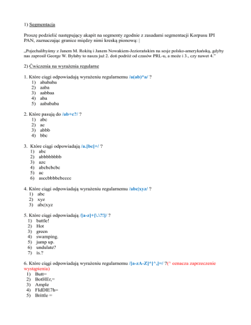 1) Segmentacja Proszę podzielić następujący akapit na segmenty zgodnie z zasadami segmentacji Korpusu IPI PAN, zaznaczając granice między nimi kreską pionową: | „Pojechalibyśmy z Janem M. Rokitą i Janem Nowakiem-Jeziorańskim na sesje polsko-amerykańską, gdyby nas zaprosił George W. Byłaby to nasza już 2. doń podróż od czasów PRL-u, a może i 3., czy nawet 4.” 2) Ćwiczenia na wyrażenia regularne 1. Które ciągi odpowiadają wyrażeniu regularnemu /a(ab)*a/ ? 1) abababa 2) aaba 3) aabbaa 4) aba 5) aabababa 2. Które pasują do /ab+c?/ ? 1) abc 2) ac 3) abbb 4) bbc 3. Które ciągi odpowiadają /a.[bc]+/ ? 1) abc 2) abbbbbbbb 3) azc 4) abcbcbcbc 5) ac 6) asccbbbbcbcccc 4. Które ciągi odpowiadają wyrażeniu regularnemu /abc|xyz/ ? 1) abc 2) xyz 3) abc|xyz 5. Które ciągi odpowiadają /[a-z]+[\.\?!]/ ? 1) battle! 2) Hot 3) green 4) swamping. 5) jump up. 6) undulate? 7) is.? 6. Które ciągi odpowiadają wyrażeniu regularnemu /[a-zA-Z]*[^,]=/ ?(^ oznacza zaprzeczenie wystąpienia) 1) Butt= 2) BotHEr,= 3) Ample 4) FIdDlE7h= 5) Brittle = 6) Other.= 7. Które ciągi odpowiadają wyrażeniu regularnemu /[a-z][\.\?!]\s+[A-Z]/ ? (\s oznacza spację albo tabulator) 1) A. B 2) c! d 3) e f 4) g. H 5) i? J 6) k L 8. Które ciągi odpowiadają wyrażeniu regularnemu /(very )+(fat )?(tall|ugly) man/ ? 1) very fat man 2) fat tall man 3) very very fat ugly man 4) very very very tall man 9. Które ciągi odpowiadają wyrażeniu regularnemu /<[^>]+>/ ? 1) <an xml tag> 2) <opentag> <closetag> 3) </closetag> 4) <> 5) <with attribute=”77”>