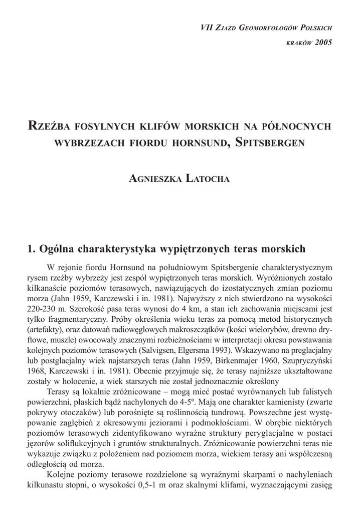 VII Zjazd Geomorfologów Polskich kraków Rzeźba fosylnych 2005 klifów morskich na północnych wybrzezach fiordu hornsund, Spitsbergen Agnieszka Latocha 1. Ogólna charakterystyka wypiętrzonych teras morskich W rejonie fiordu Hornsund na południowym Spitsbergenie charakterystycznym rysem rzeźby wybrzeży jest zespół wypiętrzonych teras morskich. Wyróżnionych zostało kilkanaście poziomów terasowych, nawiązujących do izostatycznych zmian poziomu morza (Jahn 1959, Karczewski i in. 1981). Najwyższy z nich stwierdzono na wysokości 220-230 m. Szerokość pasa teras wynosi do 4 km, a stan ich zachowania miejscami jest tylko fragmentaryczny. Próby określenia wieku teras za pomocą metod historycznych (artefakty), oraz datowań radiowęglowych makroszczątków (kości wielorybów, drewno dryftowe, muszle) owocowały znacznymi rozbieżnościami w interpretacji okresu powstawania kolejnych poziomów terasowych (Salvigsen, Elgersma 1993). Wskazywano na preglacjalny lub postglacjalny wiek najstarszych teras (Jahn 1959, Birkenmajer 1960, Szupryczyński 1968, Karczewski i in. 1981). Obecnie przyjmuje się, że terasy najniższe ukształtowane zostały w holocenie, a wiek starszych nie został jednoznacznie określony Terasy są lokalnie zróżnicowane – mogą mieć postać wyrównanych lub falistych powierzchni, płaskich bądź nachylonych do 4-5º. Mają one charakter kamienisty (zwarte pokrywy otoczaków) lub porośnięte są roślinnością tundrową. Powszechne jest występowanie zagłębień z okresowymi jeziorami i podmokłościami. W obrębie niektórych poziomów terasowych zidentyfikowano wyraźne struktury peryglacjalne w postaci jęzorów soliflukcyjnych i gruntów strukturalnych. Zróżnicowanie powierzchni teras nie wykazuje związku z położeniem nad poziomem morza, wiekiem terasy ani współczesną odległością od morza. Kolejne poziomy terasowe rozdzielone są wyraźnymi skarpami o nachyleniach kilkunastu stopni, o wysokości 0,5-1 m oraz skalnymi klifami, wyznaczającymi zasięg 260 Agnieszka Latocha dawnej linii brzegowej. Wychodnie skalne występują nie tylko wzdłuż krawędzi teras, ale także w obrębie ich powierzchni, obecnie jako ostańce denudacyjne, pierwotnie zaś – abrazyjne, tworzące dawniej szkierowe wybrzeże, analogiczne do obserwowanego współcześnie w tym rejonie. Skalne ostańce – zarówno zwarte ściany skalne związane z dawną klifową linią brzegową, jak i izolowane skałki czy stoliwa, których powierzchnie nawiązują do starszych poziomów terasowych, stanowią charakterystyczny rys rzeźby w otoczeniu Hornsundu. Rzeźbę tę można określić jako odziedziczoną, reprezentującą fosylne wybrzeża szkierowe w obrębie różnowiekowych poziomów teras morskich (Migoń 1997, 2004). 2. Charakterystyka rzeźby fosylnych klifów morskich Rzeźba fosylnych ostańców abrazyjnych na wypiętrzonych terasach morskich w rejonie Hornsundu jest bardzo zróżnicowana – obok form o żywych, ostrokrawędzistych kształtach występują formy znacznie łagodniejsze, o obłych, zaokrąglonych konturach. Ściany z odsłoniętą powierzchnią litej skały sąsiadują z powierzchniami całkowicie zarośniętymi przez zwartą pokrywę porostów, a miejscami także mchów. Powierzchnie ostańców na niewielkich przestrzeniach zmieniają charakter od masywnych (gęstość spękań poniżej 10 m/m²) do silnie spękanych, gdzie gęstość spękań wynosi powyżej 50 m/m². Powierzchnie skalne mogą być zarówno gładkie, jak i z licznymi nierównościami i zagłębieniami, wykorzystywanymi współcześnie najczęściej przez roślinność. U podnóży licznych klifów powstały gruzowiska i stożki usypiskowe o wysokościach od 0,5 do 1,5 m, zawierające gruz skalny różnych rozmiarów (maksymalnie o długości do 1 m). Współcześnie formy te są jednak na ogół nieaktywne, najczęściej z rozwiniętą pokrywą porostowo-mszaną. Wysokość klifów wynosi od 1 do 6 m, natomiast długość od 10 do 60 m. Ściany skalne mogą mieć przebieg wyrównany, w przybliżeniu równoległy do współczesnej linii brzegowej. Miejscami jednak ich układ staje się bardziej skomplikowany, z licznymi wcięciami i zakolami, nawiązującymi do dawnego ukształtowania brzegu z zatokami i cyplami. W obrębie spłaszczeń fosylnych teras, ostańce abrazyjno -denudacyjne tworzą eksponowane, izolowane formy, które w zależności od rozmiarów można określić mianem baszt, murów lub stoliw skalnych. Charakterystyczna dla ostańców skalnych jest powszechnie występująca dwudzielność cech ich powierzchni. Wyraża się ona najczęściej obecnością zaokrąglonych, obłych krawędzi w górnej części klifu, z pokrywą roślinną, podczas gdy dolne odcinki klifu są zdecydowanie bardziej ostrokrawędziste, nie porośnięte, lokalnie ze śladami odpadania i gruzowymi usypiskami u podstawy. Typowe dla tych części klifu jest także pionowe podcięcie ściany skalnej u podstawy, sięgające do wysokości 0,4-1,2 m. W przypadku niektórych klifów sytuacja jest odwrotna i dolna ich część ma wyraźnie złagodzone kształty, natomiast wyższa odznacza się większą ostrością i świeżością formy. Oba typy dwudzielnego zróżnicowania klifów stwierdza się także w poziomie, na różnych odcinkach klifu. Wokół ostańców mogą występować pasy gruzu i rumowisk (o maksymalnej szerokości do kilku metrów) lub podnóże klifu może bezpośrednio graniczyć z pokrywą Rzeźba fosylnych klifów morskich na północnych wybrzezach fiordu... 261 żwirową dawnej plaży. Miejscami otoczenie wychodni porośnięte jest zwartą pokrywą roślinności tundrowej. Cechą charakterystyczną gruzu usypiskowego jest ostrokrawędzistość kształtów, utrzymująca się nawet jeśli powierzchnia skalna, z której gruz ten pochodzi, jest silnie zarośnięta, zaokrąglona i bez śladów świeżych odspojeń. 3. Uwarunkowania zróżnicowania rzeźby fosylnych klifów morsk