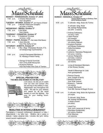 MONDAY - PONIEDZIAŁEK, October 3rd, 2016 7:00 a.m. † Charles Mieszkowski from daughters TUESDAY - WTOREK, October 4th, St. Francis of Assisi 7:00 p.m. † Michał i Katarzyna Grząśko od córki z rodziną WEDNESDAY - ŚRODA, October 5th 7:00 a.m. † Dot Rose from friends THURSDAY - CZWARTEK, October 6th 7:00 a.m. † Waldemar Chrobak od żony i córki FRIDAY - PIĄTEK, October 7th, Our Lady of the Rosary 7:00 a.m. † Jean Sikorski from Pat, Kathy & Ted SATURDAY - SOBOTA, October 8th 7:00 a.m. † Rev. Msgr. Władysław Nowicki, P.A. od wdzięcznego wychowanka 5:00 p.m. SUNDAY - NIEDZIELA, October 9th Twenty Eighth Sunday in Ordinary Time XXVIII Niedziela Zwykła 8:00 a.m. O zdrowie i błog. Boże dla Jadwigi Radgowskiej od córki z rodziną † Andrzej Dzikiewicz od żony i córki † Libert Potocki od szwagra † Edmund Bielski od rodziny Słabych † Krystyna Podraza od Elżbiety Dzikiewicz † Zofia Domżalska od rodziny † Julianna i Stanisław Radgowski od syna z rodziną † Janusz Radgowski od brata z rodziną † Genowefa Górka od rodziny Living & Deceased Members of St. Hedwig’s Parish Family † George & Harriet Kaminski from Chris & Bill Muszynski † Krystyna Podraza from the Polish Arts Club of Trenton O zdrowie i błog. Boże dla Tomka 9:30 a.m. Living & Deceased Members of the Rosary Society Health & Blessings for Julia from grandparents † Patricia Grenda from Joseph & family † Barbara Kramarz from Walt, forever † Edward L. Taborek od rodziny † Joseph Bernhardt from Bill, Denise & Megan Ervine SPECIAL PRAYER FOR THE MEN AND WOMEN IN THE MILITARY Lord Jesus, we ask you to watch over our men and women who are serving in the military in Iraq, Afghanistan and throughout the world. We ask for your wisdom and peace for all the world leaders to end the fighting. We pray for your healing touch. AMEN MODLITWA W INTENCJI ŻOŁNIERZY Pamiętajmy o naszych żołnierzach służących w Iraku i Afganistanie i nie tylko tam. Módlmy się o pokój w świecie i łaskę ukojenia bólu i smutku dla tych, którzy stracili swoich najbliższych. 11:00 a.m. O zdrowie i błog. Boże dla Agnieszki od wujka O zdrowie i błog. Boże dla Jadwigi Włodkowskiej z okazji urodzin od dzieci † Józef Fryc from John Lazarczyk & family † Stanisław Kwiatkowski od rodziny Siwików † Piotr Mierzwa od rodziców XXVII NIEDZIELA ZWYKŁA - Łk 17,5-10: Apostołowie prosili Pana: Przymnóż nam wiary. Pan rzekł: Gdybyście mieli wiarę jak ziarnko gorczycy, powiedzielibyście tej morwie: Wyrwij się z korzeniem i przesadź się w morze, a byłaby wam posłuszna. Kto z was, mając sługę, który orze lub pasie, powie mu, gdy on wróci z pola: Pójdź i siądź do stołu? Czy nie powie mu raczej: Przygotuj mi wieczerzę, przepasz się i usługuj mi, aż zjem i napiję się, a potem ty będziesz jadł i pił? Czy dziękuje słudze za to, że wykonał to, co mu polecono? Tak mówcie i wy, gdy uczynicie wszystko, co wam polecono: Słudzy nieużyteczni jesteśmy; wykonaliśmy to, co powinniśmy wykonać. Liturgia dzisiejsza jest ześrodkowana na temacie wiary. Prorok Habakuk żali się wobec Boga na opłakane warunki swojego narodu. Wewnątrz nieprawość, Izrael bowiem jest niewierny swojemu Bogu, a na zewnątrz przemoc i gwałt, bo kraj niszczą wrogowie. Stali się oni narzędziami sprawiedliwości Bożej, aby pokarać Żydów, chociaż byli nie mniejszymi niż oni grzesznikami. Jest to zgorszenie płynące ze zwycięstwa zła, które zdaje się niszczyć wszelkie dobro i pociągać do upadku nawet dobrych. Bóg na koniec odpowiada swojemu prorokowi przez widzenie, które ten ma jasno opisać dla nauki tych wszystkich, którzy dopiero przyjdą; Bóg zachęca do wytrwałości, ponieważ sprawiedliwości stanie się zadość, lecz w swoim czasie: „Jeśli się opóźnia, ty jej oczekuj, bo w krótkim czasie przyjdzie niezawodnie”, bo „oto zginie ten, co jest ducha nieprawego, a sprawiedliwy żyć będzie dzięki swej wierności”. Nauka dotyczy tak Izraelity, jak i chrześcijanina — wszystkich wierzących. Ważna w każdej okoliczności życia poszczególnych ludzi, narodów, Kościoła. Nawet kiedy wszystko tak się rozwija, jak gdyby Bóg tego nie widział lub nie istniał, trzeba być mocnym w wierze. Bóg może opóźniać swoją pomoc, lecz jest pewne, że wesprze tych, którzy wierzą w Niego i do Niego się uciekają. „Bóg z tymi, którzy Go miłują, współdziała we wszystkim dla ich dobra”. Drugie czytanie rozwija inny aspekt wiary: odważne świadectwo dawane Chrystusowi i Ewangelii. Św. Paweł pisze do Tymoteusza: „Nie wstydź się świadectwa Pana naszego ani mnie, Jego więźnia, lecz weź udział w trudach i przeciwnościach znoszonych dla Ewangelii według mocy Boga”. Niezłomny Apostoł, który dla wiary podejmował walki i ryzyka niezliczone, a uważał za wielką chlubę, że jest więziony dla Chrystusa, słusznie mógł zachęcać swojego ucznia i współpracownika, aby się nie lękał z powodu trudności, lecz cierpiał razem z nim dla Ewangelii. Chrześcijanin, który nie jest gotowy cierpieć dla swojej wiary, nie będzie mógł oprzeć się napaści nieprzyjaciół. To ludzka rzecz, że w pewnych okolicznościach rodzi się bojaźń lub strach, lecz zostaną one zwyciężone „według mocy Boga” i „z pomocą Ducha Świętego, który w nas mieszka”. Duch istotnie został dany wiernym, aby podtrzymywać ich słabość i uczynić ich zdolnymi wyznawać imię Pana. Rozważania te samorzutnie rodzą modlitwę, jaką zawiera dzisiejsza ewangelia: „Panie, przymnóż nam wiary!” By wierzyć bez wahania i pozostać wiernym Bogu i w przeciwnościach, i w czasie walk toczonych przeciw wierze, trzeba wiary wytrwałej, mocnej, jakiej tylko Bóg może udzielić. Apostołom, którzy kiedyś prosili o nią, Jezus mówił: „Gdybyście mieli wiarę jak ziarno gorczycy, powiedzielibyście tej morwie: Wyrwij się z korzeniem i przesadź się w morze, a był