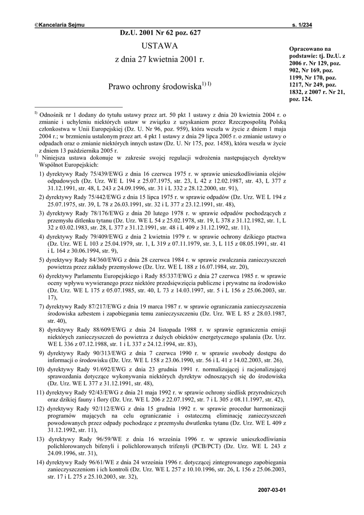 ©Kancelaria Sejmu s. 1/234 Dz.U. 2001 Nr 62 poz. 627 USTAWA Opracowano na podstawie: tj. Dz.U. z 2006 r. Nr 129, poz. 902, Nr 169, poz. 1199, Nr 170, poz. 1217, Nr 249, poz. 1832, z 2007 r. Nr 21, poz. 124. z dnia 27 kwietnia 2001 r. Prawo ochrony środowiska1) I) I) Odnośnik nr 1 dodany do tytułu ustawy przez art. 50 pkt 1 ustawy z dnia 20 kwietnia 2004 r. o zmianie i uchyleniu niektórych ustaw w związku z uzyskaniem przez Rzeczpospolitą Polską członkostwa w Unii Europejskiej (Dz. U. Nr 96, poz. 959), która weszła w życie z dniem 1 maja 2004 r.; w brzmieniu ustalonym przez art. 4 pkt 1 ustawy z dnia 29 lipca 2005 r. o zmianie ustawy o odpadach oraz o zmianie niektórych innych ustaw (Dz. U. Nr 175, poz. 1458), która weszła w życie z dniem 13 października 2005 r. 1) Niniejsza ustawa dokonuje w zakresie swojej regulacji wdrożenia następujących dyrektyw Wspólnot Europejskich: 1) dyrektywy Rady 75/439/EWG z dnia 16 czerwca 1975 r. w sprawie unieszkodliwiania olejów odpadowych (Dz. Urz. WE L 194 z 25.07.1975, str. 23, L 42 z 12.02.1987, str. 43, L 377 z 31.12.1991, str. 48, L 243 z 24.09.1996, str. 31 i L 332 z 28.12.2000, str. 91), 2) dyrektywy Rady 75/442/EWG z dnia 15 lipca 1975 r. w sprawie odpadów (Dz. Urz. WE L 194 z 25.07.1975, str. 39, L 78 z 26.03.1991, str. 32 i L 377 z 23.12.1991, str. 48), 3) dyrektywy Rady 78/176/EWG z dnia 20 lutego 1978 r. w sprawie odpadów pochodzących z przemysłu ditlenku tytanu (Dz. Urz. WE L 54 z 25.02.1978, str. 19, L 378 z 31.12.1982, str. 1, L 32 z 03.02.1983, str. 28, L 377 z 31.12.1991, str. 48 i L 409 z 31.12.1992, str. 11), 4) dyrektywy Rady 79/409/EWG z dnia 2 kwietnia 1979 r. w sprawie ochrony dzikiego ptactwa (Dz. Urz. WE L 103 z 25.04.1979, str. 1, L 319 z 07.11.1979, str. 3, L 115 z 08.05.1991, str. 41 i L 164 z 30.06.1994, str. 9), 5) dyrektywy Rady 84/360/EWG z dnia 28 czerwca 1984 r. w sprawie zwalczania zanieczyszczeń powietrza przez zakłady przemysłowe (Dz. Urz. WE L 188 z 16.07.1984, str. 20), 6) dyrektywy Parlamentu Europejskiego i Rady 85/337/EWG z dnia 27 czerwca 1985 r. w sprawie oceny wpływu wywieranego przez niektóre przedsięwzięcia publiczne i prywatne na środowisko (Dz. Urz. WE L 175 z 05.07.1985, str. 40, L 73 z 14.03.1997, str. 5 i L 156 z 25.06.2003, str. 17), 7) dyrektywy Rady 87/217/EWG z dnia 19 marca 1987 r. w sprawie ograniczania zanieczyszczenia środowiska azbestem i zapobiegania temu zanieczyszczeniu (Dz. Urz. WE L 85 z 28.03.1987, str. 40), 8) dyrektywy Rady 88/609/EWG z dnia 24 listopada 1988 r. w sprawie ograniczenia emisji niektórych zanieczyszczeń do powietrza z dużych obiektów energetycznego spalania (Dz. Urz. WE L 336 z 07.12.1988, str. 1 i L 337 z 24.12.1994, str. 83), 9) dyrektywy Rady 90/313/EWG z dnia 7 czerwca 1990 r. w sprawie swobody dostępu do informacji o środowisku (Dz. Urz. WE L 158 z 23.06.1990, str. 56 i L 41 z 14.02.2003, str. 26), 10) dyrektywy Rady 91/692/EWG z dnia 23 grudnia 1991 r. normalizującej i racjonalizującej sprawozdania dotyczące wykonywania niektórych dyrektyw odnoszących się do środowiska (Dz. Urz. WE L 377 z 31.12.1991, str. 48), 11) dyrektywy Rady 92/43/EWG z dnia 21 maja 1992 r. w sprawie ochrony siedlisk przyrodniczych oraz dzikiej fauny i flory (Dz. Urz. WE L 206 z 22.07.1992, str. 7 i L 305 z 08.11.1997, str. 42), 12) dyrektywy Rady 92/112/EWG z dnia 15 grudnia 1992 r. w sprawie procedur harmonizacji programów mających na celu ograniczanie i ostateczną eliminację zanieczyszczeń powodowanych przez odpady pochodzące z przemysłu dwutlenku tytanu (Dz. Urz. WE L 409 z 31.12.1992, str. 11), 13) dyrektywy Rady 96/59/WE z dnia 16 września 1996 r. w sprawie unieszkodliwiania polichlorowanych bifenyli i polichlorowanych trifenyli (PCB/PCT) (Dz. Urz. WE L 243 z 24.09.1996, str. 31), 14) dyrektywy Rady 96/61/WE z dnia 24 września 1996 r. dotyczącej zintegrowanego zapobiegania zanieczyszczeniom i ich kontroli (Dz. Urz. WE L 257 z 10.10.1996, str. 26, L 156 z 25.06.2003, str. 17 i L 275 z 25.10.2003, str. 32), 2007-03-01 ©Kancelaria Sejmu s. 2/234 Tytuł I PRZEPISY OGÓLNE Dział I Zakres obowiązywania ustawy 15) dyrektywy Rady 96/62/WE z dnia 27 września 1996 r. w sprawie oceny i zarządzania jakością otaczającego powietrza (Dz. Urz. WE L 296 z 21.11.1996, str. 55), 16) dyrektywy Rady 96/82/WE z dnia 9 grudnia 1996 r. w sprawie kontroli zagrożeń niebezpieczeństwa poważnych awarii związanych z substancjami niebezpiecznymi (Dz. Urz. WE L 10 z 14.01.1997, str. 13 i L 345 z 31.12.2003, str. 97), 17) dyrektywy Rady 1999/13/WE z dnia 11 marca 1999 r. w sprawie ograniczenia emisji lotnych związków organicznych spowodowanej użyciem organicznych rozpuszczalników podczas niektórych czynności i w niektórych urządzeniach (Dz. Urz. WE L 85 z 29.03.1999, str. 1 i L 143 z 30.04.2004, str. 87), 18) dyrektywy Rady 1999/30/WE z dnia 22 kwietnia 1999 r. odnoszącej się do wartości dopuszczalnych dla dwutlenku siarki, dwutlenku azotu i tlenków azotu oraz pyłu i ołowiu w otaczającym powietrzu (Dz. Urz. WE L 163 z 29.06.1999, str. 41), 19) dyrektywy Parlamentu Europejskiego i Rady 1999/94/WE z dnia 13 grudnia 1999 r. odnoszącej się do dostępności dla konsumentów informacji o zużyciu paliwa i emisjach CO2 w odniesieniu do obrotu nowymi samochodami osobowymi (Dz. Urz. WE L 12 z 18.01.2000, str. 16 i L 186 z 25.07.2003, str. 34), 20) dyrektywy Parlamentu Europejskiego i Rady 2000/53/WE z dnia 18 września 2000 r. w sprawie pojazdów wycofanych z eksploatacji (Dz. Urz. WE L 269 z 21.10.2000, str. 34, L 170 z 29.06.2002, str. 81 i L 25 z 28.01.2005, str. 73), 21) dyrektywy Parlamentu Europejskiego i Rady 2000/69/WE z dnia 16 listopada 2000 r. dotyczącej wartości dopuszczalnych benzenu i tlenku węgla w otaczającym powietrzu (Dz. Urz. WE L 313 z 13.12.2000, str. 12), 22) dyrektywy Parlamentu Europejskiego i Rady 2000/76/WE z dnia 4 grudnia 2000 r. w sprawie spalania odpadów (Dz. Urz. WE L 332 z 28.12.2000, str. 91), 23) dyrektywy 