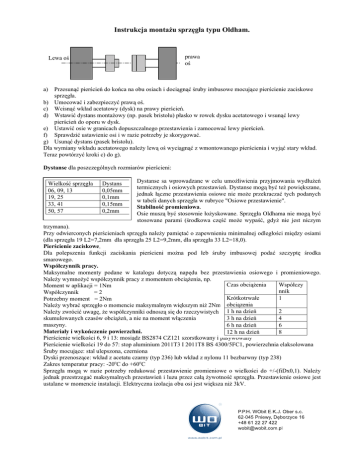 ,QVWUXNFMDPRQWD*XVSU] JáDW\SX2OGKDP /HZDR prawa R a) 3U]HVXQüSLHUFLHGRNRFDQDREXRVLDFKLGRFLJQüUXE\LPEXVRZHPRFXMFHSLHUFLHQLH]DFLVNRZH VSU] JáD b) 8PRFRZDüL]DEH]SLHF]\üSUDZR c) :FLVQüZNáDGDFHWDWRZ\G\VNQDSUDZ\SLHUFLH d) :VWDZLüG\VWDQVPRQWD*RZ\QSSDVHNEULVWROXSáDVNRZURZHNG\VNXDFHWDWRZHJRLZVXQüOHZ\ SLHUFLHGRRSRUXZG\VN e) 8VWDZLüRVLHZJUDQLFDFKGRSXV]F]DOQHJRSU]HVWDZLHQLDL]DPRFRZDüOHZ\SLHUFLH f) 6SUDZG]LüXVWDZLHQLHRVLLZUD]LHSRWU]HE\MHVNRU\JRZDü g) 8VXQüG\VWDQVSDVHNbristolu). 'ODZ\PLDQ\ZNáDGXDFHWDWRZHJRQDOH*\OHZRZ\FLJQü]ZPRQWRZDQHJRSLHUFLHQLDLZ\MüVWDU\ZNáDG 7HUD]SRZWyU]\üNURNLFGRJ Dystanse GODSRV]F]HJyOQ\FKUR]PLDUyZSLHUFLHQL :LHONRüVSU] JáD 06, 09, 13 19, 25 33, 41 50, 57 Dystans 0,05mm 0,1mm 0,15mm 0,2mm Dystanse VD ZSURZDG]DQH Z FHOX XPR*OLZLHQLD SU]\MPRZDQLD Z\GáX*H WHUPLF]Q\FKLRVLRZ\FKSU]HVWDZLH'\VWDQVHPRJE\üWH*SRZL NV]DQH MHGQDNáF]QHSU]HVWDZLHQLDRVLRZHQLHPR*HSU]HNUDF]DüW\FK SRGDQ\FK ZWDEHOLGDQ\FKVSU] JáDZUXEU\FH2VLRZHSU]HVWDZLHQLH 6WDELOQRüSURPLHQLRZD. 2VLHPXV]E\üVWRVRZQLHáR*\VNRZDQH6SU] JáD2OGKDPDQLHPRJE\ü VWRVRZDQH SDUDPL URGNRZD F] ü PR*H Z\SDü JG\* QLH MHVW QLF]\P trzymana). Przy RGZLHUFRQ\FKSLHUFLHQLDFKVSU] JáDQDOH*\SDPL WDüR]DSHZQLHQLXPLQLPDOQHMRGOHJáRFLPL G]\RVLDPL GODVSU] JáD/ PPGODVSU] JáD/ PPGODVSU] JáD/ 3LHUFLHQLH]DFLVNRZH. 'OD SROHSV]HQLD IXQNFML ]DFLVNDQLD SLHUFLHQL PR*QD SRG áHE UXE\ LPEXVRZHM SRGDü V]F]\SW URGND smarowego. :VSyáF]\QQLNSUDF\ 0DNV\PDOQH PRPHQW\ SRGDQH Z NDWDORJX GRW\F] QDS GX EH] SU]HVWDZLHQLD RVLRZHJR L SURPLHQLRZHJR 1DOH*\Z\PQR*\üZVSyáF]\QQLNSUDF\]PRPHQWHPREFL*HQLDQS &]DVREFL*HQLD :VSyáF]\ Moment w aplikacji = 1Nm nnik :VSyáF]\QQLN .UyWNRWUZDáH 1 Potrzebny moment = 2Nm 1DOH*\Z\EUDüVSU] JáRRPRPHQFLHPDNV\PDOQ\PZL NV]\PQL*1P REFL]HQLD 2 1DOH*\]ZUyFLüXZDJ *HZVSyáF]\QQLNLRGQRV]VL GRU]HF]\ZLVW\FK KQDG]LH KQDG]LH 4 VNXPXORZDQ\FKF]DVyZREFL*HDQLHQDPRPHQWZáF]HQLD maszyny. KQDG]LH 6 0DWHULDá\LZ\NRF]HQLHSRZLHU]FKQL KQDG]LH 8 3LHUFLHQLHZLHONRFLLPRVLG]%6&=szorstkowany i pasywowany 3LHUFLHQLHZLHONRFLGRVWRSDOXPLQLXP7,7%6)&SRZLHU]FKQLDelaksolowana UXE\PRFXMFHVWDOXOHSV]RQDF]HUQLRQD '\VNLSU]HQRV]FHZNáDG]DFHWDWXF]DUQ\W\SOXEZNáDG]Q\ORQXEH]EDUZQ\W\S Zakres temperatur pracy: -20oC do +60oC 6SU] JáD PRJ Z UD]LH SRWU]HE\ UHGXNRZDü SU]HVWDZLHQLH SURPLHQLRZH R ZLHONRFL GR IL'[ 1DOH*\ MHGQDNSU]HVWU]HJDüPDNV\PDOQ\FKSU]HVWDZLHLOX]XSU]H]FDá*\ZRWQRüVSU] JáD3U]HVWDZLHQLHRVLRZHMHVW XVWDODQHZPRPHQFLHLQVWDODFML(OHNWU\F]QDL]RODFMDREXRVLMHVWZL NV]DQL*N9