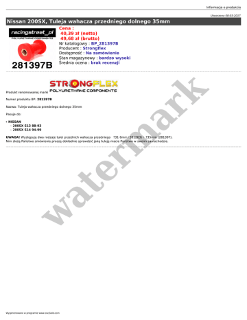 Informacje o produkcie Utworzono 08-03-2017 Nissan 200SX, Tuleja wahacza przedniego dolnego 35mm Cena : 40,39 zł (netto) 49,68 zł (brutto) Produkt renomowanej marki Numer produktu BP: 281397B er m ar k Nr katalogowy : BP_281397B Producent : Strongflex Dostępność : Na zamówienie Stan magazynowy : bardzo wysoki Średnia ocena : brak recenzji Nazwa: Tuleja wahacza przedniego dolnego 35mm Pasuje do: ● NISSAN 200SX S13 88-93 200SX S14 94-99 ❍ ❍ w at UWAGA! Występują dwa rodzaje tulei przednich wahacza przedniego ?31 6mm (281263) i ?35mm (281397). Nim złożą Państwo zmówienie proszę dokładnie sprawdzić jaką tuleję macie Państwo w swoim samochodzie. Wygenerowano w programie www.oscGold.com