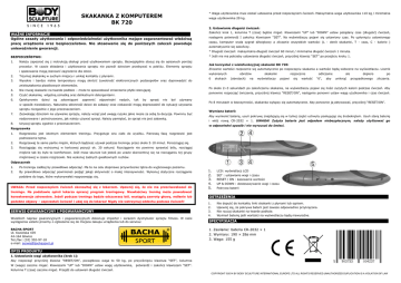 * Waga użytkownika musi zostać ustawiona przed rozpoczęciem ćwiczeń. Maksymalna waga użytkownika 110 kg / minimalna SKAKANKA Z KOMPUTEREM BK 720 waga użytkownika 20 kg. 2. Ustawianie długości ćwiczeń: WAŻNE INFORMACJE Ogólne zasady użytkowania i odpowiedzialności użytkownika mające zagwarantować właściwą pracę urządzenia oraz bezpieczeństwo. Nie stosowanie się do poniższych zaleceń powoduje unieważnienie gwarancji. Zakończ krok 1, kolumna T (czas) będzie migać. Klawiszami “UP” lub “DOWN” ustaw pożądany czas (długość) ćwiczeń, BEZPIECZEŃSTWO: * Jeśli nie ma potrzeby ustawiania długości ćwiczeń, przyciśnij klawisz “SET” po przejściu kroku 1. 1. Należy zapoznać się z instrukcją obsługi przed użytkowaniem sprzętu. Bezwzględnie stosuj się do opisanych poniżej procedur. W czasie składania i użytkowania sprzętu nie pozwól dzieciom przebywać w pobliżu. Elementy sprzętu i opakowania mogą stanowić zagrożenie dla dzieci. Trzymaj skakankę w suchym miejscu i unikaj kontaktu z płynami. 3. Wysokie i bardzo niskie temperatury mogą skrócić żywotność elektronicznych podzespołów oraz doprowadzić do zniekształcenia plastikowych elementów. 4. Nie rzucaj skakanki na twarde podłoże – może to spowodować zniszczenie płytki sterującej. 5. Czyść skakankę wilgotną szmatką oraz delikatnymi detergentami. 6. Opiekunowie są zobowiązani zapewnić odpowiedni nadzór, tak by sprzęt nie był używany Zezwalając dzieciom na używanie sprzętu, należy wziąć pod uwagę ryzyko jakie niesie za sobą ta decyzja. Powinny być nadzorowane i poinstruowane, jak należy używać sprzęt. Należy pamiętać, że sprzęt nie jest zabawką. Używaj sprzętu zgodnie z przeznaczeniem. Jak korzystać z wielofunkcyjnej skakanki BK 720: Zliczanie wartości rozpocznie się automatycznie po rozpoczęciu skakania a wartości będą widoczne na wyświetlaczu. Licznik 6 skokach obrotów (obrotach) na skakanki wyświetlaczy rozpocznie pojawi się wartość odliczanie "6", aby ale uniknąć dopiero po przypadkowego zliczania. Po 8 minutach w bezczynności, skakanka wyłączy się automatycznie. Aby ponownie ją aktywować, przyciśnij “RESET/ON”. Wymiana baterii: Aby wymienić baterię, usuń pokrywę znajdującą się w tylnej części uchwytu posługując się śrubokrętem. Usuń starą baterię i włóż nową CR-2032 × 1. UWAGA! Zużyta bateria jest odpadem niebezpiecznym, należy utylizować go w odpowiedni sposób i nie wyrzucać do śmieci. Rozgrzewka 1. * Długość ćwiczeń: maksymalna długość ćwiczeń 60 minut / minimalna długość ćwiczeń 1 minuta. ponownie rozpocząć ćwiczenia, przyciśnij klawisz “RESET/ON”, następnie ponowni ustaw wagę użytkownika i czas ćwiczeń. sprzętu niezgodnie z jego przeznaczeniem. 8. automatycznie się zakończy. Po około 2~3 sekundach po zakończeniu skakania, na wyświetlaczu pojawi się ilości zużytych kalorii podczas ćwiczeń. Aby w sposób niewłaściwy. Naturalna skłonność dzieci do zabawy oraz ciekawość mogą doprowadzić do sytuacji używania 7. czasu, komputer wyda sygnał dźwiękowy a zliczanie wszystkich wartości (L - obrót skakanki, T - czas, C - kalorie ) wykonanych 2. dzieci następnie potwierdź I zakończ klawiszem “SET”. Na wyświetlaczu pojawi się ustawiony czas. Po upłynięciu ustawionego Rozgrzewka jest istotnym elementem treningu. Przygotuje ona ciało do wysiłku. Pierwszą fazą rozgrzewki jest podniesienie tętna. 2. Rozgrzewaj te same partie mięśni, których będziesz używał podczas treningu przez około 5-10 minut. Porozciągaj się. 3. Rozciągając się wytrzymuj w końcowej pozycji ok. 30 sekund. Rozciąganie nie powinno sprawiać bólu, rozciągaj mięśnie tak by było to komfortowe. Jeśli masz skurcze lub jesteś po urazie skoncentruj się na rozciąganiu tej grupy mięśniowej w czasie rozgrzewki. Nie wykonuj żadnych gwałtownych ruchów. Odpoczynek 1. Po treningu zadbaj by prawidłowo odpocząć. Ma to na celu stopniowe przywrócenie tętna do wyjściowego poziomu. 2. By prawidłowo odpocząć powinieneś podjąć jakąś aktywność o małej intensywności. Wykonuj statyczne rozciąganie podobne do tego, które wykonywałeś rozgrzewając się. UWAGA: Przed rozpoczęciem ćwiczeń skonsultuj się z lekarzem. Upewnij się, że nie ma przeciwwskazać do 1. 2. 3. 4. 5. LCD: wyświetlacz LCD SET : ustawianie wagi i czasu RESET / ON : kasowanie wartości UP & DOWN : dostosowywanie wagi i czasu Pokrywa baterii treningu. Na podstawie opinii lekarza opracuj program treningowy. Niewłaściwy trening może powodować konsekwencje zdrowotne. Jeżeli podczas treningu będzie odczuwasz ból, wystąpią zawroty głowy, mdlenie lub podobne objawy – zaprzestań ćwiczeń i udaj się do lekarza! Nigdy nie wstrzymuj oddechu podczas ćwiczeń! SERWIS GWARANCYJNY I POGWARANCYJNY Wszelkich napraw gwarancyjnych i pogwarancyjnych dokonuje importer i zarazem dystrybutor sprzętu fitness. W razie wystąpienia usterki prosimy o zgłoszenie się do miejsca zakupu urządzenia lub do serwisu: OSTRZEŻENIA 1. 2. 3. 4. Nie dopuść do kontaktu linki skakanki z płynami lub ogniem. Upewnij się, że pokrywa baterii jest zawsze odpowiednio przykręcona. Nie rzucaj skakanki na twarde podłoże. Wymień baterię jeśli wartości na wyświetlaczu będą niewyraźne. SPECYFIKACJA 1. Zasilanie: bateria CR-2032 × 1 2. Wymiary: 190 × 28ø mm 3. Waga: 155 g BACHA SPORT Ul. Kozielska 439 44-164 Gliwice Tel./fax: (32) 302-97-18 e-mail: [email protected] OPIS PRODUKTU 1. Ustawianie wagi użytkownika (krok 1): Aby rozpocząć przyciśnij klawisz “RESET/ON”, początkowa waga to 50 kg, po przyciśnięciu klawisza “SET”, kolumna W (waga) zacznie migać. Klawiszami “UP” lub “DOWN” ustaw wagę użytkownika, potwierdź i zakończ klawiszem “SET”. Kolumna T (czas) zacznie migać. Przejdź do ustawień długości ćwiczeń. COPYRIGHT ©2014 BY BOD