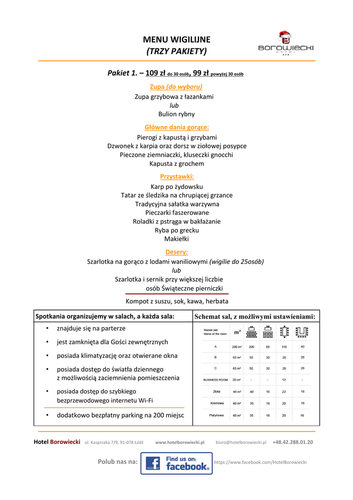 MENU WIGILIJNE (TRZY PAKIETY) Pakiet 1. – 109 zł do 30 osób, 99 zł powyżej 30 osób Zupa (do wyboru) Zupa grzybowa z łazankami lub Bulion rybny Główne dania gorące: Pierogi z kapustą i grzybami Dzwonek z karpia oraz dorsz w ziołowej posypce Pieczone ziemniaczki, kluseczki gnocchi Kapusta z grochem Przystawki: Karp po żydowsku Tatar ze śledzika na chrupiącej grzance Tradycyjna sałatka warzywna Pieczarki faszerowane Roladki z pstrąga w bakłażanie Ryba po grecku Makiełki Desery: Szarlotka na gorąco z lodami waniliowymi (wigilie do 25osób) lub Szarlotka i sernik przy większej liczbie osób Świąteczne pierniczki Kompot z suszu, sok, kawa, herbata Spotkania organizujemy w salach, a każda sala: • znajduje się na parterze • jest zamknięta dla Gości zewnętrznych • posiada klimatyzację oraz otwierane okna • posiada dostęp do światła dziennego z możliwością zaciemnienia pomieszczenia • posiada dostęp do szybkiego bezprzewodowego internetu Wi-Fi • dodatkowo bezpłatny parking na 200 miejsc Hotel Borowiecki ul. Kasprzaka 7/9, 91-078 Łódź Polub nas na: Schemat sal, z możliwymi ustawieniami: www.hotelborowiecki.pl [email protected] +48.42.288.01.20 https://www.facebook.com/HotelBorowiecki Pakiet 2. – 85 zł Zupa (do wyboru): Barszcz czerwony z uszkami lub Zupa grzybowa z łazankami Główne dania gorące: Dzwonek z karpia z ziemniakiem pieczonym i kapustą z grochem Pierogi z kapustą i grzybami Przystawki: Śledzik w trzecich odsłonach (w oleju, w śmietanie, z kurkami) Pieczarki faszerowane Sałatka z wędzonym łososiem Makiełki Bufet słodki: Makowiec Wigilijny piernik w polewie czekoladowej Kutia Sok, kawa, herbata Pakiet 3. – 69 zł Zupa : Barszcz czerwony z francuskim krokietem Główne danie gorące: Pierogi z kapustą i grzybami Kapusta z grochem Przystawka: Śledzik w trzech odsłonach (w oleju, w śmietanie, z kurkami) Bufet słodki: Makowiec Szarlotka Sok, kawa, herbata Opcjonalnie do każdego pakietu: butelka wina (czerwonego/białego) – 49 zł/0,75l Hotel Borowiecki ul. Kasprzaka 7/9, 91-078 Łódź Polub nas na: www.hotelborowiecki.pl [email protected] +48.42.288.01.20 https://www.facebook.com/HotelBorowiecki