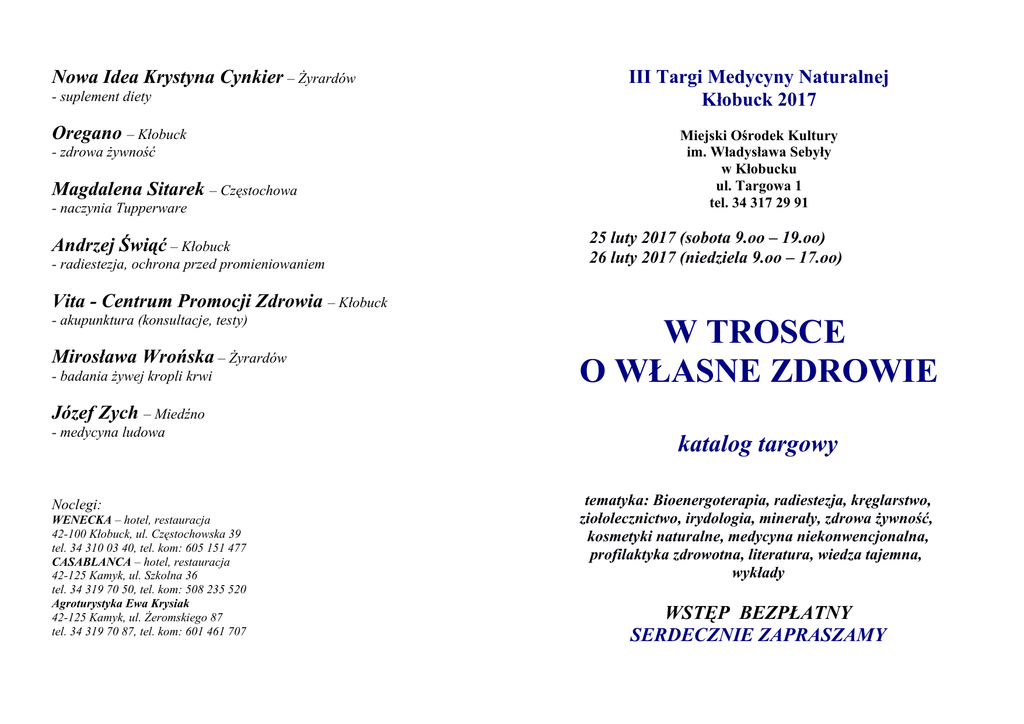 Nowa Idea Krystyna Cynkier – Żyrardów - suplement diety Oregano – Kłobuck - zdrowa żywność Magdalena Sitarek – Częstochowa - naczynia Tupperware Andrzej Świąć – Kłobuck - radiestezja, ochrona przed promieniowaniem III Targi Medycyny Naturalnej Kłobuck 2017 Miejski Ośrodek Kultury im. Władysława Sebyły w Kłobucku ul. Targowa 1 tel. 34 317 29 91 25 luty 2017 (sobota 9.oo – 19.oo) 26 luty 2017 (niedziela 9.oo – 17.oo) Vita - Centrum Promocji Zdrowia – Kłobuck - akupunktura (konsultacje, testy) Mirosława Wrońska – Żyrardów - badania żywej kropli krwi W TROSCE O WŁASNE ZDROWIE Józef Zych – Miedźno - medycyna ludowa Noclegi: WENECKA – hotel, restauracja 42-100 Kłobuck, ul. Częstochowska 39 tel. 34 310 03 40, tel. kom: 605 151 477 CASABLANCA – hotel, restauracja 42-125 Kamyk, ul. Szkolna 36 tel. 34 319 70 50, tel. kom: 508 235 520 Agroturystyka Ewa Krysiak 42-125 Kamyk, ul. Żeromskiego 87 tel. 34 319 70 87, tel. kom: 601 461 707 katalog targowy tematyka: Bioenergoterapia, radiestezja, kręglarstwo, ziołolecznictwo, irydologia, minerały, zdrowa żywność, kosmetyki naturalne, medycyna niekonwencjonalna, profilaktyka zdrowotna, literatura, wiedza tajemna, wykłady WSTĘP BEZPŁATNY SERDECZNIE ZAPRASZAMY Szanowni Państwo! Serdecznie witamy po raz kolejny na Targach Medycyny Naturalnej w Kłobucku. Znajdą tu Państwo wiele tradycyjnych możliwości dotyczących oceny swojego zdrowia. Będzie można zdiagnozować stan organizmu, skorzystać z porad, zakupić naturalne specyfiki, skorzystać z ciekawych wykładów z różnych dziedzin. Olga Skwara DYREKTOR Miejskiego Ośrodka Kultury w Kłobucku Miejsce: Miejski Ośrodek Kultury im. Wł. Sebyły w Kłobucku 42-100 Kłobuck, ul Targowa 1 tel. 34 317 29 91 Wykłady: 25 luty 2017 (sobota) 14:oo – Mirosława Wrońska: Krzem pierwiastkiem życia. Złoto, srebro, cynk niezbędne pierwiastki dla organizmów żywych 14:5o – Kazimierz Lewandowski: Ciąg przyczynowo-skutkowy przebytych schorzeń. Diagnoza metodą wglądu. 15:4o – Andrzej Świąć: Radiestezja dla zdrowia 16:3o – Mirosława Wrońska: Dobra flora bakteryjna. Krok do zdrowia 17:2o – zakończenie wykładów 26 luty 2017 (niedziela) 14:oo – 14:oo – Mirosława Wrońska: Krzem pierwiastkiem życia. Złoto, srebro, cynk niezbędne pierwiastki dla organizmów żywych 14:5o – Kazimierz Lewandowski: Ciąg przyczynowo-skutkowy przebytych schorzeń. Diagnoza metodą wglądu. 15:4o – Andrzej Świąć: Radiestezja dla zdrowia 16:3o – Mirosława Wrońska: Dobra flora bakteryjna. Krok do zdrowia 17:2o – zakończenie wykładów Wystawcy: Centrum Uzdrawiania Pranicznego – Częstochowa - uzdrowienia praniczne, literatura Dariusz Czech – Nowy Sącz - Krople Toda DuoLife Sławomir Jaskuła – Kłobuck - naturalne produkty dla zdrowia Gabinet Terapii Naturalnej – Panki - komora hiperbaryczna Krystyna Gruchalska – Łódź - tarot, wróżby Kamyk s.c. – Gdańsk - bursztyny i minerały Urszula Kasprzyk – Ostrowy nad Okszą - miody Robert Laskowski – Gliwice - bezinwazyjne badania wieku biologicznego, zioła Noni Kazimierz Lewandowski – - diagnoza bez badania, bioenergoterapia Jarosław Majchrzak – Częstochowa - herbatki Nepalskie