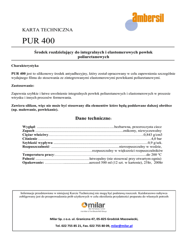 KARTA TECHNICZNA PUR 400 Środek rozdzielający do integralnych i elastomerowych powłok poliuretanowych Charakterystyka PUR 400 jest to silikonowy środek antyadhezyjny, który został opracowany w celu zapewnienia szczególnie wydajnego filmu do stosowania ze zintegrowanymi elastomerowymi powłokami poliuretanowymi. Zastosowanie: Zapewnia szybkie i łatwe uwolnienie integralnych powłok poliuretanowych i elastomerowych w procesie wtrysku i innych procesów formowania. Zawiera silikon, więc nie może być stosowany dla elementów które będą poddawane dalszej obróbce (np. malowanie, powlekanie). Dane techniczne: Wygląd: ..................................................................................bezbarwna, przezroczysta ciecz Zapach .............................................................................................znikomy, niewyczuwalny Ciężar właściwy………………………………………………………………….0,843 g/cm3 Ciśnienie ……………………………………………………………….……..……….4,0 bar Szybkość wypływu ....................................................................................................0,9 g/sek. Rozpuszczalność: ........................................................................nierozpuszczalny w wodzie, ……………………………………………….rozpuszczalny w większości rozpuszczalników Temperatura pracy:…………………………………………………….................do 200 °C Palność .........................................................łatwopalny (nie stosować przy otwartym ogniu) Opakowanie: ……………...........................aerozol 500 ml (12 szt. w kartonie), 25ltr, 200ltr Informacje przedstawione w niniejszej Karcie Technicznej nie mogą być podstawą roszczeń. Każdorazowo nabywca zobligowany jest do przeprowadzenia prób użytkowych w celu określenia przydatności preparatu do własnych potrzeb. Milar Sp. z o.o. ul. Graniczna 47, 05-825 Grodzisk Mazowiecki, Tel. 022 755 85 21, Fax. 022 755 80 09, [email protected] Sposób użycia: Nanosić cienką warstwę ciągłym strumieniem z odległości ok. 25 do 30 cm. Powtarzać proces w miarę potrzeby Dodatkowe informacje - Powierzchnia wykończona na wysoki połysk - Słaby zapach rozpuszczalnika - Szybkie odparowanie rozpuszczalników nośnych - nadaje się do formowania niskotemperaturowego - Nie pozostawia smug na powierzchni formowanego elementu - Nanoszenie poprzez natrysk - Nie nawarstwia się w formie Przeznaczenie: - Poliuretany integralne - Polimery elastomerowe Przechowywanie: Produkt może być przechowywany w temperaturze otoczenia i posiada okres przechowywania nie mniejszy niż 36 miesięcy, przy poprawnym, magazynowaniu. Aerozole powinny zawsze być przechowywać w temperaturze poniżej 50 ° C, z dala od źródeł ciepła i otwartego ognia. Bezpieczeństwo: Karta charakterystyki produktu dostępna osobno. Informacje przedstawione w niniejszej Karcie Technicznej nie mogą być podstawą roszczeń. Każdorazowo nabywca zobligowany jest do przeprowadzenia prób użytkowych w celu określenia przydatności preparatu do własnych potrzeb. Milar Sp. z o.o. ul. Graniczna 47, 05-825 Grodzisk Mazowiecki, Tel. 022 755 85 21, Fax. 022 755 80 09, [email protected]
