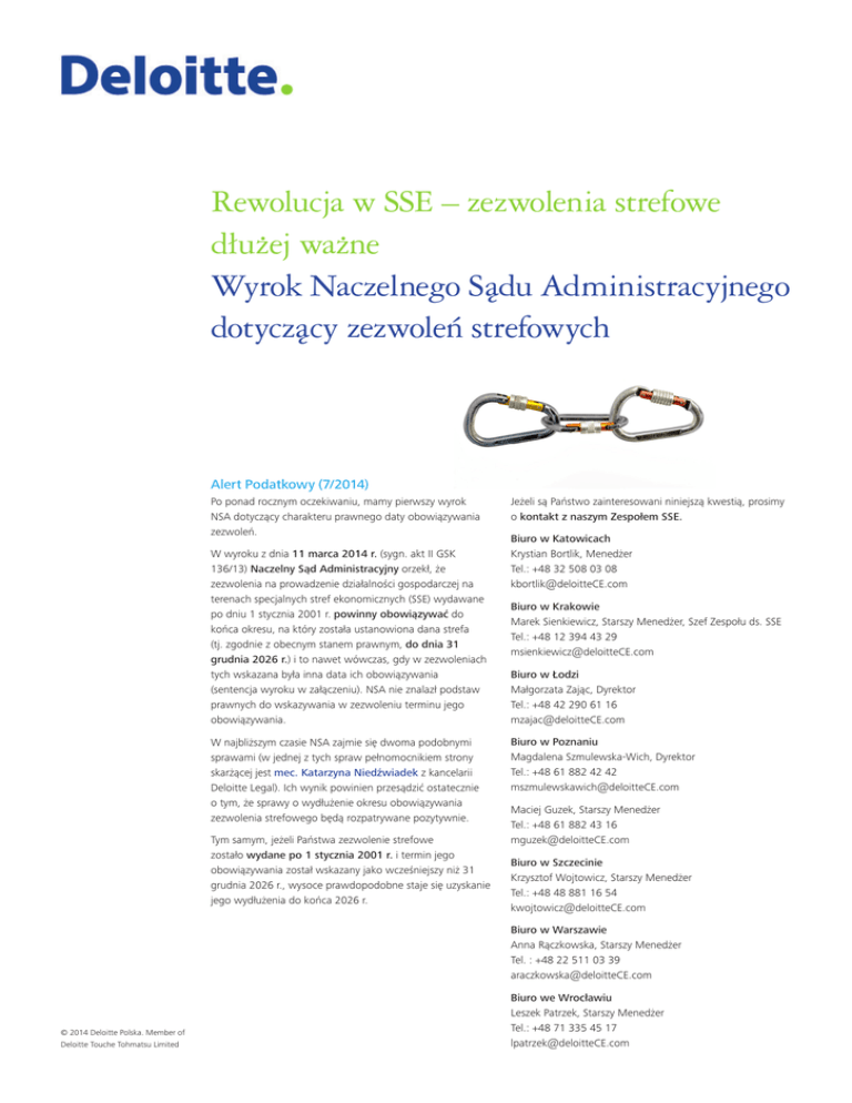 Rewolucja w SSE – zezwolenia strefowe dłużej ważne Wyrok Naczelnego Sądu Administracyjnego dotyczący zezwoleń strefowych Alert Podatkowy (7/2014) Po ponad rocznym oczekiwaniu, mamy pierwszy wyrok NSA dotyczący charakteru prawnego daty obowiązywania zezwoleń. W wyroku z dnia 11 marca 2014 r. (sygn. akt II GSK 136/13) Naczelny Sąd Administracyjny orzekł, że zezwolenia na prowadzenie działalności gospodarczej na terenach specjalnych stref ekonomicznych (SSE) wydawane po dniu 1 stycznia 2001 r. powinny obowiązywać do końca okresu, na który została ustanowiona dana strefa (tj. zgodnie z obecnym stanem prawnym, do dnia 31 grudnia 2026 r.) i to nawet wówczas, gdy w zezwoleniach tych wskazana była inna data ich obowiązywania (sentencja wyroku w załączeniu). NSA nie znalazł podstaw prawnych do wskazywania w zezwoleniu terminu jego obowiązywania. W najbliższym czasie NSA zajmie się dwoma podobnymi sprawami (w jednej z tych spraw pełnomocnikiem strony skarżącej jest mec. Katarzyna Niedźwiadek z kancelarii Deloitte Legal). Ich wynik powinien przesądzić ostatecznie o tym, że sprawy o wydłużenie okresu obowiązywania zezwolenia strefowego będą rozpatrywane pozytywnie. Tym samym, jeżeli Państwa zezwolenie strefowe zostało wydane po 1 stycznia 2001 r. i termin jego obowiązywania został wskazany jako wcześniejszy niż 31 grudnia 2026 r., wysoce prawdopodobne staje się uzyskanie jego wydłużenia do końca 2026 r. Jeżeli są Państwo zainteresowani niniejszą kwestią, prosimy o kontakt z naszym Zespołem SSE. Biuro w Katowicach Krystian Bortlik, Menedżer Tel.: +48 32 508 03 08 [email protected] Biuro w Krakowie Marek Sienkiewicz, Starszy Menedżer, Szef Zespołu ds. SSE Tel.: +48 12 394 43 29 [email protected] Biuro w Łodzi Małgorzata Zając, Dyrektor Tel.: +48 42 290 61 16 [email protected] Biuro w Poznaniu Magdalena Szmulewska-Wich, Dyrektor Tel.: +48 61 882 42 42 [email protected] Maciej Guzek, Starszy Menedżer Tel.: +48 61 882 43 16 [email protected] Biuro w Szczecinie Krzysztof Wojtowicz, Starszy Menedżer Tel.: +48 48 881 16 54 [email protected] Biuro w Warszawie Anna Rączkowska, Starszy Menedżer Tel. : +48 22 511 03 39 [email protected] © 2014 Deloitte Polska. Member of Deloitte Touche Tohmatsu Limited Biuro we Wrocławiu Leszek Patrzek, Starszy Menedżer Tel.: +48 71 335 45 17 [email protected]