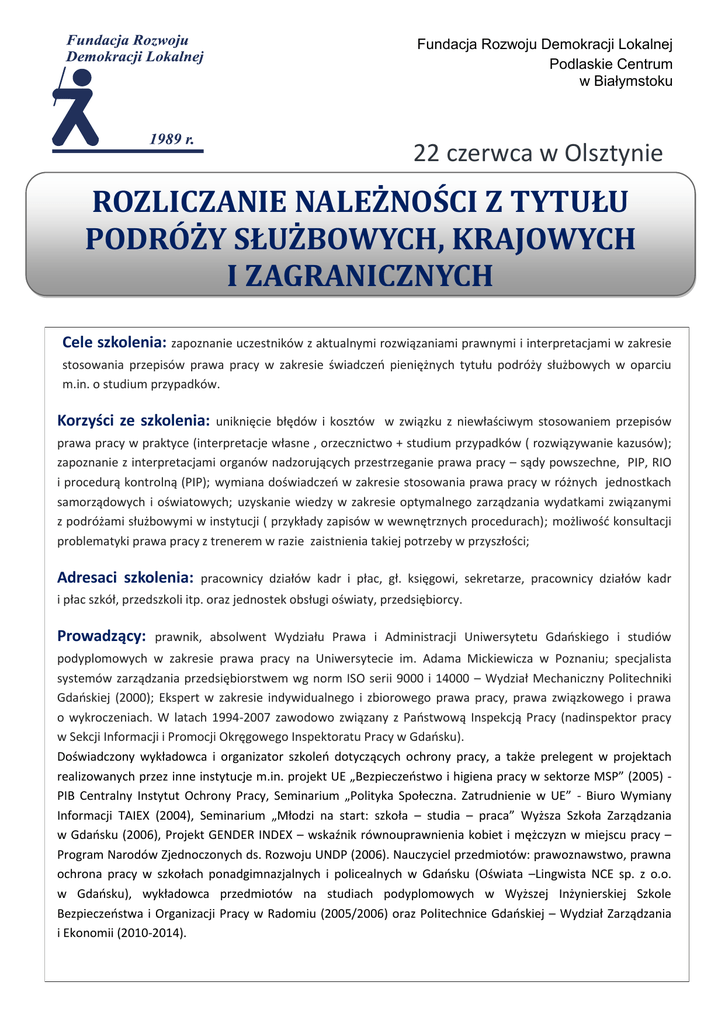 Fundacja Rozwoju Demokracji Lokalnej Podlaskie Centrum w Białymstoku 22 czerwca w Olsztynie ROZLICZANIE NALEŻNOŚCI Z TYTUŁU PODRÓŻY SŁUŻBOWYCH, KRAJOWYCH I ZAGRANICZNYCH Cele szkolenia: zapoznanie uczestników z aktualnymi rozwiązaniami prawnymi i interpretacjami w zakresie stosowania przepisów prawa pracy w zakresie świadczeń pieniężnych tytułu podróży służbowych w oparciu m.in. o studium przypadków. Korzyści ze szkolenia: uniknięcie błędów i kosztów w związku z niewłaściwym stosowaniem przepisów prawa pracy w praktyce (interpretacje własne , orzecznictwo + studium przypadków ( rozwiązywanie kazusów); zapoznanie z interpretacjami organów nadzorujących przestrzeganie prawa pracy – sądy powszechne, PIP, RIO i procedurą kontrolną (PIP); wymiana doświadczeń w zakresie stosowania prawa pracy w różnych jednostkach samorządowych i oświatowych; uzyskanie wiedzy w zakresie optymalnego zarządzania wydatkami związanymi z podróżami służbowymi w instytucji ( przykłady zapisów w wewnętrznych procedurach); możliwość konsultacji problematyki prawa pracy z trenerem w razie zaistnienia takiej potrzeby w przyszłości; Adresaci szkolenia: pracownicy działów kadr i płac, gł. księgowi, sekretarze, pracownicy działów kadr i płac szkół, przedszkoli itp. oraz jednostek obsługi oświaty, przedsiębiorcy. Prowadzący: prawnik, absolwent Wydziału Prawa i Administracji Uniwersytetu Gdańskiego i studiów podyplomowych w zakresie prawa pracy na Uniwersytecie im. Adama Mickiewicza w Poznaniu; specjalista systemów zarządzania przedsiębiorstwem wg norm ISO serii 9000 i 14000 – Wydział Mechaniczny Politechniki Gdańskiej (2000); Ekspert w zakresie indywidualnego i zbiorowego prawa pracy, prawa związkowego i prawa o wykroczeniach. W latach 1994-2007 zawodowo związany z Państwową Inspekcją Pracy (nadinspektor pracy w Sekcji Informacji i Promocji Okręgowego Inspektoratu Pracy w Gdańsku). Doświadczony wykładowca i organizator szkoleń dotyczących ochrony pracy, a także prelegent w projektach realizowanych przez inne instytucje m.in. projekt UE „Bezpieczeństwo i higiena pracy w sektorze MSP” (2005) PIB Centralny Instytut Ochrony Pracy, Seminarium „Polityka Społeczna. Zatrudnienie w UE” - Biuro Wymiany Informacji TAIEX (2004), Seminarium „Młodzi na start: szkoła – studia – praca” Wyższa Szkoła Zarządzania w Gdańsku (2006), Projekt GENDER INDEX – wskaźnik równouprawnienia kobiet i mężczyzn w miejscu pracy – Program Narodów Zjednoczonych ds. Rozwoju UNDP (2006). Nauczyciel przedmiotów: prawoznawstwo, prawna ochrona pracy w szkołach ponadgimnazjalnych i policealnych w Gdańsku (Oświata –Lingwista NCE sp. z o.o. w Gdańsku), wykładowca przedmiotów na studiach podyplomowych w Wyższej Inżynierskiej Szkole Bezpieczeństwa i Organizacji Pracy w Radomiu (2005/2006) oraz Politechnice Gdańskiej – Wydział Zarządzania i Ekonomii (2010-2014). Program szkolenia: 1. Omówienie aktualnych rozwiązań prawnych w zakresie podróży służbowych w 2016 r. 2. Pojęcie podróży służbowej i innych wyjazdów pracowniczych, w kontekście zakresu obowiązków i miejsca wykonywania pracy. 3. Zasady obliczania diet krajowych i pozostałych kosztów podróży: dieta krajowa uzależniona od ilości posiłków zapewnionych pracownikom; nocleg ze śniadaniem- problemy praktyczne i możliwe rozwiązania faktyczne; problemy praktyczne związane z wypłacaniem diet, w tym posiłek z kontrahentem, obiad na szkoleniu, obiadokolacja, posiłek zapewniony, ale niespożyty itp.; dieta za podróż służbową krajową w trakcie podróży zagranicznej; koszty przejazdu – środki komunikacji publicznej, pojazdy nie będące własnością pracodawcy; pozostałe wydatki – zakres uznania kosztów; 4. Zasady wypłacania ryczałtów wypłacanych pracownikom limity ryczałtów za noclegi; ryczałty za dojazdy – zasady obliczenia, wyłączenia; 5. Dokumenty związane z rozliczaniem podróży służbowych: polecenie wyjazdu służbowego - obowiązki formalne dokumentu, wyjazdy krótkoterminowe (w ramach dniówki roboczej); zgoda na użycie samochodu niebędącego własnością pracodawcy; skutki prawne wyjazdu bez polecenia pracodawcy; potwierdzenie pobytu pracownika w danym miejscu jako dodatkowy obowiązek nie wynikający z przepisów prawa pracy; rozliczenie wyjazdu - wymagania formalne, w tym zatwierdzenia formalne, merytoryczne i do wypłaty dokumenty podpinane pod rozliczenie delegacji - rozliczania faktur, paragonów, rachunków na osobę fizyczną (pracownika); skutki nieprawidłowego rozliczenia delegacji (niezgodnego z prawdą) i nieprawidłowego rozliczenia kosztów podróży służbowej przez pracodawcę; wewnętrzne regulacje – procedury i instrukcje rozliczania podróży służbowych (przykłady rozwiązań); 6. Rozliczanie podróży służbowej zagranicznej: podróż zagraniczna do kilku państw; moment rozpoczęcia i zakończenia podróży zagranicznej - problemy praktyczne wyjazd do kilku państw; zasady ustalania diet za pobyt w danym państwie; pozostałe koszty podróży służbowych; 7. Rozliczanie zaliczek na podróże służbowe. Terminy. 8. Czas pracy w podróży służbowej. Ograniczanie związane z delegowaniem pracowników poza stałe miejsce pracy. 9. Skutki wypadku w trakcie podróży służbowej w zakresie kosztów podróży. 10. Orzecznictwo oraz interpretacje urzędowe i podatkowe dotyczące podróży służbowych. 11. Rozwiązywanie kazusów z zakresu podróży służbowych, w tym w zakresie naliczania należności. 12. Indywidualne konsultacje. SZKOLENIE: ROZLICZANIE NALEŻNOŚCI Z TYTUŁU PODRÓŻY SŁUŻBOWYCH, KRAJOWYCH I ZAGRANICZNYCH DANE D O K ON T AK T U : Miejsce: Fundacja Rozwoju Demokracji Lokalnej Podlaskie Centrum ul. Choroszczańska 31 15-732 Białystok (Dawny budynek Wyższej Szkoły Ekonomicznej) tel./fax. 85 732 17 88, 85 732 94 84 e-mail: [email protected] Termin i godzina: w w w. f