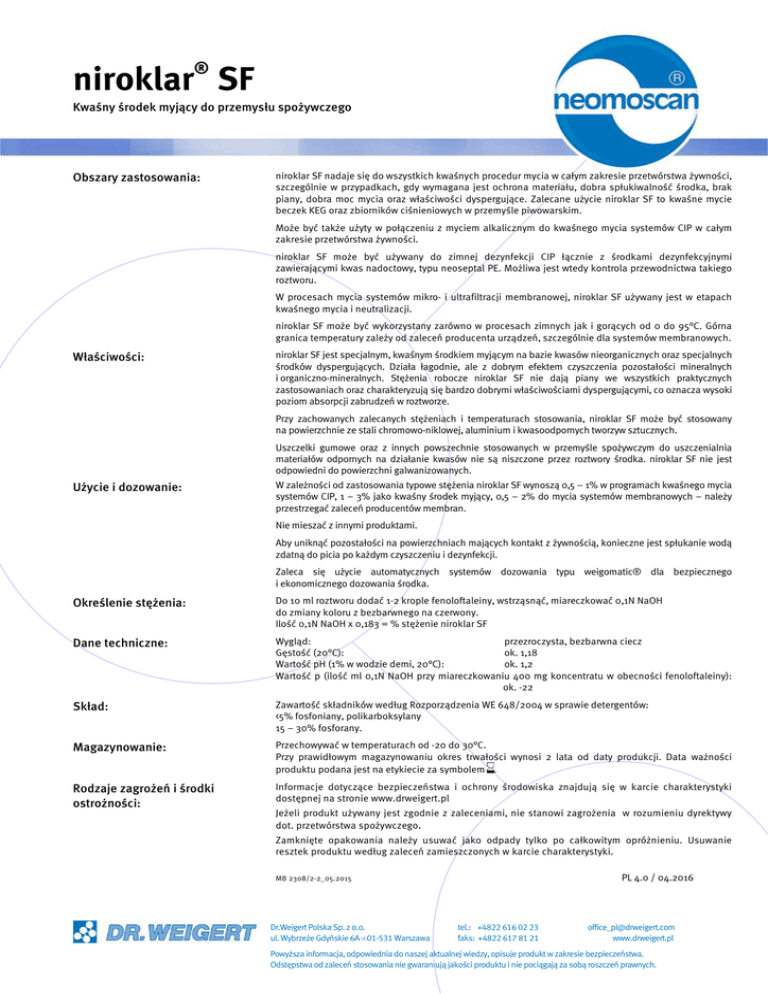 ® niroklar SF Kwaśny środek myjący do przemysłu spożywczego Obszary zastosowania: niroklar SF nadaje się do wszystkich kwaśnych procedur mycia w całym zakresie przetwórstwa żywności, szczególnie w przypadkach, gdy wymagana jest ochrona materiału, dobra spłukiwalność środka, brak piany, dobra moc mycia oraz właściwości dyspergujące. Zalecane użycie niroklar SF to kwaśne mycie beczek KEG oraz zbiorników ciśnieniowych w przemyśle piwowarskim. Może być także użyty w połączeniu z myciem alkalicznym do kwaśnego mycia systemów CIP w całym zakresie przetwórstwa żywności. niroklar SF może być używany do zimnej dezynfekcji CIP łącznie z środkami dezynfekcyjnymi zawierającymi kwas nadoctowy, typu neoseptal PE. Możliwa jest wtedy kontrola przewodnictwa takiego roztworu. W procesach mycia systemów mikro- i ultrafiltracji membranowej, niroklar SF używany jest w etapach kwaśnego mycia i neutralizacji. niroklar SF może być wykorzystany zarówno w procesach zimnych jak i gorących od 0 do 95°C. Górna granica temperatury zależy od zaleceń producenta urządzeń, szczególnie dla systemów membranowych. Właściwości: niroklar SF jest specjalnym, kwaśnym środkiem myjącym na bazie kwasów nieorganicznych oraz specjalnych środków dyspergujących. Działa łagodnie, ale z dobrym efektem czyszczenia pozostałości mineralnych i organiczno-mineralnych. Stężenia robocze niroklar SF nie dają piany we wszystkich praktycznych zastosowaniach oraz charakteryzują się bardzo dobrymi właściwościami dyspergującymi, co oznacza wysoki poziom absorpcji zabrudzeń w roztworze. Przy zachowanych zalecanych stężeniach i temperaturach stosowania, niroklar SF może być stosowany na powierzchnie ze stali chromowo-niklowej, aluminium i kwasoodpornych tworzyw sztucznych. Uszczelki gumowe oraz z innych powszechnie stosowanych w przemyśle spożywczym do uszczenialnia materiałów odpornych na działanie kwasów nie są niszczone przez roztwory środka. niroklar SF nie jest odpowiedni do powierzchni galwanizowanych. Użycie i dozowanie: W zależności od zastosowania typowe stężenia niroklar SF wynoszą 0,5 – 1% w programach kwaśnego mycia systemów CIP, 1 – 3% jako kwaśny środek myjący, 0,5 – 2% do mycia systemów membranowych – należy przestrzegać zaleceń producentów membran. Nie mieszać z innymi produktami. Aby uniknąć pozostałości na powierzchniach mających kontakt z żywnością, konieczne jest spłukanie wodą zdatną do picia po każdym czyszczeniu i dezynfekcji. Zaleca się użycie automatycznych systemów dozowania typu weigomatic® dla bezpiecznego i ekonomicznego dozowania środka. Określenie stężenia: Do 10 ml roztworu dodać 1-2 krople fenoloftaleiny, wstrząsnąć, miareczkować 0,1N NaOH do zmiany koloru z bezbarwnego na czerwony. Ilość 0,1N NaOH x 0,183 = % stężenie niroklar SF Dane techniczne: Wygląd: przezroczysta, bezbarwna ciecz Gęstość (20°C): ok. 1,18 Wartość pH (1% w wodzie demi, 20°C): ok. 1,2 Wartość p (ilość ml 0,1N NaOH przy miareczkowaniu 400 mg koncentratu w obecności fenoloftaleiny): ok. -22 Skład: Zawartość składników według Rozporządzenia WE 648/2004 w sprawie detergentów: <5% fosfoniany, polikarboksylany 15 – 30% fosforany. Magazynowanie: Przechowywać w temperaturach od -20 do 30°C. Przy prawidłowym magazynowaniu okres trwałości wynosi 2 lata od daty produkcji. Data ważności produktu podana jest na etykiecie za symbolem . Rodzaje zagrożeń i środki ostrożności: Informacje dotyczące bezpieczeństwa i ochrony środowiska znajdują się w karcie charakterystyki dostępnej na stronie www.drweigert.pl Jeżeli produkt używany jest zgodnie z zaleceniami, nie stanowi zagrożenia w rozumieniu dyrektywy dot. przetwórstwa spożywczego. Zamknięte opakowania należy usuwać jako odpady tylko po całkowitym opróżnieniu. Usuwanie resztek produktu według zaleceń zamieszczonych w karcie charakterystyki. PL 4.0 / 04.2016 MB 2308/2-2_05.2015 Dr.Weigert Polska Sp. z o.o. ul. Wybrzeże Gdyńskie 6A • 01-531 Warszawa tel.: +4822 616 02 23 faks: +4822 617 81 21 [email protected] www.drweigert.pl Powyższa informacja, odpowiednia do naszej aktualnej wiedzy, opisuje produkt w zakresie bezpieczeństwa. Odstępstwa od zaleceń stosowania nie gwarantują jakości produktu i nie pociągają za sobą roszczeń prawnych.