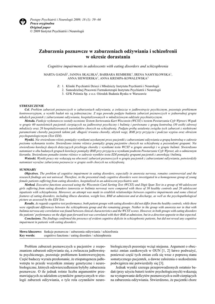 Postêpy Psychiatrii i Neurologii 2009; 18 (1): 5966 Praca oryginalna Original paper © 2009 Instytut Psychiatrii i Neurologii Zaburzenia poznawcze w zaburzeniach od¿ywiania i schizofrenii w okresie dorastania Cognitive impairments in adolescents with eating disorders and schizophrenia MARTA GADA1, JANINA SKALSKA2, BARBARA REMBERK 1, IRENA NAMYS£OWSKA1, ANNA SIEWIERSKA1, ANNA KREMPA-KOWALEWSKA3 Z: 1. Kliniki Psychiatrii Dzieci i M³odzie¿y Instytutu Psychiatrii i Neurologii 2. Samodzielnej Pracowni Farmakoterapii Instytutu Psychiatrii i Neurologii 3. GFK Polonia Sp. z o.o. Orodek Badania Rynku w Warszawie STRESZCZENIE Cel. Problem zaburzeñ poznawczych w zaburzeniach od¿ywiania, a zw³aszcza w jad³owstrêcie psychicznym, pozostaje problemem kontrowersyjnym, a wyniki badañ nie s¹ jednoznaczne. Z tego powodu podjêto badania zaburzeñ poznawczych w jednorodnej grupie m³odych pacjentek z zaburzeniami od¿ywiania, hospitalizowanych w m³odzie¿owym oddziale psychiatrycznym. Metoda. Funkcje wykonawcze zosta³y ocenione Testem Sortowania Kart Wisconsin (WCST) i testem Powtarzania Cyfr Wprost i Wspak w grupie 60 nastoletnich pacjentek cierpi¹cych na jad³owstrêt psychiczny i bulimiê i porównane z grup¹ kontroln¹ (30 osób) zdrowej m³odzie¿y oraz 20 hospitalizowanych nastolatków chorych na schizofreniê. Podjêto próbê ustalenia zwi¹zku tych zaburzeñ z niektórymi parametrami choroby pacjentek takimi jak: d³ugoæ trwania choroby, ubytek wagi, BMI przy przyjêciu i podczas wypisu oraz obrazem psychopatologicznym (Test EDI). Wyniki. Nie stwierdzono ró¿nic pomiêdzy wynikami uzyskanymi przez pacjentki z zaburzeniami od¿ywiania a grup¹ kontroln¹ w zakresie poziomu wykonania testów. Stwierdzono istotne ró¿nice pomiêdzy grup¹ pacjentów chorych na schizofreniê a pozosta³ymi grupami. Nie stwierdzono korelacji danych dotycz¹cych przebiegu choroby z wynikami testu WCST w grupie anoreksji i w grupie bulimii. Stwierdzono natomiast w obu badanych grupach korelacje pomiêdzy BMI przy przyjêciu a wynikami podtestu Powtarzanie Cyfr Wprost, ale o odmiennym kierunku. Stwierdzono ponadto istotne ró¿nice w zakresie wyników testu EDI pomiêdzy grupami pacjentek z anoreksj¹ i bulimi¹. Wnioski. Wyniki pracy nie wskazuj¹ na obecnoæ zaburzeñ poznawczych w grupie pacjentek z zaburzeniami od¿ywiania, potwierdzi³y natomiast wyrane zaburzenia poznawcze w grupie osób chorych na schizofreniê. SUMMARY Objectives. The problem of cognitive impairment in eating disorders, especially in anorexia nervosa, remains controversial and the research findings are not univocal. Therefore, in the presented study cognitive disorders were investigated in a homogenous group of young female patients suffering from eating disorders, hospitalized in an adolescent psychiatric unit. Method. Executive functions assessed using the Wisconsin Card Sorting Test (WCST) and Digit Span Test in a group of 60 adolescent girls suffering from eating disorders (anorexia or bulimia nervosa) were compared with these of 30 healthy controls and 20 adolescent inpatients with schizophrenia. Moreover, an attempt was made to establish relationships between cognitive impairments and some clinical features of eating disorders, including illness duration, weight loss, BMI at admission and at discharge, as well as the psychopathological picture as assessed by the EDI Test. Results. As regards cognitive test performance, both patient groups with eating disorders did not differ from the healthy controls, while there were significant differences between the schizophrenia group and the remaining groups. Neither in the group with anorexia nor in that with bulimia nervosa any correlation was found between clinical characteristics and the WCST scores. However, in both groups with eating disorders the patients performance on the digit span forward test was correlated with their BMI at admission, but in a direction opposite to that expected. Conclusions. The findings confirmed the presence of evident cognitive deficits in schizophrenic patients, but did not reveal any cognitive impairment in patients with eating disorders. S³owa kluczowe: funkcje poznawcze / zaburzenia od¿ywiania / schizofrenia Key words: cognitive functions / eating disorders / schizophrenia Problem zaburzeñ poznawczych u pacjentów z rozpoznaniem zaburzeñ od¿ywiania siê, a zw³aszcza jad³owstrêtu psychicznego, pozostaje problemem kontrowersyjnym. Czêæ badaczy wyra¿a przekonanie, ¿e etiopatogeneza jad³owstrêtu to przede wszystkim zmiany genetyczne i neurobiologiczne, których odzwierciedleniem by³yby zaburzenia poznawcze. O ile jednak ronie liczba argumentów przemawiaj¹cych za udzia³em czynników genetycznych w etiologii zaburzeñ od¿ywiania, o tyle rola czynników neuro- biologicznych pozostaje wci¹¿ niejasna. Argument o obecnoci zmian zanikowych w OUN [1, 2] ³atwo podwa¿yæ, poniewa¿ czêæ tych zmian cofa siê wraz z popraw¹ stanu somatycznego pacjentek, a dawne za³o¿enia o uszkodzeniu podwzgórza nie potwierdzi³y siê [3]. Jednak wyniki szeregu przeprowadzonych ostatnio badañ (przy u¿yciu baterii testów psychologicznych) wskazuj¹ na wystêpowanie deficytów poznawczych u osób cierpi¹cych na zaburzenia od¿ywiania. Stwierdzono, ¿e pacjentki chore 60 Marta Gada, Janina Skalska, Barbara Remberek, Irena Namys³owska, Anna Siewierska, Anna Krempa-Kowalewska na bulimiê [4] i anoreksjê [5, 6] pope³niaj¹ wiêcej b³êdów pojêciowych i w blokowaniu nieistotnych informacji w Tecie Sortowania Kart Wisconsin (WCST) oraz w podobnym tecie (Bexley-Maudslay Category Sorting Test). Toner i wsp. [7] oraz Kaye i wsp. [8] stwierdzili tak¿e trudnoci pacjentek z zaburzeniami od¿ywiania, zarówno w podgrupie jad³owstrêtu jak i bulimii, w myleniu abstrakcyjnym w testach porównywania twarzy (Matching Familiar Figures), a Jones i wsp. [9] w podtecie symbole cyfr skali Wechslera. Badano równie¿ zdolnoci wzrokowo-przestrzenne u osób z zaburz