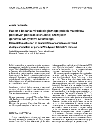 ARCH. MED. SĄD. KRYM., 2009, LIX, 46-47 PRACE ORYGINALNE Jolanta Kędzierska Raport z badania mikrobiologicznego próbek materiałów pobranych podczas ekshumacji szczątków generała Władysława Sikorskiego Microbiological report of examination of samples recovered during exhumation of general Władysław Sikorski’s remains Szpital Uniwersytecki w Krakowie, Zakład Mikrobiologii Kierownik Zakładu: dr n. biol. J. Kędzierska Próbki materiałów w postaci wymazów uzyskane podczas sekcji zwłok ekshumowanych szczątków generała Władysława Sikorskiego poddano badaniom w Zakładzie Mikrobiologii Szpitala Uniwersyteckiego w Krakowie z zastosowaniem klasycznych metod hodowlanych. W dwóch próbkach potwierdzono obecność tlenowych i beztlenowych laseczek zarodnikujących odpowiednio z rodzaju Bacillus spp. i Clostridium spp. Wyniki badań przedstawiono w postaci tabelarycznej. Specimens obtained during autopsy of exhumed remains of general Władysław Sikorski were examined applying aerobic and anaerobic cultures. The results are presented in the table. Słowa kluczowe: generał Władysław Sikorski, badanie mikrobiologiczne ekshumowanych zwłok Key words: general Władysław Sikorski, microbiological samples of exhumed corpse MATERIAŁ I METODYKA Próbki materiałów uzyskane podczas ekshumacji szczątków generała W. Sikorskiego dostarczono do Zakładu Mikrobiologii Szpitala Uniwersyteckiego w Krakowie 25 listopada 2008 roku. Materiał do badań pobrano w postaci wymazów i zabezpieczono w zestawach transportowych Amies agar firmy Oxoid. Uzyskany materiał posiewano bezpośrednio na stałe podłoże agar Columbia z 5% krwią baranią (bioMerieux). Agar Columbia, opisany przez Ellnera, jest podłożem izolacyjnym opracowanym w celu umożliwienia wzrostu mikroorganizmom o wysokich wymaganiach odżywczych. Dodatek krwi baraniej wysoce wzbogaca podłoże czyniąc je przydatnym do hodowli większości gatunków bakterii bez względu na ich metabolizm. Inkubację płytek prowadzono w atmosferze CO2 w temperaturze 37°C. Do bezpośredniej hodowli grzybów strzępkowych zastosowano dodatkowo podłoże wybiórcze agar Sabourauda z gentamycyną i chloramfenikolem 2 (bioMerieux). Wymazówki zabezpieczono ponadto w bulionie Schaedlera z wit. K3 ułatwiającym wzrost bakteriom beztlenowym. Wszystkie hodowle oceniano co 24 godz. w ciągu 14 dni inkubacji. Wzrost drobnoustrojów związany ze zmętnieniem bulionu uzyskiwano po przesianiu podłoża na stały agar Schaedlera z 5% krwią baranią. Wyizolowane szczepy bakterii identyfikowano w oparciu o ich właściwości biochemiczne z wykorzystaniem komercyjnych testów api 20A oraz api CH (bioMerieux). Nr 1 RAPORT Z bADANIA MIKRObIOLOGICZNEGO 47 WYNIKI bADAŃ Tab. I. Wyniki posiewów próbek materiałów pobranych podczas ekshumacji szczątków generała Władysława Sikorskiego. Tab. I. Microbiological results of examination of samples recovered during exhumation of general Władysław Sikorski’s remains. Materiał diagnostyczny Specimen Wymaz z wnętrza metalowej trumny Metal coffin inner swab Wymaz z worka plastikowego od zewnątrz External part of the plastic bag swab Wymaz z worka plastikowego od wewnątrz Inner part of the plastic bag swab Wymaz z koca od zewnątrz External part of the blanket swab Wymaz z koca od wewnątrz Inner part of the blanket swab Wymaz spod koca Under blanket swab Wymaz z koszuli Shirt swab Wymaz z twarzy Face swab Wymaz z tułowia Trunk swab Oryginalny numer badania Examination reference number 787390 787387 787385 787384 787389 787392 787386 Wynik posiewu Aerobic and anaerobic culture result brak wzrostu No growth brak wzrostu No growth brak wzrostu No growth brak wzrostu No growth brak wzrostu No growth brak wzrostu No growth brak wzrostu No growth 787388 bacillus spp. 787391 Clostridium spp. Ogółem spośród 9 przebadanych próbek, pochodzących bezpośrednio ze szczątków generała Sikorskiego, odzieży oraz trumny, jedynie w dwóch, pobranych z twarzy i tułowia Generała potwierdzono obecność tlenowych i beztlenowych laseczek zarodnikujących odpowiednio z rodzaju Bacillus spp. oraz Clostridium spp. (tab. I). Laseczki należą do bakterii wszechobecnych zarówno w środowisku nieożywionym, jak i organizmach różnych gospodarzy. Związane jest to miedzy innymi z wytwarzaniem przez nie przetrwalników [1]. Charakterystyczna dla grupy laseczek zdolność tworzenia przetrwalników (endospor) wytrzymałych na oddziaływanie niekorzystnych czynników zewnętrznych, jak odwodnienie i brak składników odżywczych tłumaczy izolację saprofitycznych, wegetatywnych komórek tych bakterii na sztucznych podłożach hodowlanych (tab. I). W postaci przetrwalników, laseczki mogą pozostawać w środowisku nawet przez kilkadziesiąt lat, nie tracąc swoich właściwości biologicznych [2]. Możliwość przechodzenia w postać przetrwalnikową odróżnia te drobnoustroje od większości innych bakterii i stanowi rzadką okoliczność zwiększającą w tym przypadku prawdopodobieństwo powodzenia klasycznych metod hodowlanych. Coraz częściej natomiast wyniki prac eksperymentalnych potwierdzają przydatność technik molekularnych do identyfikacji dawnych patogenów. Nowe perspektywy w tej dziedzinie stwarza paleomikrobiologia, w której z powodzeniem wykorzystywane są najnowsze metody pozwalające na identyfikację cząsteczek DNA zarówno bakterii, wirusów jak i pasożytów występujących w archeologicznych szczątkach ludzi [3]. PIśMIENNICTWO 1. Szewczyk E.: Diagnostyka bakteriologiczna. Wydawnictwo Naukowe PWN. Warszawa 2005. 2. Setlow P.: I will survive: DNA protection in bacterial spores. Trends Microbiol, 2007, 15 (4), 172-80. 3. Kołodyński J., Jankowski S.: Paelomicrobiology – a New branch of Science (Paleomikrobiologia – nowa dziedzina nauki). Adv Clin Exp Med, 2006, 15, 121-125. Adres autora: dr Jolanta Kędzierska Szpital Uniwersytecki w Krakowie Zakład Mikrobiologii ul. śniadeckich 6, 31-5