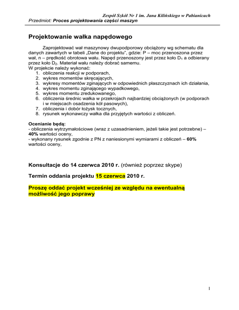 Zespół Szkół Nr 1 im. Jana Kilińskiego w Pabianicach Przedmiot: Proces projektowania części maszyn Projektowanie wałka napędowego Zaprojektować wał maszynowy dwupodporowy obciążony wg schematu dla danych zawartych w tabeli „Dane do projektu”, gdzie: P – moc przenoszona przez wał, n – prędkość obrotowa wału. Napęd przenoszony jest przez koło D1 a odbierany przez koło D2. Materiał wału należy dobrać samemu. W projekcie należy wykonać: 1. obliczenia reakcji w podporach, 2. wykres momentów skręcających, 3. wykresy momentów zginających w odpowiednich płaszczyznach ich działania, 4. wykres momentu zginającego wypadkowego, 5. wykres momentu zredukowanego, 6. obliczenia średnic wałka w przekrojach najbardziej obciążonych (w podporach i w miejscach osadzenia kół pasowych), 7. obliczenia i dobór łożysk tocznych, 8. rysunek wykonawczy wałka dla przyjętych wartości z obliczeń. Ocenianie będą: - obliczenia wytrzymałościowe (wraz z uzasadnieniem, jeżeli takie jest potrzebne) – 40% wartości oceny, - wykonany rysunek zgodnie z PN z naniesionymi wymiarami z obliczeń – 60% wartości oceny, Konsultacje do 14 czerwca 2010 r. (również poprzez skype) Termin oddania projektu 15 czerwca 2010 r. Proszę oddać projekt wcześniej ze względu na ewentualną możliwość jego poprawy 1 Zespół Szkół Nr 1 im. Jana Kilińskiego w Pabianicach Przedmiot: Proces projektowania części maszyn Schemat 1 P2 D2 D1 c P1 b a Schemat 2 D2 P1 P2 D1 c b a 2 Zespół Szkół Nr 1 im. Jana Kilińskiego w Pabianicach Przedmiot: Proces projektowania części maszyn Schemat 3 P2 D2 P1 D1 c b a Dane do projektu Nr w dzienniku Nr schematu a 16. 17. 18. 19. 20. 21. 22. 23. 24. 25. 26. 27. 28. 29. 30. 2 2 1 3 1 2 1 3 2 3 1 2 1 3 3 200 250 300 300 150 250 250 200 200 150 250 300 300 200 250 b c 250 250 150 200 300 300 150 250 200 150 150 200 150 250 300 mm 350 400 250 250 150 200 300 350 250 200 250 300 350 150 250 D1 300 250 300 350 350 300 300 400 450 400 450 350 400 400 300 D2 P n 400 450 500 450 550 500 550 600 600 500 600 500 550 600 550 kW 11,02 13,23 14,7 14,7 13,23 22,05 18,37 11,02 14,7 14,7 22,15 22 15 11 10,05 obr/min 750 550 800 900 950 1000 1100 450 900 900 1100 1000 1000 850 500 3 Zespół Szkół Nr 1 im. Jana Kilińskiego w Pabianicach Przedmiot: Proces projektowania części maszyn Życzę powodzenia 4
