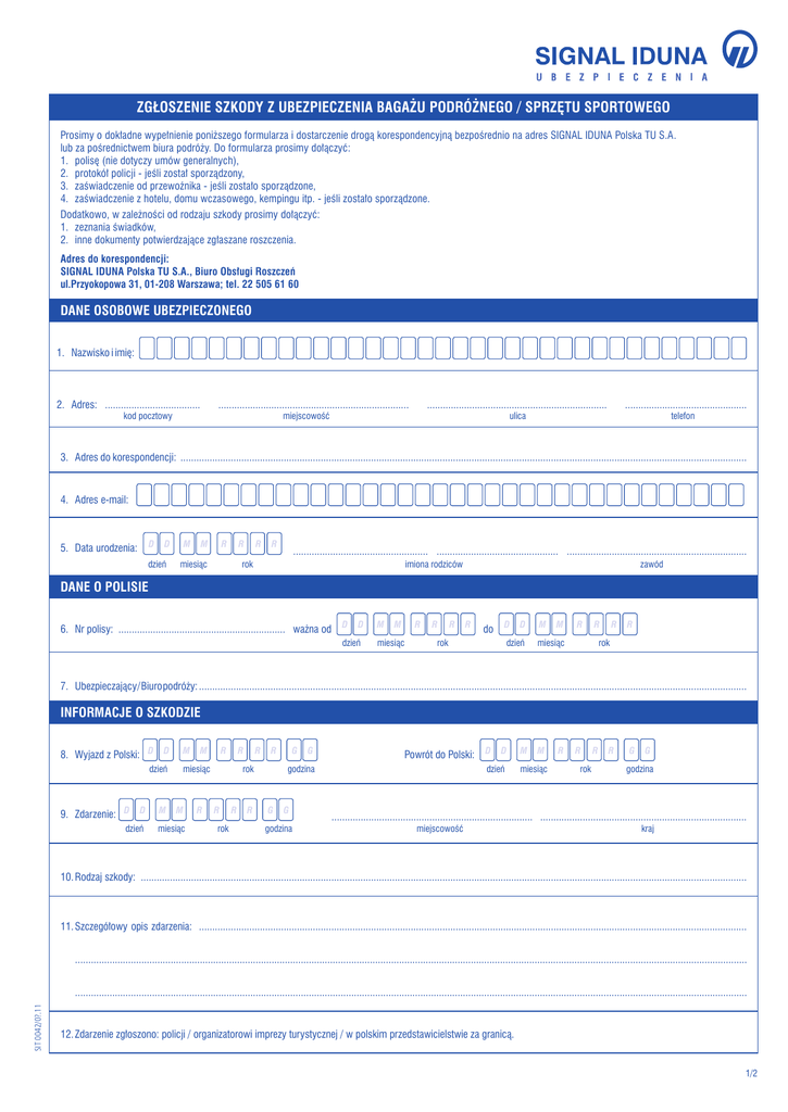ZGŁOSZENIE SZKODY Z UBEZPIECZENIA BAGAŻU PODRÓŻNEGO / SPRZĘTU SPORTOWEGO Prosimy o dokładne wypełnienie poniższego formularza i dostarczenie drogą korespondencyjną bezpośrednio na adres SIGNAL IDUNA Polska TU S.A. lub za pośrednictwem biura podróży. Do formularza prosimy dołączyć: 1. polisę (nie dotyczy umów generalnych), 2. protokół policji - jeśli został sporządzony, 3. zaświadczenie od przewoźnika - jeśli zostało sporządzone, 4. zaświadczenie z hotelu, domu wczasowego, kempingu itp. - jeśli zostało sporządzone. Dodatkowo, w zależności od rodzaju szkody prosimy dołączyć: 1. zeznania świadków, 2. inne dokumenty potwierdzające zgłaszane roszczenia. Adres do korespondencji: SIGNAL IDUNA Polska TU S.A., Biuro Obsługi Roszczeń ul.Przyokopowa 31, 01-208 Warszawa; tel. 22 505 61 60 DANE OSOBOWE UBEZPIECZONEGO 1. Nazwisko i imię: 2. Adres: .................................... kod pocztowy ........................................................................ .................................................................... miejscowość .............................................. ulica telefon 3. Adres do korespondencji: ...................................................................................................................................................................................................................... 4. Adres e-mail: D D 5. Data urodzenia: dzień M M R miesiąc R R R ................................................... .............................................. .................................................................... rok imiona rodziców zawód DANE O POLISIE 6. Nr polisy: ............................................................... ważna od D D M M R dzień miesiąc R R R rok do D D M M dzień miesiąc R R R R rok 7. Ubezpieczający / Biuro podróży: ............................................................................................................................................................................................................... INFORMACJE O SZKODZIE 8. Wyjazd z Polski: D D M M miesiąc dzień 9. Zdarzenie: D D M M miesiąc dzień R R R R R rok R rok R R G G Powrót do Polski: godzina G G godzina D D M M dzień miesiąc R R R R rok G G godzina ............................................................................ .............................................................................. miejscowość kraj 10.Rodzaj szkody: ..................................................................................................................................................................................................................................... 11.Szczegółowy opis zdarzenia: ............................................................................................................................................................................................................... ............................................................................................................................................................................................................................................................. SIT 0042/0?.11 ............................................................................................................................................................................................................................................................. 12.Zdarzenie zgłoszono: policji / organizatorowi imprezy turystycznej / w polskim przedstawicielstwie za granicą. 1/2 13.Jeśli są świadkowie zdarzenia, to podać nazwiska i imiona oraz ich adresy: ............................................................................................................................................................................................................................... ............................................................................................................................................................................................................................... 14.Wykaz rzeczy zniszczonych i / lub utraconych: Nazwa przedmiotu Rodzaj materiału Wartość początkowa Stopień uszkodzenia Ogółem wysokość zgłoszonych roszczeń ................................................................. złotych. 15.Czy posiada Pan / Pani inną polisę obejmującą ochroną ubezpieczeniową to zdarzenie? Jeśli tak, to prosimy podać: Tak Nie nazwę zakładu ubezpieczeń: ............................................................................................................................................... nr polisy: .................................................. OŚWIADCZENIE Oświadczam, że powyższe informacje zostały przeze mnie udzielone zgodnie z prawdą i według najlepszej wiedzy. FORMA WYPŁATY ODSZKODOWANIA Należne odszkodowanie należy przekazać na złotówkowe konto bankowe o numerze: Nazwa i nr oddziału banku: ........................................................................................................................................................................................................................ Nazwisko i imię właściciela konta bankowego: ........................................................................................................................................................................................... ................................................................................................................. Data i podpis Ubezpieczającego / pracownika biura podróży ................................................................................................................. Data i podpis Ubezpieczonego 2/2