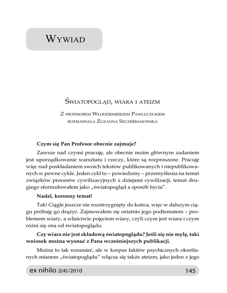 Wywiad Światopogląd, wiara i ateizm Z profesorem Włodziemierzem Pawluczukiem rozmawiała Zuzanna Szczerbanowska Czym się Pan Profesor obecnie zajmuje? Zawsze nad czymś pracuję, ale obecnie moim głównym zadaniem jest uporządkowanie warsztatu i rzeczy, które są rozproszone. Pracuję więc nad poskładaniem swoich tekstów publikowanych i niepublikowanych w pewne cykle. Jeden cykl to – powiedzmy – przemyślenia na temat związków procesów cywilizacyjnych z dziejami cywilizacji, temat drugiego sformułowałem jako „światopogląd a sposób bycia”. Nadal, koronny temat! Tak! Ciągle jeszcze nie rozstrzygnięty do końca, więc w dalszym ciągu próbuję go drążyć. Zajmowałem się ostatnio jego podtematem – problemem wiary, a właściwie pojęciem wiary, czyli czym jest wiara i czym różni się ona od światopoglądu. Czy wiara nie jest składową światopoglądu? Jeśli się nie mylę, taki wniosek można wysnuć z Pana wcześniejszych publikacji. Można to tak rozumieć, ale w korpus faktów psychicznych określanych mianem „światopoglądu” włącza się także ateizm, jako jeden z jego ex nihilo 2(4) /2010 145 Wywiad typów. Ateiści zaś w sposób kategoryczny, wręcz z irytacją, zaprzeczają, że częścią ich światopoglądu jest wiara. Profesor Jan Woleński kategorycznie stwierdził podczas dysputy na Kongresie Filozofów: „Jestem niewierzący, więc jaka tu wiara?!”. Światopoglądem można więc nazwać każdą postawę człowieka wobec nieskończoności, wobec świata, śmierci i cierpienia. Natomiast ze względów socjologiczno-historycznych warto rozróżnić trzy kondycje. Kondycja pierwotna, która występuje w wierzeniach pierwotnych i ludowych, to egzystencja w micie, gdzie nie ma jeszcze rozróżnienia między religią i niereligią, naturą i tym, co nadnaturalne. Tam, gdzie kończy się mit, wyłaniają się dwie konieczne struktury. Jedna to wiara, druga to światopogląd. Tu musimy już sprecyzować, czym cechuje się wiara. Moja opinia na ten temat jest taka, że wiara charakteryzuje się tym, iż jest pewnością i jest dana w egzystencjalnym doświadczeniu jednostki. Definicja fenomenologii mówi o bezpośrednio danej naoczności. Nauka nie daje bezpośredniej naoczności, ale działa poprzez aparaturę. Nie oglądamy przecież wirusów ot, tak sobie. Niektórzy, ci, którzy posiadają odpowiednią aparaturę, mogą je oglądać. Z kolei naoczność w postaci sacrum, jeśli jest dana, to jest dana bez żadnej aparatury – w doświadczeniu mistycznym. Jednak doświadczenia mistyczne dzisiaj, doświadczenia różnych cudów, które pojawiają się praktycznie co roku w różnych miejscach, są w dużym stopniu protestem przeciwko doktrynie, są buntem przeciwko wierze typu kościelnego, są potrzebą naoczności. Czy w takim razie „wiara w naukę” nie jest wiarą? Na przykład: w szkole nam powiedzieli, że żarówka świeci, bo prąd płynie, ale przecież go nie widzieliśmy. Nie chodzi tu o wiarę, ponieważ takie twierdzenie jest do sfalsyfikowania. Można twierdzić, że żarówka świeci, ale raptem przestaje i cała teoria, że zawsze świeci, upada. Jednak niektórzy twierdzą, że widzą Matkę Boską na szybie, a inni, że jej nie widzą. Jeśli się im nie pojawia, to może dlatego, że tacy ludzie są niedowiarkami, może są poza wiarą? Nurzają się w światopoglądzie, zaczynają rozważać, dlaczego niektórym to jest dane jako pewność, a im dane nie jest i nie 146 ex nihilo 2(4) /2010 Światopogląd, wiara i ateizm... widzą. Nawet ksiądz, przy jakimś głośnym cudzie w Radominie, orzekł – co oburzyło wszystkich wierzących w cud pielgrzymów – „e, to jakieś plamy!”. Księża, jak wiadomo, są sceptyczni wobec cudów, i słusznie, ponieważ wiara w cuda to myślenie antykościelne, wiara ludowa. Potoczne pytanie: „Czy jesteś wierzący?” dotyczy już wiary w Kościół. Koncepcja ta pojawia się już na pierwszym Soborze Nicejskim, w formule chrztu, wiary, którą trzeba było wygłosić, i która do dziś przecież obowiązuje: „Wierzę w jeden, święty, powszechny i apostolski Kościół”. Chrzest jest rodzajem umowy, której częścią jest wyznanie wiary w Kościół. I nie bez powodu był to zawsze główny element wiary, bycia chrześcijaninem. Między wiarą a światopoglądem jest różnica autorytetów. W przypadku wiary jest nim świadek. Mogę to być ja sam, albo mój sąsiad (na przykład „był tam u nas taki jeden, co nad rzeką widział, jak ogień buchnął...” i tak dalej). Autorytetem światopoglądu jest natomiast ekspert, który się zna na cyklotronach, teleskopach czy silnikach, albo może stwierdzić, czy znaleziona ciecz jest krwią Chrystusa, czy tylko jakąś mazią. Jakiś czas temu miał miejsce tego typu przypadek. W 2008 roku w kościele św. Antoniego w Sokółce ksiądz upuścił hostię, którą – zgodnie z procedurą liturgiczną – włożono do specjalnego naczynia z wodą. Po tygodniu w naczyniu znaleziono czerwoną plamę przypominającą krew. Powołano w tym celu komisję kościelną, żeby orzekła, czy to był tak zwany cud eucharystyczny. Mała dygresja: wybitni teologowie twierdzą, że cud był jeden: Wcielenie. Przy okazji powyższego przypadku czytałem w gazetach wypowiedzi teologów: „Jaki tam cud?”, „A czym jest cud?”, pytano. Teolog, ksiądz prof. Alfons Skowronek, powiedział w wywiadzie dla „Gazety Wyborczej”: „To kolejny błąd w logicznym myśleniu. Jak to jest, najpierw Bóg stworzył prawa natury, a potem tenże te prawa łamie? Włożyłbym to między bajki. Czy Bóg uciekałby się do takich sztuczek? Wiara nie jest oparta na cudach”1. Polskie Towarzystwo Racjonalistów uznało z kolei, że jeśli rzeczywiście była tam krew czy tkanka mięśnia sercowego, to Cuda i cudactwa. Z ks. Alfonsem Skowronkiem rozmawiali Katarzyna Wiśniewska i Jan Turnau, „Gazeta Wyborcza” 14.11.2009. 1 ex nihilo 2(4) /2010 1