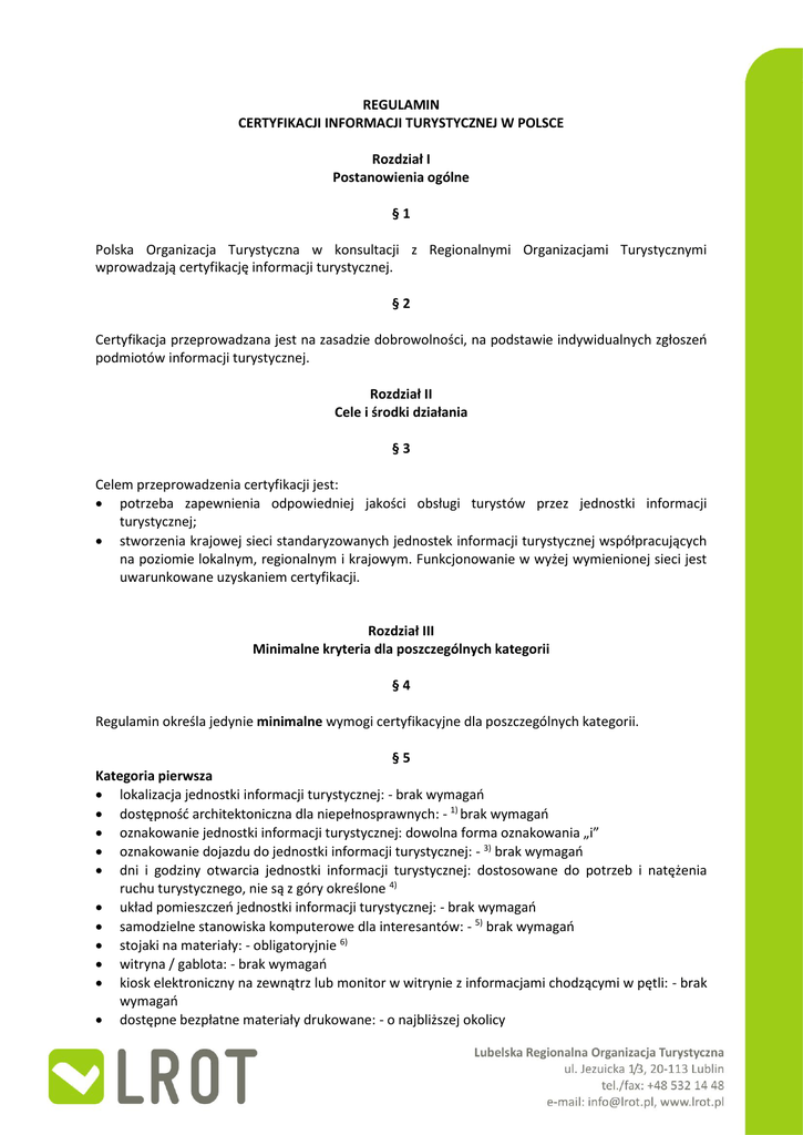 REGULAMIN CERTYFIKACJI INFORMACJI TURYSTYCZNEJ W POLSCE Rozdział I Postanowienia ogólne §1 Polska Organizacja Turystyczna w konsultacji z Regionalnymi Organizacjami Turystycznymi wprowadzają certyfikację informacji turystycznej. §2 Certyfikacja przeprowadzana jest na zasadzie dobrowolności, na podstawie indywidualnych zgłoszeń podmiotów informacji turystycznej. Rozdział II Cele i środki działania §3 Celem przeprowadzenia certyfikacji jest: potrzeba zapewnienia odpowiedniej jakości obsługi turystów przez jednostki informacji turystycznej; stworzenia krajowej sieci standaryzowanych jednostek informacji turystycznej współpracujących na poziomie lokalnym, regionalnym i krajowym. Funkcjonowanie w wyżej wymienionej sieci jest uwarunkowane uzyskaniem certyfikacji. Rozdział III Minimalne kryteria dla poszczególnych kategorii §4 Regulamin określa jedynie minimalne wymogi certyfikacyjne dla poszczególnych kategorii. §5 Kategoria pierwsza lokalizacja jednostki informacji turystycznej: - brak wymagań dostępność architektoniczna dla niepełnosprawnych: - 1) brak wymagań oznakowanie jednostki informacji turystycznej: dowolna forma oznakowania „i” oznakowanie dojazdu do jednostki informacji turystycznej: - 3) brak wymagań dni i godziny otwarcia jednostki informacji turystycznej: dostosowane do potrzeb i natężenia ruchu turystycznego, nie są z góry określone 4) układ pomieszczeń jednostki informacji turystycznej: - brak wymagań samodzielne stanowiska komputerowe dla interesantów: - 5) brak wymagań stojaki na materiały: - obligatoryjnie 6) witryna / gablota: - brak wymagań kiosk elektroniczny na zewnątrz lub monitor w witrynie z informacjami chodzącymi w pętli: - brak wymagań dostępne bezpłatne materiały drukowane: - o najbliższej okolicy doświadczenie kierunkowe lub kilkuletnie informatorów (w turystyce – np. przewodnicy, w informacji turystycznej): - co najmniej jedna osoba znajomość języków obcych: - jeden język obcy w stopniu podstawowym zakres udzielanych informacji: - o najbliższej okolicy + dostępna lista jednostek IT wraz z pełnymi danymi teleadresowymi sprzedaż pamiątek, publikacji, etc: - brak wymagań sprzedaż usług przewodnickich: - brak wymagań dodatkowe funkcje – oprócz świadczenia usług informacji IT i sprzedaży: - brak wymagań §6 Kategoria druga lokalizacja jednostki informacji turystycznej: brak wymagań dostępność architektoniczna dla niepełnosprawnych: - 1) brak wymagań oznakowanie jednostki informacji turystycznej: - napis nad wejściem (stały) oznakowanie dojazdu do jednostki informacji turystycznej: - 3) brak wymagań dni i godziny otwarcia jednostki informacji turystycznej: - dostosowane do potrzeb i natężenia ruchu turystycznego, nie są z góry określone 4) układ pomieszczeń jednostki informacji turystycznej: - obszar konsultacji, obszar samoobsługi, obszar magazynowy i pracy dla personelu, samodzielne stanowiska komputerowe dla interesantów: - co najmniej jedno 5), stojaki na materiały: - obligatoryjnie 6) witryna / gablota: - brak wymagań kiosk elektroniczny na zewnątrz lub monitor w witrynie z informacjami chodzącymi w pętli: - brak wymagań dostępne bezpłatne materiały drukowane: - o najbliższej okolicy oraz ponadlokalne doświadczenie kierunkowe lub kilkuletnie informatorów (w turystyce – np. przewodnicy, w informacji turystycznej): - co najmniej jedna osoba znajomość języków obcych: - co najmniej jeden język obcy stopniu komunikatywnym zakres udzielanych informacji: - o bliższej i dalszej okolicy + dostępna lista jednostek IT wraz z pełnymi danymi teleadresowymi sprzedaż pamiątek, publikacji, etc: - brak wymagań sprzedaż usług przewodnickich: - brak wymagań dodatkowe funkcje – oprócz świadczenia usług informacji IT i sprzedaży: - brak wymagań §7 Kategoria trzecia lokalizacja jednostki informacji turystycznej: - w centrum miasta / miejscowości; przy głównych trasach turystycznych, dostępność architektoniczna dla niepełnosprawnych: - obligatoryjnie 1) oznakowanie jednostki informacji turystycznej: - podświetlany kaseton 2) oznakowanie dojazdu do jednostki informacji turystycznej: - obligatoryjnie dni i godziny otwarcia jednostki informacji turystycznej: - dostosowane do potrzeb i natężenia ruchu turystycznego min. 5 dni/tyg. 4), układ pomieszczeń jednostki informacji turystycznej: - obszar konsultacji, obszar samoobsługi, obszar magazynowy i pracy dla personelu, samodzielne stanowiska komputerowe dla interesantów: - co najmniej jedno, stojaki na materiały: - obligatoryjnie 6) witryna / gablota: - obligatoryjnie kiosk elektroniczny na zewnątrz lub monitor w witrynie z informacjami chodzącymi w pętli: - brak wymagań dostępne bezpłatne materiały drukowane: - o najbliższej okolicy, ponadlokalne i regionalne, również w językach obcych doświadczenie mkierunkowe lub kilkuletnie informatorów (w turystyce – np. przewodnicy, w informacji turystycznej): – co najmniej dwie osoby znajomość języków obcych: - co najmniej dwa języki obce w stopniu dobrym 8) zakres udzielanych informacji: - o okolicy i całym regionie + dostępna lista jednostek IT wraz z pełnymi danymi teleadresowymi sprzedaż pamiątek, publikacji, etc: - brak wymagań sprzedaż usług przewodnickich: - brak wymagań dodatkowe funkcje – oprócz świadczenia usług informacji IT i sprzedaży: - brak wymagań §8 Kategoria czwarta (najwyższa) lokalizacja jednostki informacji turystycznej: - w centrum miasta / miejscowości; przy głównych trasach turystycznych, dostępność architektoniczna dla niepełnosprawnych: - obligatoryjnie 1) oznakowanie jednostki informacji turystycznej: - podświetlany kaseton 2) oznakowanie dojazdu do jednostki informacji turystycznej: - obligatoryjnie dni i godziny otwarcia jednostki informacji turystycznej: - dostosowane do potrzeb i natężenia ruchu turystycznego min. 6 dni/tyg. 4), układ pomieszczeń jednostki informacji tu