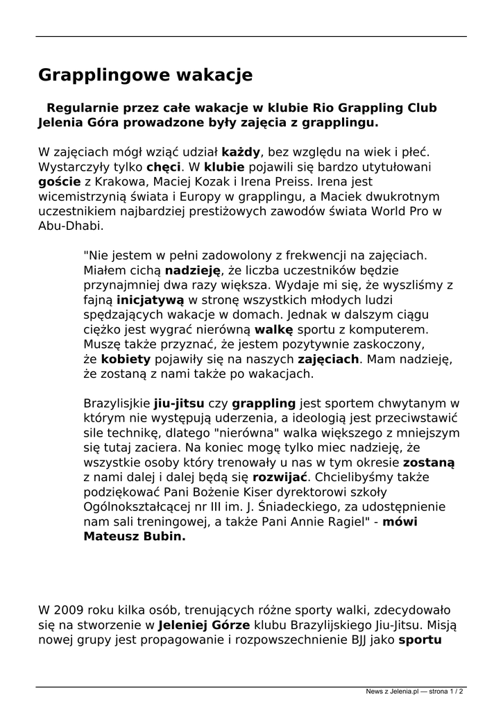 Grapplingowe wakacje Regularnie przez całe wakacje w klubie Rio Grappling Club Jelenia Góra prowadzone były zajęcia z grapplingu. W zajęciach mógł wziąć udział każdy, bez względu na wiek i płeć. Wystarczyły tylko chęci. W klubie pojawili się bardzo utytułowani goście z Krakowa, Maciej Kozak i Irena Preiss. Irena jest wicemistrzynią świata i Europy w grapplingu, a Maciek dwukrotnym uczestnikiem najbardziej prestiżowych zawodów świata World Pro w Abu-Dhabi. "Nie jestem w pełni zadowolony z frekwencji na zajęciach. Miałem cichą nadzieję, że liczba uczestników będzie przynajmniej dwa razy większa. Wydaje mi się, że wyszliśmy z fajną inicjatywą w stronę wszystkich młodych ludzi spędzających wakacje w domach. Jednak w dalszym ciągu ciężko jest wygrać nierówną walkę sportu z komputerem. Muszę także przyznać, że jestem pozytywnie zaskoczony, że kobiety pojawiły się na naszych zajęciach. Mam nadzieję, że zostaną z nami także po wakacjach. Brazylisjkie jiu-jitsu czy grappling jest sportem chwytanym w którym nie występują uderzenia, a ideologią jest przeciwstawić sile technikę, dlatego "nierówna" walka większego z mniejszym się tutaj zaciera. Na koniec mogę tylko miec nadzieję, że wszystkie osoby który trenowały u nas w tym okresie zostaną z nami dalej i dalej będą się rozwijać. Chcielibyśmy także podziękować Pani Bożenie Kiser dyrektorowi szkoły Ogólnokształcącej nr III im. J. Śniadeckiego, za udostępnienie nam sali treningowej, a także Pani Annie Ragiel" - mówi Mateusz Bubin. W 2009 roku kilka osób, trenujących różne sporty walki, zdecydowało się na stworzenie w Jeleniej Górze klubu Brazylijskiego Jiu-Jitsu. Misją nowej grupy jest propagowanie i rozpowszechnienie BJJ jako sportu News z Jelenia.pl — strona 1 / 2 skutecznego w samoobronie, a także w mieszanych sztukach walki (MMA). Na dzień dzisiejszy ewolucja tego sportu oraz jego praktyczne zastosowanie w realnej walce sprawiła, że każdy zawodnik MMA włącza treningi Brazylisjkiego Jiu-Jitsu do swojego planu treningowego. Rio Grappling Club systematycznie się rozwija poszerzając swoje możliwości o nowe grupy treningowe. Na dzień dzisiejszy prowadzone są treningi z zakresu BJJ, Grapplingu i MMA. Od nowego sezonu w planach jest wprowadzenie grupy boksu tajskiego i grupy dziecięcej od 12 lat. Rio Grappling Club Jelenia Góra mimo, że jest młodym klubem ma już na swoim koncie ponad 50 medali w zawodach rangi ogólnopolskiej w tym 4 medale z Mistrzostw Polski Ju-Jitsu, a także zwycięzcę Amatorskiego Pucharu KSW. Link do oryginalnej publikacji: http://jelenia.pl/Grapplingowe_wakacje_n1094.html Wygenerowano: 08/03/2017 17:59:45 © Jelenia.pl News z Jelenia.pl — strona 2 / 2 Powered by TCPDF (www.tcpdf.org)
