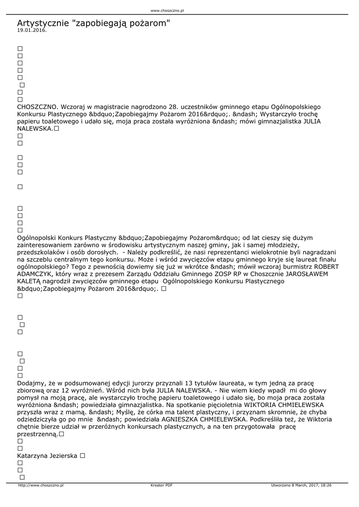 Piaseczniku), PIOTR PASZKOWSKI (ŚDS Choszczno), wyróżnienia: AGNIESZKA MAJCHRZAK, KRZYSZTOF STASIAK (oboje z WTZ w Piaseczniku). {gallery}zapobiegamypozarom 2016{/gallery} http://www.choszczno.pl
