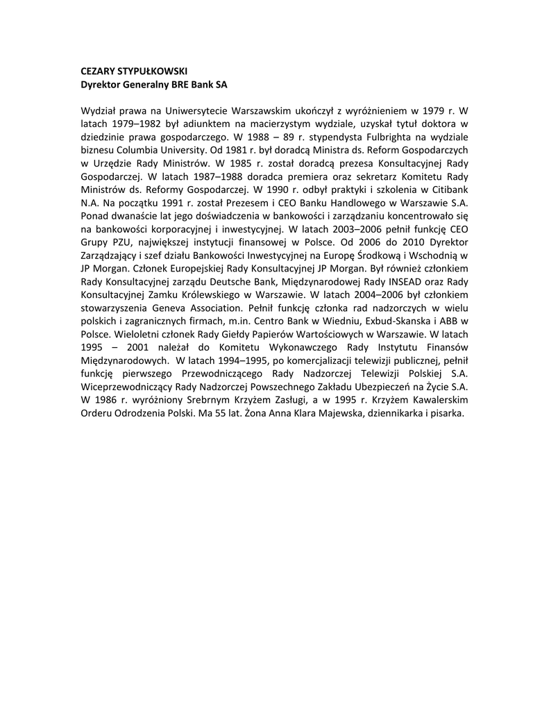 CEZARY STYPUŁKOWSKI Dyrektor Generalny BRE Bank SA Wydział prawa na Uniwersytecie Warszawskim ukooczył z wyróżnieniem w 1979 r. W latach 1979–1982 był adiunktem na macierzystym wydziale, uzyskał tytuł doktora w dziedzinie prawa gospodarczego. W 1988 – 89 r. stypendysta Fulbrighta na wydziale biznesu Columbia University. Od 1981 r. był doradcą Ministra ds. Reform Gospodarczych w Urzędzie Rady Ministrów. W 1985 r. został doradcą prezesa Konsultacyjnej Rady Gospodarczej. W latach 1987–1988 doradca premiera oraz sekretarz Komitetu Rady Ministrów ds. Reformy Gospodarczej. W 1990 r. odbył praktyki i szkolenia w Citibank N.A. Na początku 1991 r. został Prezesem i CEO Banku Handlowego w Warszawie S.A. Ponad dwanaście lat jego doświadczenia w bankowości i zarządzaniu koncentrowało się na bankowości korporacyjnej i inwestycyjnej. W latach 2003–2006 pełnił funkcję CEO Grupy PZU, największej instytucji finansowej w Polsce. Od 2006 do 2010 Dyrektor Zarządzający i szef działu Bankowości Inwestycyjnej na Europę Środkową i Wschodnią w JP Morgan. Członek Europejskiej Rady Konsultacyjnej JP Morgan. Był również członkiem Rady Konsultacyjnej zarządu Deutsche Bank, Międzynarodowej Rady INSEAD oraz Rady Konsultacyjnej Zamku Królewskiego w Warszawie. W latach 2004–2006 był członkiem stowarzyszenia Geneva Association. Pełnił funkcję członka rad nadzorczych w wielu polskich i zagranicznych firmach, m.in. Centro Bank w Wiedniu, Exbud-Skanska i ABB w Polsce. Wieloletni członek Rady Giełdy Papierów Wartościowych w Warszawie. W latach 1995 – 2001 należał do Komitetu Wykonawczego Rady Instytutu Finansów Międzynarodowych. W latach 1994–1995, po komercjalizacji telewizji publicznej, pełnił funkcję pierwszego Przewodniczącego Rady Nadzorczej Telewizji Polskiej S.A. Wiceprzewodniczący Rady Nadzorczej Powszechnego Zakładu Ubezpieczeo na Życie S.A. W 1986 r. wyróżniony Srebrnym Krzyżem Zasługi, a w 1995 r. Krzyżem Kawalerskim Orderu Odrodzenia Polski. Ma 55 lat. Żona Anna Klara Majewska, dziennikarka i pisarka.