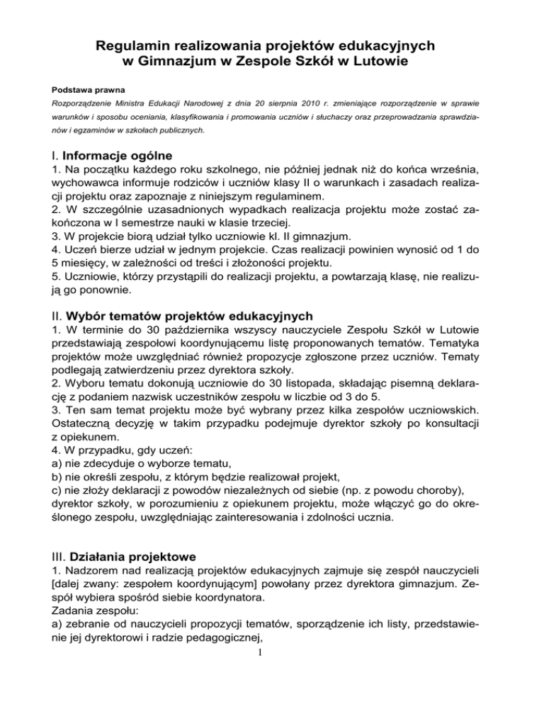 Regulamin realizowania projektów edukacyjnych w Gimnazjum w Zespole Szkół w Lutowie Podstawa prawna Rozporządzenie Ministra Edukacji Narodowej z dnia 20 sierpnia 2010 r. zmieniające rozporządzenie w sprawie warunków i sposobu oceniania, klasyfikowania i promowania uczniów i słuchaczy oraz przeprowadzania sprawdzianów i egzaminów w szkołach publicznych. I. Informacje ogólne 1. Na początku każdego roku szkolnego, nie później jednak niż do końca września, wychowawca informuje rodziców i uczniów klasy II o warunkach i zasadach realizacji projektu oraz zapoznaje z niniejszym regulaminem. 2. W szczególnie uzasadnionych wypadkach realizacja projektu może zostać zakończona w I semestrze nauki w klasie trzeciej. 3. W projekcie biorą udział tylko uczniowie kl. II gimnazjum. 4. Uczeń bierze udział w jednym projekcie. Czas realizacji powinien wynosić od 1 do 5 miesięcy, w zależności od treści i złożoności projektu. 5. Uczniowie, którzy przystąpili do realizacji projektu, a powtarzają klasę, nie realizują go ponownie. II. Wybór tematów projektów edukacyjnych 1. W terminie do 30 października wszyscy nauczyciele Zespołu Szkół w Lutowie przedstawiają zespołowi koordynującemu listę proponowanych tematów. Tematyka projektów może uwzględniać również propozycje zgłoszone przez uczniów. Tematy podlegają zatwierdzeniu przez dyrektora szkoły. 2. Wyboru tematu dokonują uczniowie do 30 listopada, składając pisemną deklarację z podaniem nazwisk uczestników zespołu w liczbie od 3 do 5. 3. Ten sam temat projektu może być wybrany przez kilka zespołów uczniowskich. Ostateczną decyzję w takim przypadku podejmuje dyrektor szkoły po konsultacji z opiekunem. 4. W przypadku, gdy uczeń: a) nie zdecyduje o wyborze tematu, b) nie określi zespołu, z którym będzie realizował projekt, c) nie złoży deklaracji z powodów niezależnych od siebie (np. z powodu choroby), dyrektor szkoły, w porozumieniu z opiekunem projektu, może włączyć go do określonego zespołu, uwzględniając zainteresowania i zdolności ucznia. III. Działania projektowe 1. Nadzorem nad realizacją projektów edukacyjnych zajmuje się zespół nauczycieli [dalej zwany: zespołem koordynującym] powołany przez dyrektora gimnazjum. Zespół wybiera spośród siebie koordynatora. Zadania zespołu: a) zebranie od nauczycieli propozycji tematów, sporządzenie ich listy, przedstawienie jej dyrektorowi i radzie pedagogicznej, 1 b) przygotowanie harmonogramu pracy na dany rok szkolny, c) monitorowanie stanu realizacji projektów, d) nadzór nad dokumentacją projektów, e) organizacja publicznej prezentacji projektów, f) podsumowanie realizacji projektów i przedstawienie sprawozdania. 2. Zadania wychowawcy: a) prowadzenie działań organizacyjnych związanych z realizacją projektu przez uczniów, w szczególności: • wyboru tematu i grupy projektowej przez każdego ucznia klasy, • monitorowania udziału uczniów w pracach zespołu poprzez kontakt z opiekunem zespołu, • przekazywania informacji o wynikach monitorowania rodzicom; b) dokonywanie zapisów dotyczących realizacji przez ucznia projektu edukacyjnego w dokumentacji wychowawcy, w tym związanych z oceną z zachowania; c) sporządzenie listy z informacją o zrealizowaniu projektu edukacyjnego w danym roku szkolnym (uczniowie, tematy projektów, nauczyciele odpowiedzialni za projekty). 3. Zadania opiekuna projektu: a) przygotowanie kontraktu (załącznik nr 2) i podpisanie go wraz z uczniami; b) monitorowanie pracy uczniów oraz udzielanie wskazówek i pomocy na każdym etapie realizacji projektu; c) komunikacja z wychowawcą ucznia nt. jego udziału w projekcie; d) koordynowanie pracy nauczycieli w przypadku, kiedy projekt edukacyjny jest międzyprzedmiotowy; e) ocena projektu we współpracy z innymi nauczycielami; f) pomoc w prezentacji projektu. IV. Ocena projektu 1. Projekt edukacyjny oceniany jest w postaci procentowej zgodnie z kryteriami i wg karty oceny (załącznik nr 3), odrębnie dla każdego ucznia uczestniczącego w projekcie. 2. Ocena jest ustalana przez opiekuna projektu przy udziale komisji ds. projektu edukacyjnego (dyrektor, wychowawca, zespół koordynujący). Dokonanie oceny jest podstawą do zapisu o udziale ucznia w realizacji projektu edukacyjnego na świadectwie ukończenia gimnazjum. 3. Ocena z projektu, jako ocena cząstkowa w II semestrze klasy II gimnazjum z jednego lub więcej przedmiotów (przy projektach międzyprzedmiotowych), jest ustalana przez opiekuna projektu na podstawie wyniku procentowego zgodnie z WSO (roz. I, p. 2). Opiekun projektu w uzasadnionych dydaktycznie wypadkach może odstąpić od wystawiania ocen przedmiotowych. 4. Opiekun projektu przedstawia wychowawcy klasy informację o realizacji projektu 2 i oceny poszczególnych uczniów. Wychowawca uwzględnia powyższe informacje przy ustalaniu oceny z zachowania w klasie II gimnazjum, zgodnie z ustaleniami WSO. 5. Uczniowie wraz z nauczycielami dokonują ewaluacji swojej pracy, na którą składać się powinna informacja o: - osiągniętych celach, - mocnych i słabych stronach, - popełnionych błędach i sposobach ich wyeliminowania. V. Prezentacja i dokumentacja projektu 1. Zakończeniem projektu jest publiczna prezentacja, której forma jest zaakceptowana przez opiekuna zespołu oraz komisję ds. projektu edukacyjnego (dyrektor, wychowawca, zespół koordynujący). 2. Prezentacje odbywają się w wyznaczonym dniu (Dzień Szkolnych Projektów), a jeśli nie ma możliwości zaprezentowania wszystkich projektów, w innym terminie wyznaczonym przez dyrektora. 3. W przypadku projektu realizowanego jako przedsięwzięcie jego prezentacja następuje zgodnie z ustalonym planem przyjętym w projekcie. 4. W zależności od tematyki projektu w prezentacjach jako obserwatorzy mogą uczestniczyć: a) uczniowie gimnazjum, b) rodzice uczniów, c) przedstawiciele instytucji, organizacji i władz samorządowych, d) inne osoby