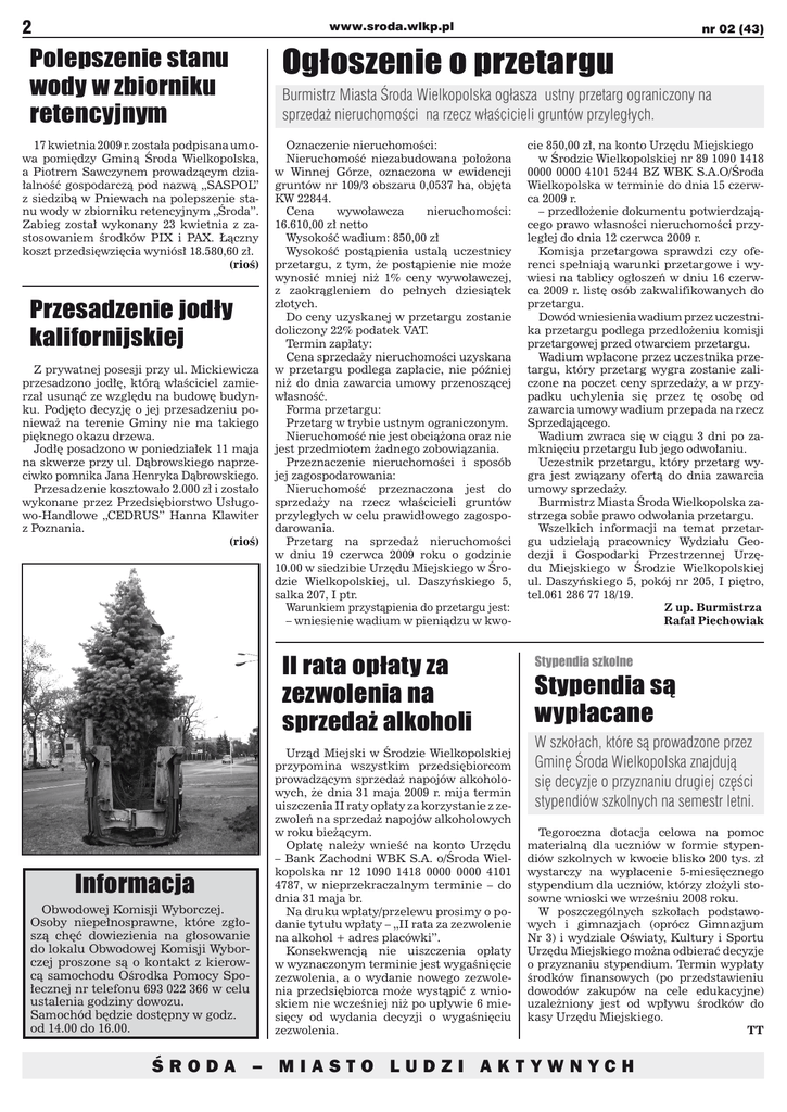 www.sroda.wlkp.pl Polepszenie stanu wody w zbiorniku retencyjnym 17 kwietnia 2009 r. została podpisana umowa pomiędzy Gminą Środa Wielkopolska, a Piotrem Sawczynem prowadzącym działalność gospodarczą pod nazwą „SASPOL” z siedzibą w Pniewach na polepszenie stanu wody w zbiorniku retencyjnym „Środa”. Zabieg został wykonany 23 kwietnia z zastosowaniem środków PIX i PAX. Łączny koszt przedsięwzięcia wyniósł 18.580,60 zł. (rioś) Przesadzenie jodły kalifornijskiej Z prywatnej posesji przy ul. Mickiewicza przesadzono jodłę, którą właściciel zamierzał usunąć ze względu na budowę budynku. Podjęto decyzję o jej przesadzeniu ponieważ na terenie Gminy nie ma takiego pięknego okazu drzewa. Jodłę posadzono w poniedziałek 11 maja na skwerze przy ul. Dąbrowskiego naprzeciwko pomnika Jana Henryka Dąbrowskiego. Przesadzenie kosztowało 2.000 zł i zostało wykonane przez Przedsiębiorstwo Usługowo-Handlowe „CEDRUS” Hanna Klawiter z Poznania. (rioś) Ogłoszenie o przetargu Burmistrz Miasta Środa Wielkopolska ogłasza ustny przetarg ograniczony na sprzedaż nieruchomości na rzecz właścicieli gruntów przyległych. Oznaczenie nieruchomości: Nieruchomość niezabudowana położona w Winnej Górze, oznaczona w ewidencji gruntów nr 109/3 obszaru 0,0537 ha, objęta KW 22844. Cena wywoławcza nieruchomości: 16.610,00 zł netto Wysokość wadium: 850,00 zł Wysokość postąpienia ustalą uczestnicy przetargu, z tym, że postąpienie nie może wynosić mniej niż 1% ceny wywoławczej, z zaokrągleniem do pełnych dziesiątek złotych. Do ceny uzyskanej w przetargu zostanie doliczony 22% podatek VAT. Termin zapłaty: Cena sprzedaży nieruchomości uzyskana w przetargu podlega zapłacie, nie później niż do dnia zawarcia umowy przenoszącej własność. Forma przetargu: Przetarg w trybie ustnym ograniczonym. Nieruchomość nie jest obciążona oraz nie jest przedmiotem żadnego zobowiązania. Przeznaczenie nieruchomości i sposób jej zagospodarowania: Nieruchomość przeznaczona jest do sprzedaży na rzecz właścicieli gruntów przyległych w celu prawidłowego zagospodarowania. Przetarg na sprzedaż nieruchomości w dniu 19 czerwca 2009 roku o godzinie 10.00 w siedzibie Urzędu Miejskiego w Środzie Wielkopolskiej, ul. Daszyńskiego 5, salka 207, I ptr. Warunkiem przystąpienia do przetargu jest: – wniesienie wadium w pieniądzu w kwo- II rata opłaty za zezwolenia na sprzedaż alkoholi Informacja Obwodowej Komisji Wyborczej. Osoby niepełnosprawne, które zgłoszą chęć dowiezienia na głosowanie do lokalu Obwodowej Komisji Wyborczej proszone są o kontakt z kierowcą samochodu Ośrodka Pomocy Społecznej nr telefonu 693 022 366 w celu ustalenia godziny dowozu. Samochód będzie dostępny w godz. od 14.00 do 16.00. nr 02 (43) Urząd Miejski w Środzie Wielkopolskiej przypomina wszystkim przedsiębiorcom prowadzącym sprzedaż napojów alkoholowych, że dnia 31 maja 2009 r. mija termin uiszczenia II raty opłaty za korzystanie z zezwoleń na sprzedaż napojów alkoholowych w roku bieżącym. Opłatę należy wnieść na konto Urzędu – Bank Zachodni WBK S.A. o/Środa Wielkopolska nr 12 1090 1418 0000 0000 4101 4787, w nieprzekraczalnym terminie – do dnia 31 maja br. Na druku wpłaty/przelewu prosimy o podanie tytułu wpłaty – „II rata za zezwolenie na alkohol + adres placówki”. Konsekwencją nie uiszczenia opłaty w wyznaczonym terminie jest wygaśnięcie zezwolenia, a o wydanie nowego zezwolenia przedsiębiorca może wystąpić z wnioskiem nie wcześniej niż po upływie 6 miesięcy od wydania decyzji o wygaśnięciu zezwolenia. cie 850,00 zł, na konto Urzędu Miejskiego w Środzie Wielkopolskiej nr 89 1090 1418 0000 0000 4101 5244 BZ WBK S.A.O/Środa Wielkopolska w terminie do dnia 15 czerwca 2009 r. – przedłożenie dokumentu potwierdzającego prawo własności nieruchomości przyległej do dnia 12 czerwca 2009 r. Komisja przetargowa sprawdzi czy oferenci spełniają warunki przetargowe i wywiesi na tablicy ogłoszeń w dniu 16 czerwca 2009 r. listę osób zakwalifikowanych do przetargu. Dowód wniesienia wadium przez uczestnika przetargu podlega przedłożeniu komisji przetargowej przed otwarciem przetargu. Wadium wpłacone przez uczestnika przetargu, który przetarg wygra zostanie zaliczone na poczet ceny sprzedaży, a w przypadku uchylenia się przez tę osobę od zawarcia umowy wadium przepada na rzecz Sprzedającego. Wadium zwraca się w ciągu 3 dni po zamknięciu przetargu lub jego odwołaniu. Uczestnik przetargu, który przetarg wygra jest związany ofertą do dnia zawarcia umowy sprzedaży. Burmistrz Miasta Środa Wielkopolska zastrzega sobie prawo odwołania przetargu. Wszelkich informacji na temat przetargu udzielają pracownicy Wydziału Geodezji i Gospodarki Przestrzennej Urzędu Miejskiego w Środzie Wielkopolskiej ul. Daszyńskiego 5, pokój nr 205, I piętro, tel.061 286 77 18/19. Z up. Burmistrza Rafał Piechowiak Stypendia szkolne Stypendia są wypłacane W szkołach, które są prowadzone przez Gminę Środa Wielkopolska znajdują się decyzje o przyznaniu drugiej części stypendiów szkolnych na semestr letni. Tegoroczna dotacja celowa na pomoc materialną dla uczniów w formie stypendiów szkolnych w kwocie blisko 200 tys. zł wystarczy na wypłacenie 5-miesięcznego stypendium dla uczniów, którzy złożyli stosowne wnioski we wrześniu 2008 roku. W poszczególnych szkołach podstawowych i gimnazjach (oprócz Gimnazjum Nr 3) i wydziale Oświaty, Kultury i Sportu Urzędu Miejskiego można odbierać decyzje o przyznaniu stypendium. Termin wypłaty środków finansowych (po przedstawieniu dowodów zakupów na cele edukacyjne) uzależniony jest od wpływu środków do kasy Urzędu Miejskiego. TT ŚRODA – MIASTO LUDZI AKTYWNYCH www.sroda.wlkp.pl maj 2009 r. Szczepienie kasztanowców Na terenie naszej gminy zaszczepiono 452 kasztanowce przez Przedsiębiorstwo Usługowo-Handlowe „CEDRUS” Hanna Klawiter 
