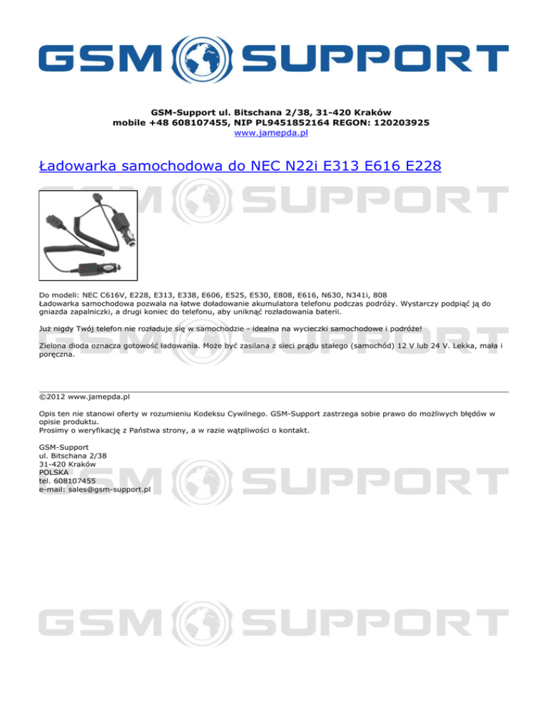 GSM-Support ul. Bitschana 2/38, 31-420 Kraków mobile +48 608107455, NIP PL9451852164 REGON: 120203925 www.jamepda.pl Ładowarka samochodowa do NEC N22i E313 E616 E228 Do modeli: NEC C616V, E228, E313, E338, E606, E525, E530, E808, E616, N630, N341i, 808 Ładowarka samochodowa pozwala na łatwe doładowanie akumulatora telefonu podczas podróży. Wystarczy podpiąć ją do gniazda zapalniczki, a drugi koniec do telefonu, aby uniknąć rozładowania baterii. Już nigdy Twój telefon nie rozładuje się w samochodzie - idealna na wycieczki samochodowe i podróże! Zielona dioda oznacza gotowość ładowania. Może być zasilana z sieci prądu stałego (samochód) 12 V lub 24 V. Lekka, mała i poręczna. ©2012 www.jamepda.pl Opis ten nie stanowi oferty w rozumieniu Kodeksu Cywilnego. GSM-Support zastrzega sobie prawo do możliwych błędów w opisie produktu. Prosimy o weryfikację z Państwa strony, a w razie wątpliwości o kontakt. GSM-Support ul. Bitschana 2/38 31-420 Kraków POLSKA tel. 608107455 e-mail: [email protected] Powered by TCPDF (www.tcpdf.org)