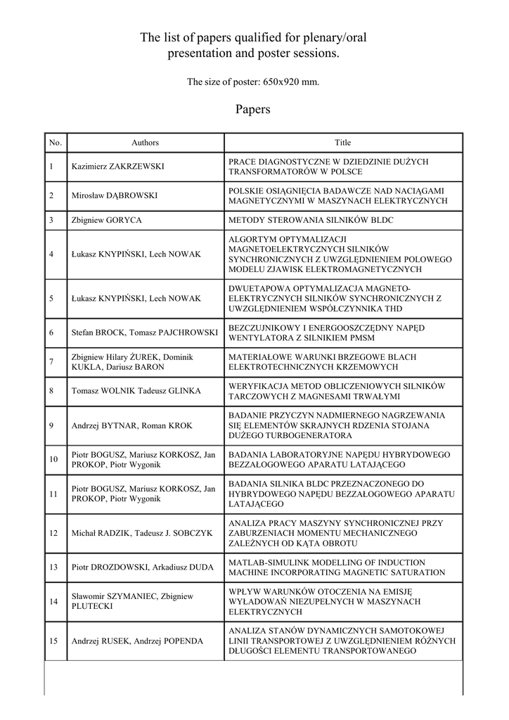 The list of papers qualified for plenary/oral presentation and poster sessions. The size of poster: 650x920 mm. Papers No. Authors Title 1 Kazimierz ZAKRZEWSKI PRACE DIAGNOSTYCZNE W DZIEDZINIE DUŻYCH TRANSFORMATORÓW W POLSCE 2 Mirosław DĄBROWSKI POLSKIE OSIĄGNIĘCIA BADAWCZE NAD NACIĄGAMI MAGNETYCZNYMI W MASZYNACH ELEKTRYCZNYCH 3 Zbigniew GORYCA METODY STEROWANIA SILNIKÓW BLDC 4 Łukasz KNYPIŃSKI, Lech NOWAK ALGORTYM OPTYMALIZACJI MAGNETOELEKTRYCZNYCH SILNIKÓW SYNCHRONICZNYCH Z UWZGLĘDNIENIEM POLOWEGO MODELU ZJAWISK ELEKTROMAGNETYCZNYCH 5 Łukasz KNYPIŃSKI, Lech NOWAK DWUETAPOWA OPTYMALIZACJA MAGNETOELEKTRYCZNYCH SILNIKÓW SYNCHRONICZNYCH Z UWZGLĘDNIENIEM WSPÓŁCZYNNIKA THD 6 Stefan BROCK, Tomasz PAJCHROWSKI BEZCZUJNIKOWY I ENERGOOSZCZĘDNY NAPĘD WENTYLATORA Z SILNIKIEM PMSM 7 Zbigniew Hilary ŻUREK, Dominik KUKLA, Dariusz BARON MATERIAŁOWE WARUNKI BRZEGOWE BLACH ELEKTROTECHNICZNYCH KRZEMOWYCH 8 Tomasz WOLNIK Tadeusz GLINKA WERYFIKACJA METOD OBLICZENIOWYCH SILNIKÓW TARCZOWYCH Z MAGNESAMI TRWAŁYMI 9 Andrzej BYTNAR, Roman KROK BADANIE PRZYCZYN NADMIERNEGO NAGRZEWANIA SIĘ ELEMENTÓW SKRAJNYCH RDZENIA STOJANA DUŻEGO TURBOGENERATORA 10 Piotr BOGUSZ, Mariusz KORKOSZ, Jan PROKOP, Piotr Wygonik BADANIA LABORATORYJNE NAPĘDU HYBRYDOWEGO BEZZAŁOGOWEGO APARATU LATAJĄCEGO 11 Piotr BOGUSZ, Mariusz KORKOSZ, Jan PROKOP, Piotr Wygonik BADANIA SILNIKA BLDC PRZEZNACZONEGO DO HYBRYDOWEGO NAPĘDU BEZZAŁOGOWEGO APARATU LATAJĄCEGO 12 Michał RADZIK, Tadeusz J. SOBCZYK ANALIZA PRACY MASZYNY SYNCHRONICZNEJ PRZY ZABURZENIACH MOMENTU MECHANICZNEGO ZALEŻNYCH OD KĄTA OBROTU 13 Piotr DROZDOWSKI, Arkadiusz DUDA MATLAB-SIMULINK MODELLING OF INDUCTION MACHINE INCORPORATING MAGNETIC SATURATION 14 Sławomir SZYMANIEC, Zbigniew PLUTECKI WPŁYW WARUNKÓW OTOCZENIA NA EMISJĘ WYŁADOWAŃ NIEZUPEŁNYCH W MASZYNACH ELEKTRYCZNYCH 15 Andrzej RUSEK, Andrzej POPENDA ANALIZA STANÓW DYNAMICZNYCH SAMOTOKOWEJ LINII TRANSPORTOWEJ Z UWZGLĘDNIENIEM RÓŻNYCH DŁUGOŚCI ELEMENTU TRANSPORTOWANEGO Wojciech URBAŃSKI AKTUALNE ZAGADNIENIA NAUCZANIA MASZYN ELEKTRYCZNYCH ZGODNIE Z PROCESEM BOLOŃSKIM ORAZ KRAJOWYMI RAMAMI KWALIFIKACJI 17 Andrzej WILK IMPLEMENTACJA MODELU HISTEREZY PREISACHA ZE SPRZĘŻENIEM ZWROTNYM DO MODELOWANIA HISTEREZY MAGNETYCZNEJ RDZENIA TRANSFORMATORA ZWIJANEGO Z BLACHY 18 Jean-Francois ROUCHON, Dominque HARRIBEY, Duc-Hoan TRAN Roland RYNDZIONEK, Łukasz SIENKIEWICZ, Mieczysław RONKOWSKI 16 HYBRID PIEZOELECTRIC MOTOR BASED ON ELECTROACTIVE LUBRICATION PRINCIPLE 19 Olgierd MAŁYSZKO, Ryszard PAŁKA, Sebastian SZKOLNY ANALIZA STANÓW DYNAMICZNYCH MASZYNY ELEKTRYCZNEJ Z REGULACJĄ STRUMIENIA MAGNESÓW TRWAŁYCH DO NAPĘDU SAMOCHODÓW 20 Adrian MŁOT, Mariusz KORKOSZ, Marian ŁUKANISZYN ANALIZA BEZŻŁOBKOWEGO 3-FAZOWEGO GENERATORA TARCZOWEGO DLA MAŁEJ PRZYDOMOWEJ ELEKTROWNI WIATROWEJ 21 Wolf-Rüdiger CANDERS, Hardo MAY, Ryszard PAŁKA, Piotr PAPLICKI, Sebastian SZKOLNY MODEL OBWODOWY MASZYNY ELEKTRYCZNEJ Z REGULACJĄ STRUMIENIA MAGNESÓW TRWAŁYCH DO NAPĘDU SAMOCHODÓW 22 Maciej GWOŹDZIEWICZ, Jan ZAWILAK INFLUENCE OF THE PERMANENT MAGNETS ARRANGEMENT ON THE SINGLE-PHASE LINE START PERMANENT MAGNET SYNCHRONOUS MOTOR PERFORMANCES 23 Marcin PAWLAK ZDALNY SYSTEM POMIAROWY SILNIKA INDUKCYJNEGO DLA URZĄDZEŃ PRZENOŚNYCH Z SYSTEMEM ANDROID 24 Wieslaw JAŻDŻYNSKI, Martin BAJEK A COMPARISON OF OPERATION PROPERTIES OF A HIGH-EFFICIENCY SQUIRREL-CAGE INDUCTION MOTOR AND LSPMSM 25 Andrzej SIKORA, Adam ZIELONKA STANOWISKO DO BADANIA SILNIKA BLDC Z MOŻLIWOŚCIĄ ZADANIA PRĘDKOŚCI I MOMENTU OBCIĄŻENIA 26 Marcin WOLKIEWICZ, Czesław T. KOWALSKI ZASTOSOWANIE SIECI NEURONOWYCH DO WYKRYWANIA I LOKALIZACJI ZWARĆ ZWOJOWYCH SILNIKA INDUKCYJNEGO ZASILANEGO Z PRZEKSZTAŁTNIKA CZĘSTOTLIWOŚCI Poster sessions No. Authors Title 1 Masen AL NAHLAOUI, Hendrik STEINS, Stefan KULIG, Sven Exnowski COMPARISON OF NUMERICALLY DETERMINED NOISE OF A 290 KW INDUCTION MOTOR USING FEM AND MEASURED ACOUSTIC RADIATION 2 Petr ORSAG, Stanislav KOCMAN, Pavel SVOBODA THE INFLUENCE OF POWER QUALITY OF THE MAINS ON OPERATION CHARACTERISTICS OF AN UNCONTROLLED AND CONTROLLED INDUCTION MOTOR 3 Ján KAŇUCH, Želmíra FERKOVÁ DESIGN AND ELECTROMAGNETIC FIELD SIMULATION OF DISK STEPPER MOTOR WITH PERMANENT MAGNETS 4 Konrad DĄBAŁA, Andrzej RUDEŃSKI SILNIK MAGNETOELEKTRYCZNY TARCZOWY Z TWORNIKIEM BEZ RDZENIA FERROMAGNETYCZNEGO 5 Zdzisław KRZEMIEŃ PRACA RÓWNOLEGŁA PRĄDNIC SYNCHRONICZNYCH WZBUDZANYCH MAGNESAMI TRWAŁYMI 6 Henryk BANACH MODERNIZACJA UKŁADU WENTYLACYJNEGO MASZYN ELEKTRYCZNYCH JAKO ŚRODEK DO OGRANICZANIA EMISJI HAŁASU 7 Mariusz BARAŃSKI, Wojciech SZELĄG, Cezary JĘDRYCZKA, Jacek MIKOŁAJEWICZ ANALIZA SILNIKA SYNCHRONICZNEGO O ROZRUCHU BEZPOŚREDNIM I MAGNESACH W WIRNIKU ROZŁOŻONYCH W KSZTAŁCIE LITERY U 8 Cezary JĘDRYCZKA, Wiesław ŁYSKAWIŃSKI, Jacek MIKOŁAJEWICZ, Rafał WOJCIECHOWSKI ANALIZA STRUKTUR MAGNETOELEKTRYCZNYCH SILNIKÓW SYNCHRONICZNYCH O ROZRUCHU CZĘSTOTLIWOŚCIOWYM. MODELOWANIE 9 Cezary JĘDRYCZKA, Wiesław ŁYSKAWIŃSKI, Jacek MIKOŁAJEWICZ, Rafał WOJCIECHOWSKI ANALIZA STRUKTUR MAGNETOELEKTRYCZNYCH SILNIKÓW SYNCHRONICZNYCH O ROZRUCHU CZĘSTOTLIWOŚCIOWYM. OBLICZENIA 10 Paweł IDZIAK, Krzysztof KOWALSKI NUMERYCZNE MODELOWANIE WPŁYWU ASYMETRII PRZEPŁYWU UZWOJEŃ KOMPENSACYJNYCH NA PRZEBIEG KOMUTACJI 11 Marcin NOWAK, Wojciech PIETROWSKI, Stanisław RAWICKI UDOSKONALONY DOBÓR POJEMNOŚCI KONDENSATORA PRZY PRACY JEDNOFAZOWEJ SILNIKA INDUKCYJNEGO Z TRÓJFAZOWYM UZWOJENIEM STOJANA 12 Wojciech PIETROWSKI FIELD-CIRCUIT ANALYSIS OF AC MACHINE TAKING INTO ACCOUNT STATOR WINDING ASYMMETRY 13 Andrzej BOBOŃ, Stefan PASZEK, Marian PASKO, Piotr PRUSKI, Maria BOJARSKA PORÓWNANIE WYNIKÓW ESTYMACJI PARAMETRÓW RÓŻNYCH MODELI GENERATORÓW SYNCHRONICZNYCH UZYSKANYCH NA PODSTAWIE TESTÓW POMIAROWYCH 14 Tadeusz GLINKA, Bronisław DRAK MOCOWANIE CHORĄGIEWEK W SILNIKACH PRĄDU STAŁEGO DUŻEJ MOCY 15 Adrian NOCOŃ, Dominik SZUSTER BADANIA SYMULACYJNE STANÓW PRZEJŚCIOWYCH GENERATORÓW ŹRÓDEŁ ROZPROS
