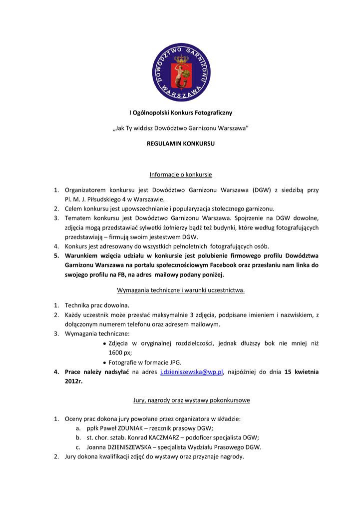 I Ogólnopolski Konkurs Fotograficzny „Jak Ty widzisz Dowództwo Garnizonu Warszawa” REGULAMIN KONKURSU Informacje o konkursie 1. Organizatorem konkursu jest Dowództwo Garnizonu Warszawa (DGW) z siedzibą przy Pl. M. J. Piłsudskiego 4 w Warszawie. 2. Celem konkursu jest upowszechnianie i popularyzacja stołecznego garnizonu. 3. Tematem konkursu jest Dowództwo Garnizonu Warszawa. Spojrzenie na DGW dowolne, zdjęcia mogą przedstawiad sylwetki żołnierzy bądź też budynki, które według fotografujących przedstawiają – firmują swoim jestestwem DGW. 4. Konkurs jest adresowany do wszystkich pełnoletnich fotografujących osób. 5. Warunkiem wzięcia udziału w konkursie jest polubienie firmowego profilu Dowództwa Garnizonu Warszawa na portalu społecznościowym Facebook oraz przesłaniu nam linka do swojego profilu na FB, na adres mailowy podany poniżej. Wymagania techniczne i warunki uczestnictwa. 1. Technika prac dowolna. 2. Każdy uczestnik może przesład maksymalnie 3 zdjęcia, podpisane imieniem i nazwiskiem, z dołączonym numerem telefonu oraz adresem mailowym. 3. Wymagania techniczne: Zdjęcia w oryginalnej rozdzielczości, jednak dłuższy bok nie mniej niż 1600 px; Fotografie w formacie JPG. 4. Prace należy nadsyład na adres [email protected], najpóźniej do dnia 15 kwietnia 2012r. Jury, nagrody oraz wystawy pokonkursowe 1. Oceny prac dokona jury powołane przez organizatora w składzie: a. ppłk Paweł ZDUNIAK – rzecznik prasowy DGW; b. st. chor. sztab. Konrad KACZMARZ – podoficer specjalista DGW; c. Joanna DZIENISZEWSKA – specjalista Wydziału Prasowego DGW. 2. Jury dokona kwalifikacji zdjęd do wystawy oraz przyznaje nagrody. 3. Posiedzenie jury odbędzie się 16 kwietnia 2012 r. 4. Jury zastrzega sobie prawo kwalifikacji wybranych fotografii do wystawy i nagrody. 5. Planowana główna nagroda to udział zwycięzcy w oficjalnych obchodach Święta Dowództwa Garnizonu Warszawa oraz wizyta w Dowództwie Garnizonu Warszawa – łącznie ze zwiedzaniem Sali Tradycji DGW oraz wnętrza Grobu Nieznanego Żołnierza. 6. Informacje o werdykcie zostaną rozesłane mailowo w dniu 16 kwietnia 2012 r. 7. Wystawa pokonkursowa zaprezentowana zostanie w oknach bocznych słynnego „Domu bez kantów” przy ul. Tokarzewskiego – Karaszewicza 4 w Warszawie, przy pomniku Marszałka Józefa Piłsudskiego. Postanowienia koocowe 1. Organizator konkursu zastrzega sobie prawo do bezpłatnej reprodukcji zdjęd w: katalogu, prasie, wystawie, internecie, mediach społecznościowych oraz w niekomercyjnych polach eksploatacji związanych z popularyzacją konkursu. 2. Zgłoszenie prac na konkurs uważane będzie za uznanie warunków regulaminu oraz wyrażenie zgody na publikowanie danych osobowych zgodnie z ustawą z dnia 28.08.1997 r. o ochronie danych osobowych (Dz. U. Nr 133 poz. 883). 3. Kontakt z koordynatorem: Joanna DZIENISZEWSKA, tel. (22) 687-91-02; e-mail: [email protected]