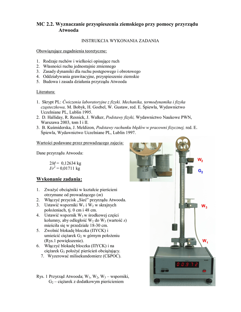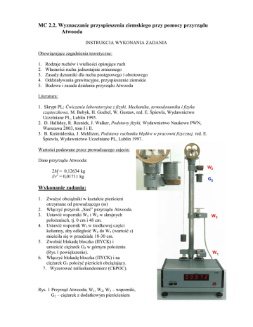 MC 2.2. Wyznaczanie przyspieszenia ziemskiego przy pomocy przyrządu Atwooda INSTRUKCJA WYKONANIA ZADANIA Obowiązujące zagadnienia teoretyczne: 1. 2. 3. 4. 5. Rodzaje ruchów i wielkości opisujące ruch Własności ruchu jednostajnie zmiennego Zasady dynamiki dla ruchu postępowego i obrotowego Oddziaływania grawitacyjne, przyspieszenie ziemskie Budowa i zasada działania przyrządu Atwooda Literatura: 1. Skrypt PL: Ćwiczenia laboratoryjne z fizyki. Mechanika, termodynamika i fizyka cząsteczkowa, M. Bobyk, H. Goebel, W. Gustaw, red. E. Śpiewla, Wydawnictwo Uczelniane PL, Lublin 1995. 2. D. Halliday, R. Resnick, J. Walker, Podstawy fizyki, Wydawnictwo Naukowe PWN, Warszawa 2003, tom I i II. 3. B. Kuśmiderska, J. Meldizon, Podstawy rachunku błędów w pracowni fizycznej, red. E. Śpiewla, Wydawnictwo Uczelniane PL, Lublin 1997. Wartości podawane przez prowadzącego zajęcia: Dane przyrządu Atwooda: 2M = 0,12634 kg I/r2 = 0,01711 kg Wykonanie zadania: 1. Zważyć obciążniki w kształcie pierścieni otrzymane od prowadzącego (m) 2. Włączyć przycisk „Sieć” przyrządu Atwooda. 3. Ustawić wsporniki W1 i W2 w skrajnych położeniach, tj. 0 cm i 48 cm. 4. Ustawić wspornik W3 w środkowej części kolumny, aby odległość W2 do W3 (wartość s) mieściła się w przedziale 18-30 cm. 5. Zwolnić blokadę bloczka (ΠYCK) i umieścić ciężarek G2 w górnym położeniu (Rys.1 powiększenie). 6. Włączyć blokadę bloczka (ΠYCK) i na ciężarek G2 położyć pierścień obciążający. 7. Wyzerować milisekundomierz (CБPOC). Rys. 1 Przyrząd Atwooda; W1, W2, W3 – wsporniki, G2 – ciężarek z dodatkowym pierścieniem 8. Zwolnić blokadę bloczka (ΠYCK). Przyrząd zmierzy czas ruchu ciężarka G2 pomiędzy wspornikami W3 i W1, w środku których znajdują sie fotokomórki. Jednocześnie na wsporniku W3 (Rys. 2) z ciężarka G2 zdjęty zostanie pierścień obciążający. Rys. 2 Wspornik W3 przyrządu Atwooda 9. Odczytać wskazania milisekundomierza. 10. Wyzerować milisekundomierz (CБPOC). 11. Pomiary powtórzyć 5-krotnie (dla danego s i m). 12. Zmieniając położenie wspornika W3, powtórzyć pomiary dla kilku wartości s z przedziału 18-30 cm - jak w pkt. 5-11. 13. Powtórzyć pomiary dla wcześniej wybranych wartości s dla pozostałych pierścieni obciążających. 14. Wyłączyć przyrząd Atwooda. 15. Wartość przyspieszenia ziemskiego wyznaczyć ze wzoru: I 2 r 2 s ' 2 2m s t ' 2M m g , (1) gdzie: m – masa pierścienia obciążającego, s’ – droga w ruchu jednostajnym (różnica położeń W3 i W1), s – droga w ruchu przyspieszonym (różnica położeń W2 i W3), t’ – czas ruchu jednostajnego. Niepewność wyznaczenia przyspieszenia ziemskiego należy oszacować metodą różniczkowania wzoru (1), przy czym wielkości M oraz I/r2 należy przyjąć za stałe. Za niepewność wyznaczenia masy pierścienia obciążającego m – przyjąć masę najmniejszego użytego odważnika, dróg s i s’ – 2 mm, czasu t’ – największe odchylenie od wartości średniej pomiarów czasu dla ustalonych wartości m, s, i s’. Uwaga: Jeśli prowadzący zajęcia zaleci wykonanie rachunku błędów metodą Gaussa, należy przy ustalonych wartościach m, s, i s’ zmierzyć czas t’ 30-krotnie. Autor instrukcji: Andrzej Dudziak