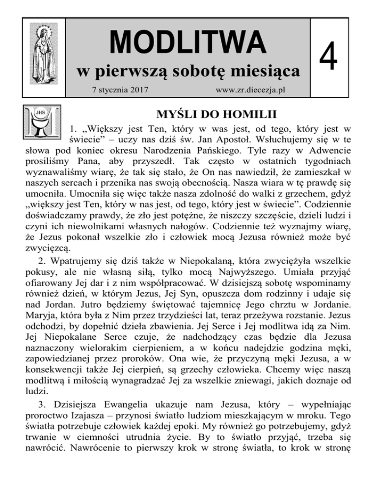 MODLITWA w pierwszą sobotę miesiąca 7 stycznia 2017 4 www.zr.diecezja.pl MYŚLI DO HOMILII 1. „Większy jest Ten, który w was jest, od tego, który jest w świecie” – uczy nas dziś św. Jan Apostoł. Wsłuchujemy się w te słowa pod koniec okresu Narodzenia Pańskiego. Tyle razy w Adwencie prosiliśmy Pana, aby przyszedł. Tak często w ostatnich tygodniach wyznawaliśmy wiarę, że tak się stało, że On nas nawiedził, że zamieszkał w naszych sercach i przenika nas swoją obecnością. Nasza wiara w tę prawdę się umocniła. Umocniła się więc także nasza zdolność do walki z grzechem, gdyż „większy jest Ten, który w nas jest, od tego, który jest w świecie”. Codziennie doświadczamy prawdy, że zło jest potężne, że niszczy szczęście, dzieli ludzi i czyni ich niewolnikami własnych nałogów. Codziennie też wyznajmy wiarę, że Jezus pokonał wszelkie zło i człowiek mocą Jezusa również może być zwycięzcą. 2. Wpatrujemy się dziś także w Niepokalaną, która zwyciężyła wszelkie pokusy, ale nie własną siłą, tylko mocą Najwyższego. Umiała przyjąć ofiarowany Jej dar i z nim współpracować. W dzisiejszą sobotę wspominamy również dzień, w którym Jezus, Jej Syn, opuszcza dom rodzinny i udaje się nad Jordan. Jutro będziemy świętować tajemnicę Jego chrztu w Jordanie. Maryja, która była z Nim przez trzydzieści lat, teraz przeżywa rozstanie. Jezus odchodzi, by dopełnić dzieła zbawienia. Jej Serce i Jej modlitwa idą za Nim. Jej Niepokalane Serce czuje, że nadchodzący czas będzie dla Jezusa naznaczony wielorakim cierpieniem, a w końcu nadejdzie godzina męki, zapowiedzianej przez proroków. Ona wie, że przyczyną męki Jezusa, a w konsekwencji także Jej cierpień, są grzechy człowieka. Chcemy więc naszą modlitwą i miłością wynagradzać Jej za wszelkie zniewagi, jakich doznaje od ludzi. 3. Dzisiejsza Ewangelia ukazuje nam Jezusa, który – wypełniając proroctwo Izajasza – przynosi światło ludziom mieszkającym w mroku. Tego światła potrzebuje człowiek każdej epoki. My również go potrzebujemy, gdyż trwanie w ciemności utrudnia życie. By to światło przyjąć, trzeba się nawrócić. Nawrócenie to pierwszy krok w stronę światła, to krok w stronę Jezusa. Niech Niepokalane Serce Maryi wyprasza nam łaskę szczerego nawrócenia. MEDYTACJA O TAJEMNICY RÓŻAŃCA W pierwszą sobotę stycznia pragniemy towarzyszyć Maryi adorującej Syna. Wsłuchajmy się słowa medytacji i modlitwy,by rozważyć je później w swoim sercu. (Śpiew na wystawienie Najświętszego Sakramentu). W: (Modlitwa Anioła z Fatimy): O Boże mój, wierzę w Ciebie, uwielbiam Ciebie,ufam Tobie i miłuję Ciebie.Proszę Cię o przebaczenie dla tych, którzy w Ciebie nie wierzą,Ciebie nie uwielbiają, nie ufają Tobie i Ciebie nie miłują. Trójco Przenajświętsza, Ojcze, Synu i Duchu Święty.W najgłębszej pokorze cześć Ci oddaję i ofiaruję TobiePrzenajdroższe Ciało i Krew, Duszę i Bóstwo Jezusa Chrystusa,obecnego na ołtarzach całego światajako wynagrodzenie za zniewagi,świętokradztwa i obojętność, którymi jest On obrażany.Przez nieskończone zasługi Jego Najświętszego Sercai przez przyczynę Niepokalanego Serca Maryi,proszę Cię o łaskę nawrócenia biednych grzeszników. P: Uwielbiamy Ciebie, Panie, obecny wśród nas w Przenajświętszej Hostii.Wielbimy Ciebie złożonego w betlejemskim żłóbku i adorowanego przez Maryję. Wpatrzeni w Jej Niepokalane Serce, odpowiadając na Jej wezwanie, pragniemywraz z Mędrcami «upaśćprzed Tobą,na twarz i oddaćCi pokłon». L1: Z Ewangelii według św. Mateusza: „Gdy zaś Jezus narodził się w Betlejem w Judei za panowania króla Heroda, oto Mędrcy ze Wschodu przybyli do Jerozolimy. A oto gwiazda, którą widzieli na Wschodzie, szła przed nimi, aż przyszła i zatrzymała się nad miejscem, gdzie było Dziecię. Gdy ujrzeli gwiazdę, bardzo się uradowali. Weszli do domu i zobaczyli Dziecię z Matką Jego, Maryją; upadli na twarz i oddali Mu pokłon. I otworzywszy swe skarby, ofiarowali Mu dary: złoto, kadzidło i mirręˮ (Mt 2,1.9-11). L2: Jeszcze trwa w naszych sercach wczorajsza Uroczystość Objawienia Pańskiego. Nadal wpatrujemy się w Mędrów i chcemy uczyć się od nich trudu wędrowania do Jezusa, radości spotkania z Dziecięciem, zatrzymania się przed Nim, adorowania Go i przeżywania głębokiej radości z obcowania z Nim. Bo, jak uczy nas św. Jan Paweł II, „chrześcijaństwo rodzi się i nieustannie odradza z tej właśnie kontemplacji chwały Bożej, jaśniejącej na obliczu Chrystusa” (Z homilii na zamknięcie Jubileuszu 2000 r.). L1: Z orędzia św. Jana Pawła II: „«Upadli na twarz i oddali Mu pokłon» (Mt 2,11). Jeśli w Dziecięciu, jakie Maryja tuli w swych ramionach, Mędrcy rozpoznają i wielbią Oczekiwanego przez narody i Zapowiadanego przez proroków, my dzisiaj możemy czcić Go w Eucharystii i rozpoznawać jako naszego Stwórcę, jedynego Pana i Zbawiciela”. L2: Z orędzia św. Jana Pawła II: „W betlejemskiej stajni dał się adorować Maryi, Józefowi i pasterzom w ubogiej postaci Nowonarodzonego Dziecięcia; w konsekrowanej Hostii adorujemy Go obecnego sakramentalnie w ciele i krwi, duszy i bóstwie, i dającego się nam jako pokarm na życie wieczne”. L1: Z papieskiego orędzia: „Mędrcy«Otworzywszy swe skarby, ofiarowali Mu dary: złoto, kadzidło i mirrę» (Mt 2,11). Dary, jakie Mędrcy składają Mesjaszowi symbolizują prawdziwe uwielbienie. Składając złoto, podkreślają Jego królewską boskość; kadzidłem wyznają, że jest On kapłanem nowego Przymierza; ofiarując mirrę, oddają cześć prorokowi, który przeleje swą krew, by pojednać ludzkość z Ojcem”. L2: Adorując Pana my również pragniemy ofiarować Mu złoto naszego istnienia, to znaczy wolność naśladowania Go z miłości, odpowiadając wiernie na Jego wołanie; pragniemy wznieść ku Niemu kadzidło naszej g