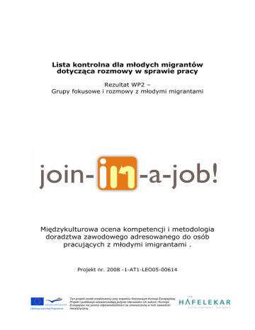 ych migrantów Rezultat WP2 – Grupy fok ymi migrantami doradztwa zawodowego adresowanego do osób . Projekt nr. 2008 -1-AT1-LEO05-00614 omisji Europejskiej. Lista kontrolna/wskazówki do rozmowy , cyjnych. Wskazuje ona Przygotowanie do rozmowy . Moje silne strony to: __________________________________________________ _________________________________________________________________ _________________________________________________________________ Wy :_________________________________________________________ kultur, : ____________________________________________ mi. 11.08.2009 do nowego kraju i nowych warunków planujesz . :_________________________________________________________ powierzone ci zadania. :_________________________________________________________ : __________________________________________________________ : ___________________________________________________________ ___________________________________________________________________ nowych rzeczy. Poprzyj to 11.08.2009 : __________________________________________________________ Przedstaw swoje CV twoje CV i omów w okresie od pierwszego kontaktu , To punktualnie. Upewnij o.k. G Data: _________________________________________________ Adres:_______________________________________________ Numer pokoju:___________________________________________ : ____________________________________ do firmy? Ile czasu to zajmuje? Transportem publicznym, samochodem czy na pieszo? ? 11.08.2009 Masz informacje na temat firmy? Potraf pytania? ? d? Co wiesz na temat tej profesji? Co wiesz o naszej firmie? Dlacze Jaki przedmiot szkolny lubisz? Cz Co robisz w czasie wolnym? Jakie cele 5 lat? Jakie pytania chc Osoba na ten temat. 11.08.2009 Czy dokumenty? 11.08.2009 Podczas rozmowy 1. (poprawnie), . 2. zadawaj pytania: np. itp. 3. 4. nie za szybko i nie za cicho! 5. 6. Nie przerywaj wypowiedzi pracodawcy! 7. Nie 8. informacji w tej sprawie? 9. Nie zapomnij Po rozmowie o osoby, która przeprowad wywiad i zapytaj o jej wynik. 11.08.2009